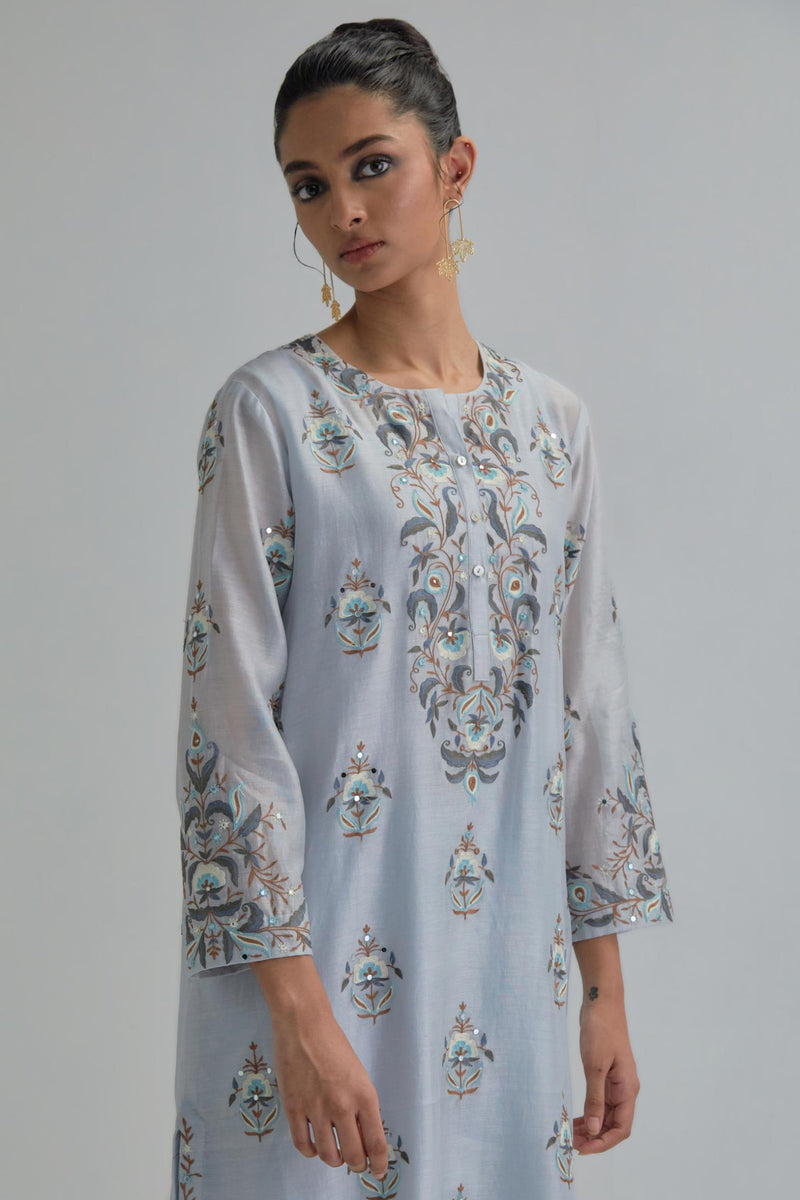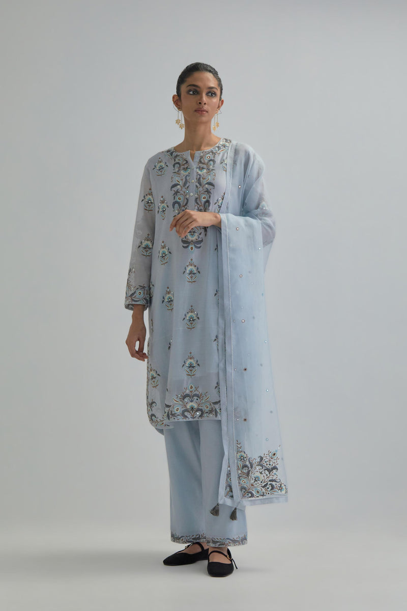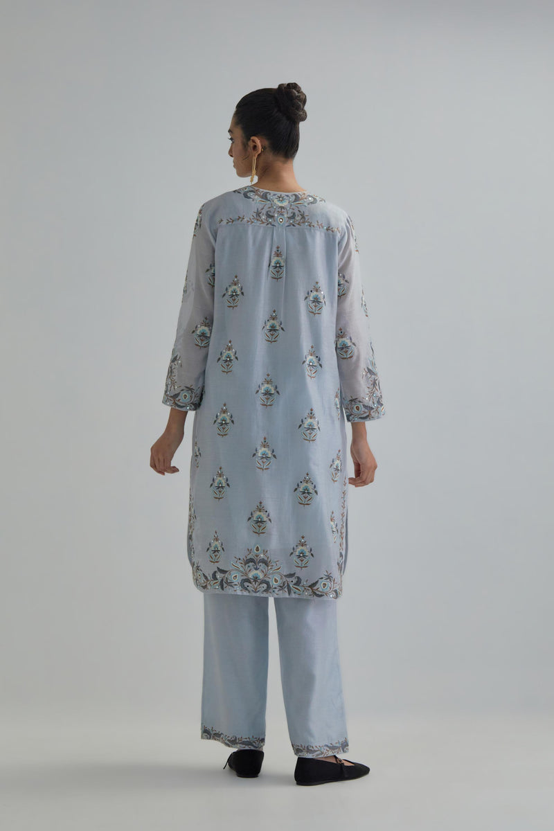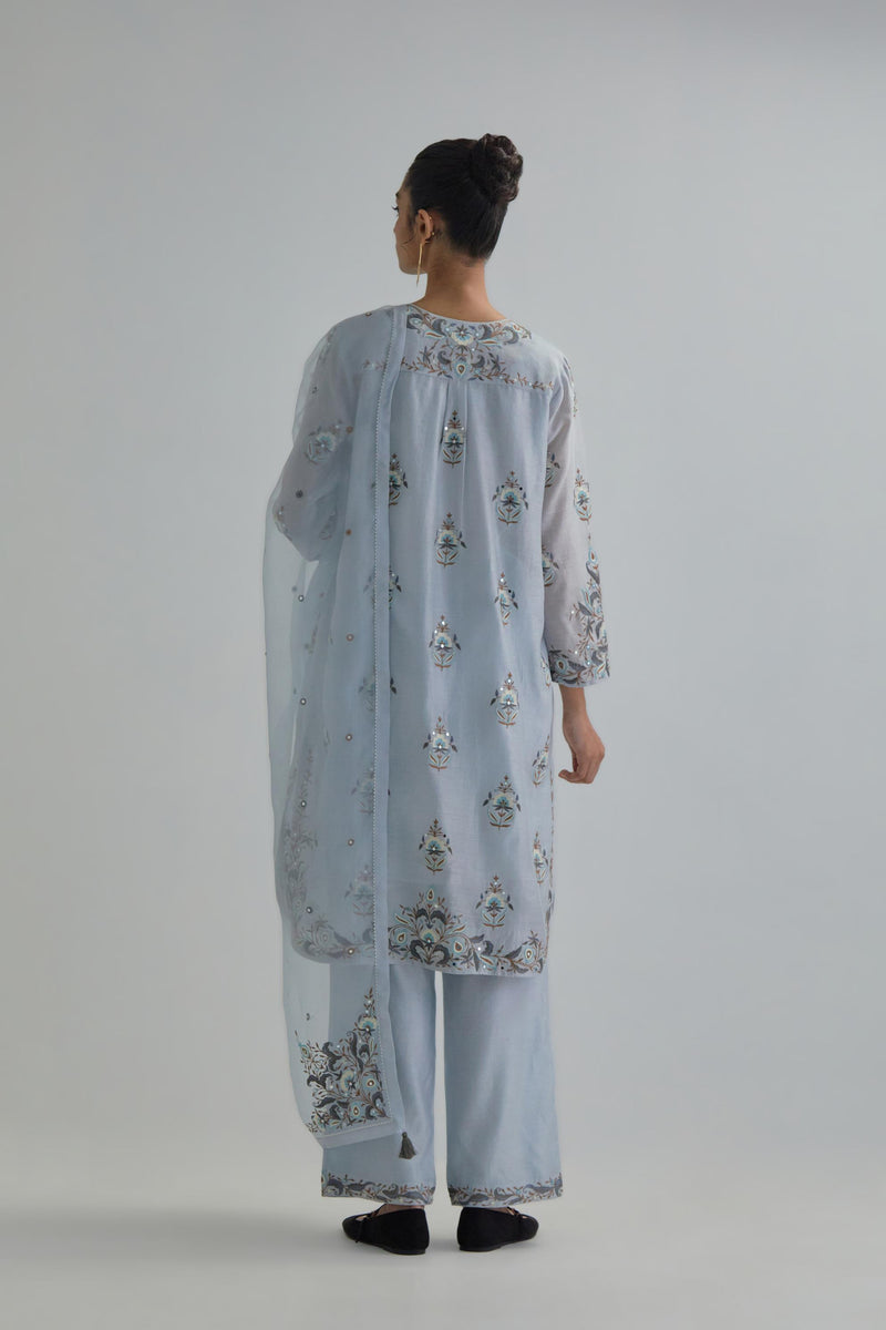 Blue silk Chanderi short kurta with all-over floral boota embroidery, highlighted with silver sequins. It has a round neckline with a button placket in the front, long sleeves and round hem. The kurta comes with fine cotton slip. Paired with Blue silk Chanderi straight pants with earthy coloured Aari work at hem. It has an elasticated back and drawstring in front for better fitting and side pockets. The garment is fully lined. Comes with Blue silk organza dupatta with Aari work at all four corners and small earthy coloured flower embroidery all-over the dupatta, highlighted with silver sequins and silk thread tassels at all four corners. Edges are finished with narrow Silk Chanderi border and ricrac.