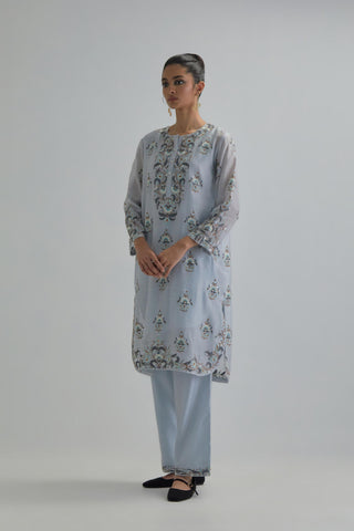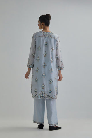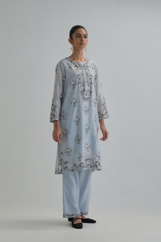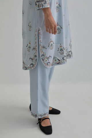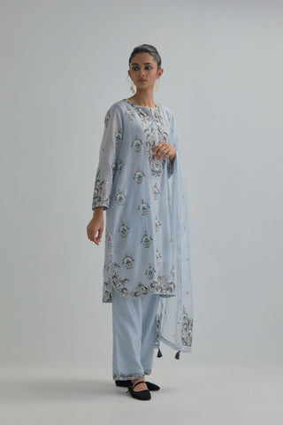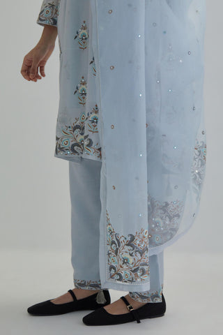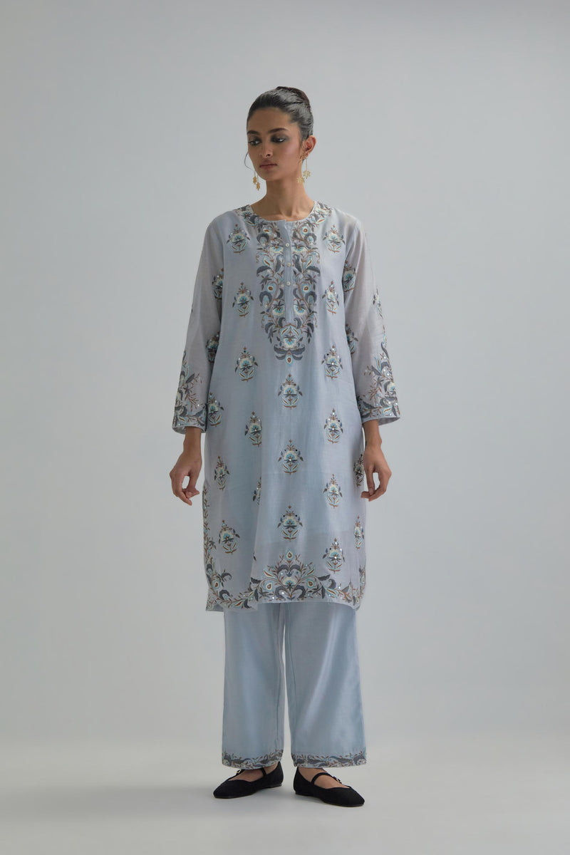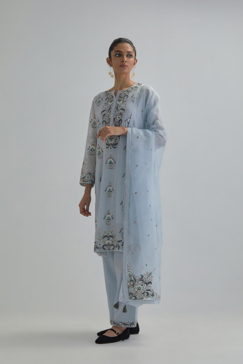 Blue silk Chanderi short kurta with all-over floral boota embroidery, highlighted with silver sequins. It has a round neckline with a button placket in the front, long sleeves and round hem. The kurta comes with fine cotton slip. Paired with Blue silk Chanderi straight pants with earthy coloured Aari work at hem. It has an elasticated back and drawstring in front for better fitting and side pockets. The garment is fully lined. Comes with Blue silk organza dupatta with Aari work at all four corners and small earthy coloured flower embroidery all-over the dupatta, highlighted with silver sequins and silk thread tassels at all four corners. Edges are finished with narrow Silk Chanderi border and ricrac.