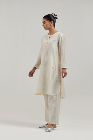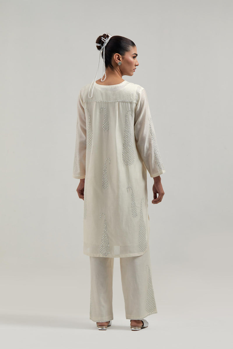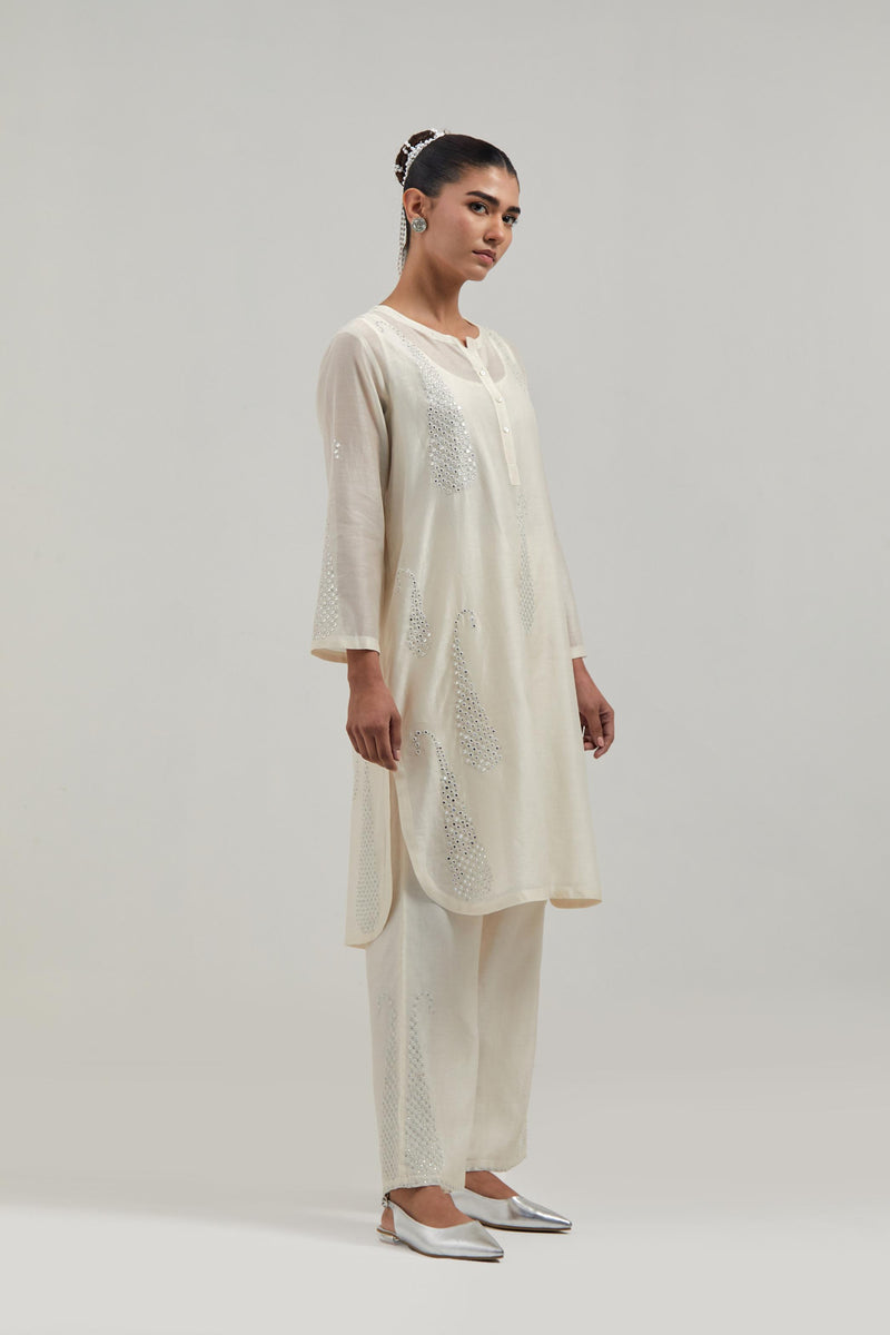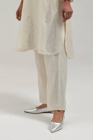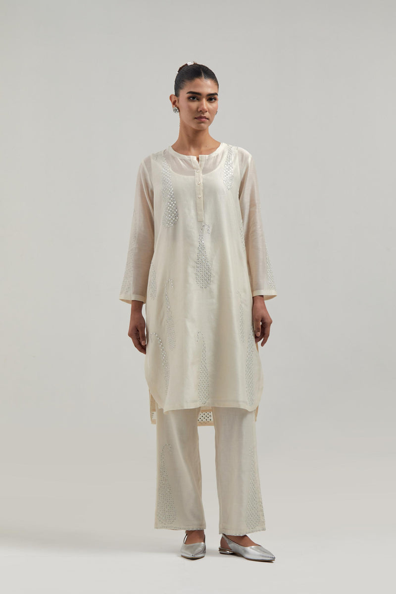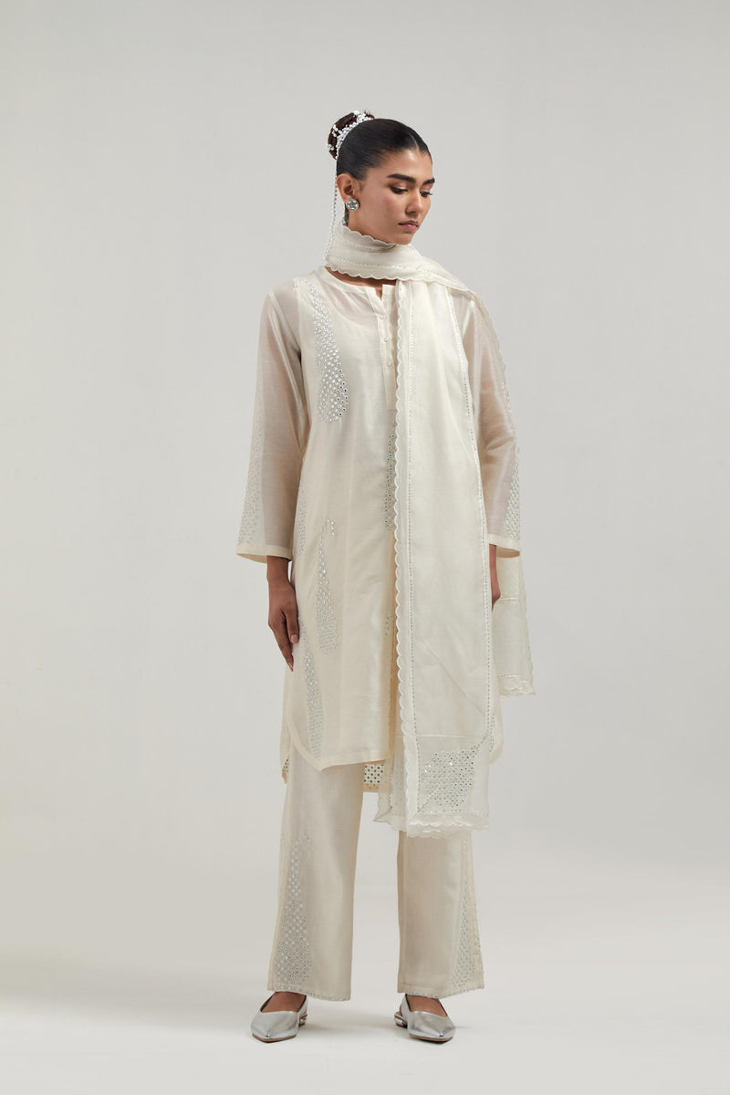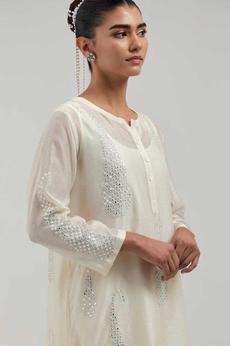 Off white Silk Chanderi short kurta with hand-embroidered paisley motifs with delicate mirror and sequins work all-over the kurta. It has a round neckline with a button placket in the front and 3/4 sleeves. This kurta comes with matching cotton slip. Paired with Off white silk Chanderi pants with hand-embroidered paisley motifs with delicate mirror and sequins work at the hem. It has an elasticated back and drawstring in the front for better fitting. The garment is fully lined. Comes with Off white silk Chanderi dupatta with silk organza at the sides, finished with delicate scalloped edges, highlighted by hand-embroidered mirror work in leaf motifs at the corners and silver sequin work along the edges.