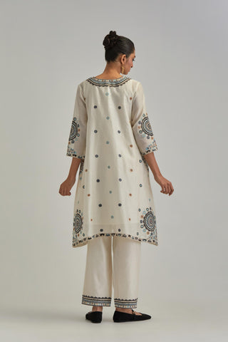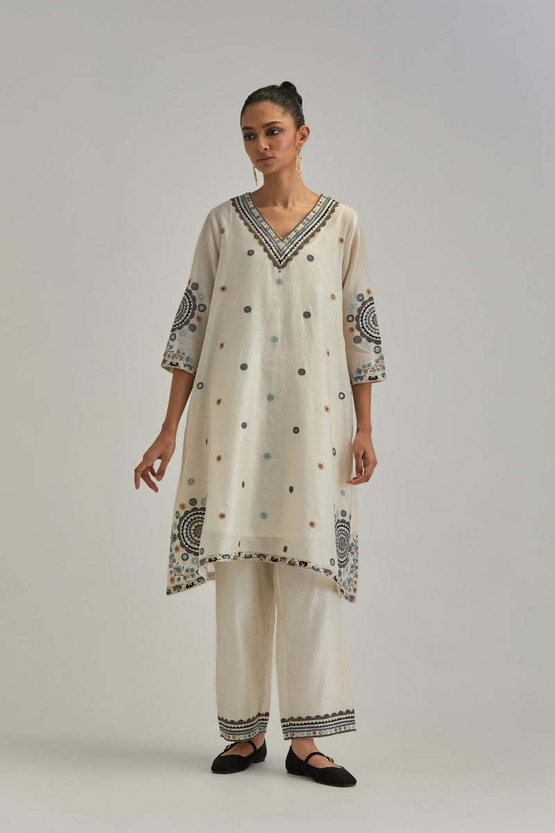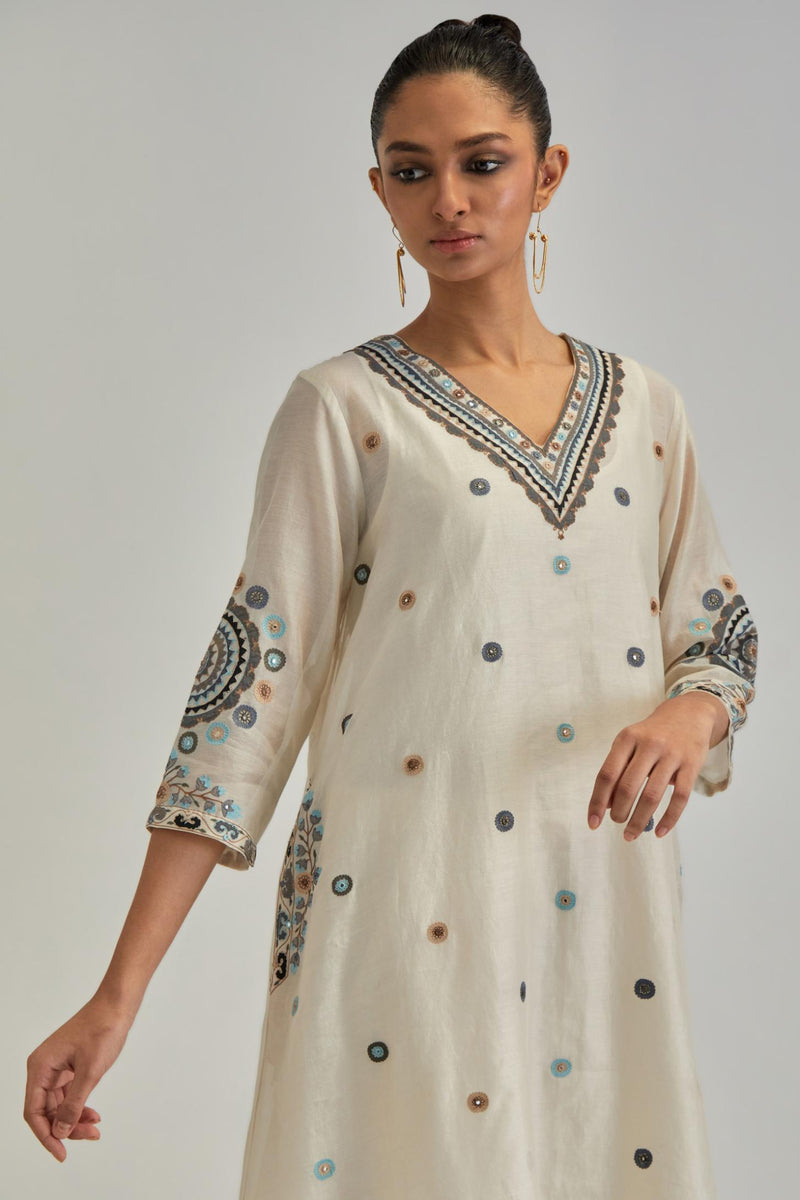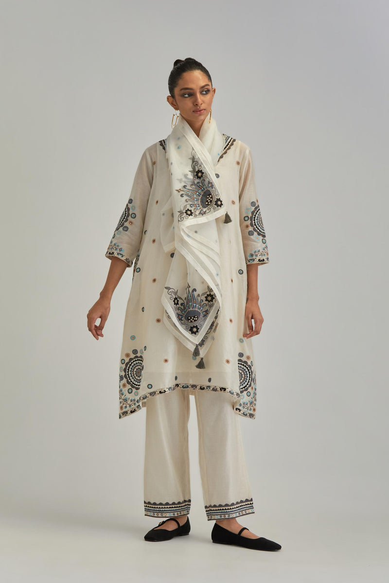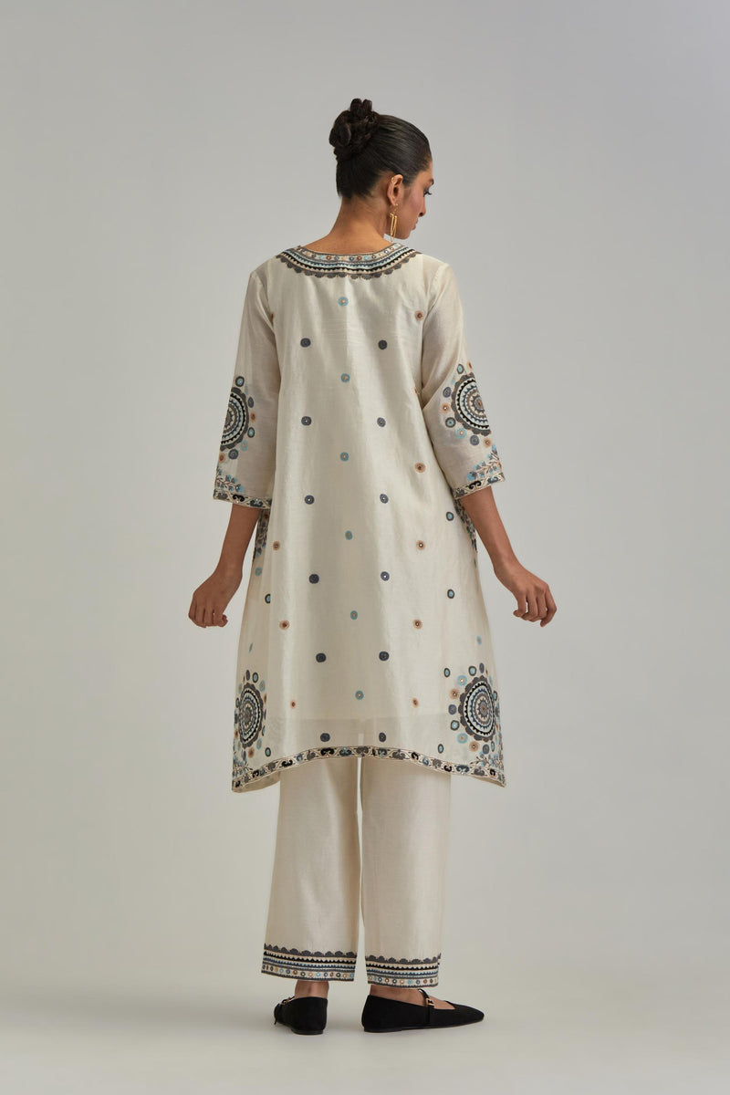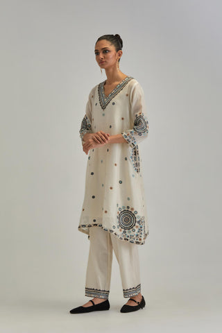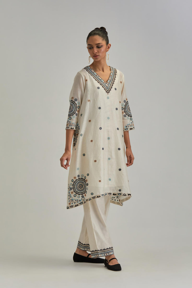 Off White silk Chanderi short V-neck, 3/4 sleeve kurta, with straight hem and side pockets. The neck, sleeve cuffs and bottom hem corners and pocket openings are decorated with fine appliqué and Aari thread embroidery. The main field of the kurta has earthy-coloured circular motifs. This kurta comes with matching cotton slip. Paired with Off white silk Chanderi straight pants with earthy coloured applique and Aari thread work at hem. It has an elasticated back and drawstring in front for better fitting and side pockets. The garment is fully lined. Comes with Off White silk organza dupatta with cotton appliqué embroidery at all four corners and small earthy coloured flower embroidery all-over the dupatta, highlighted with silver sequins and silk thread tassels at all four corners. Edges are finished with narrow Silk Chanderi border and ricrac.