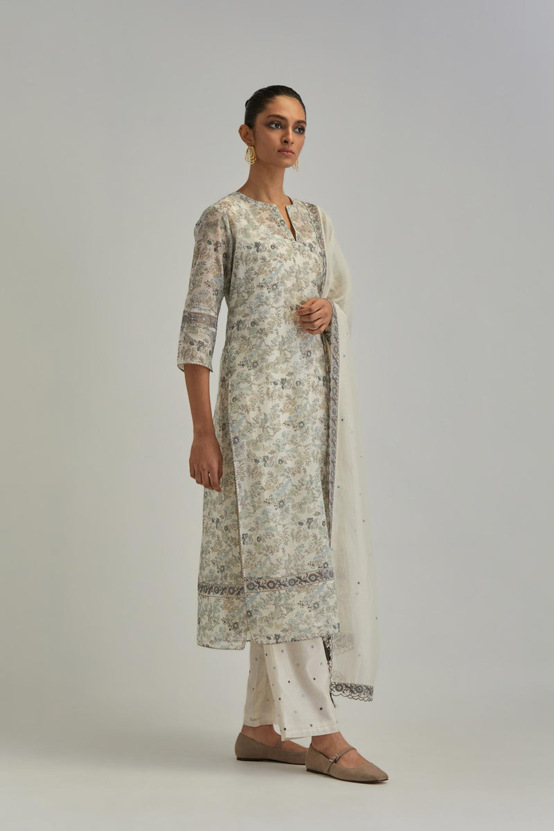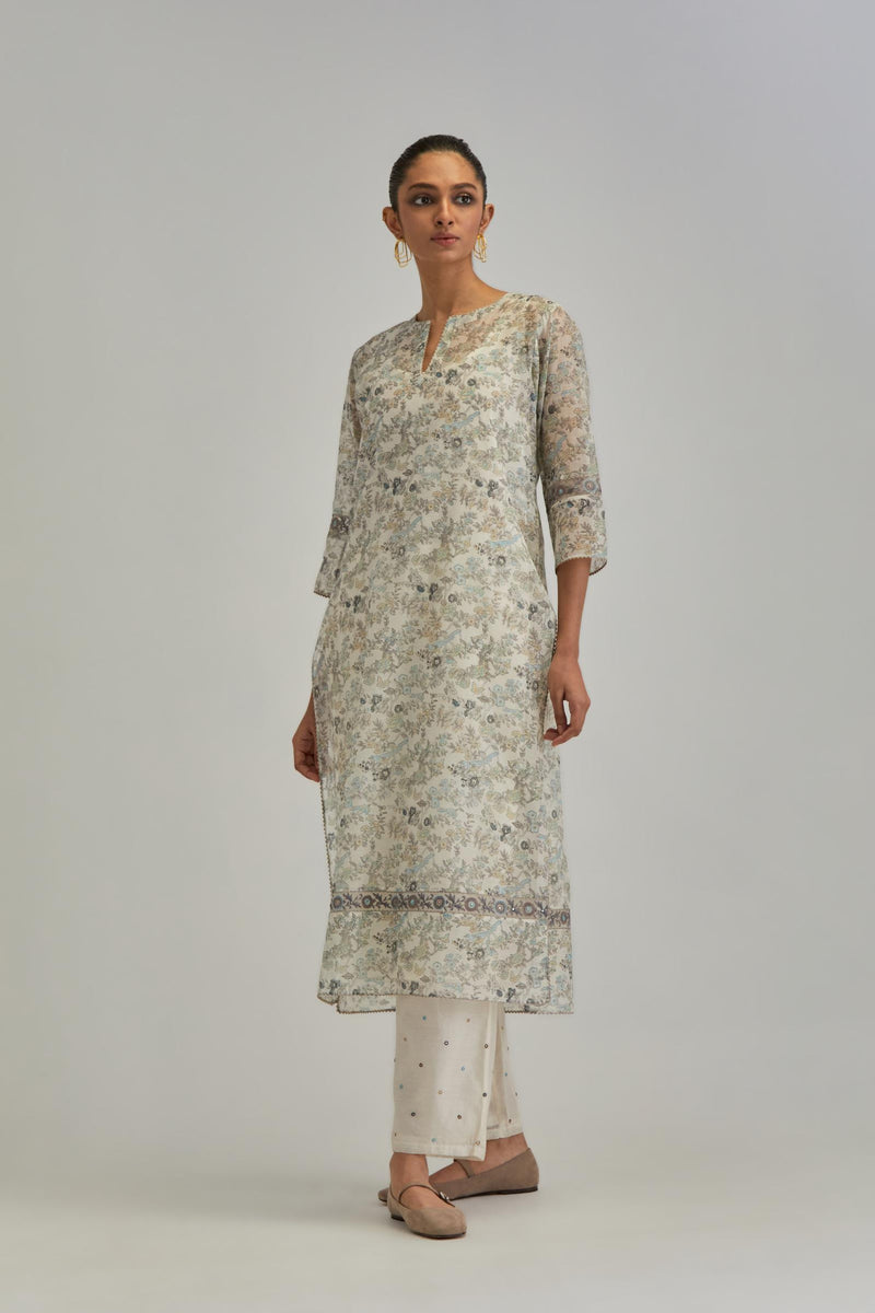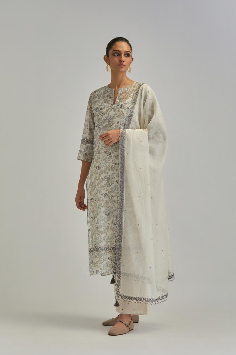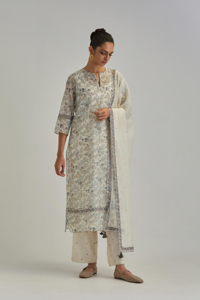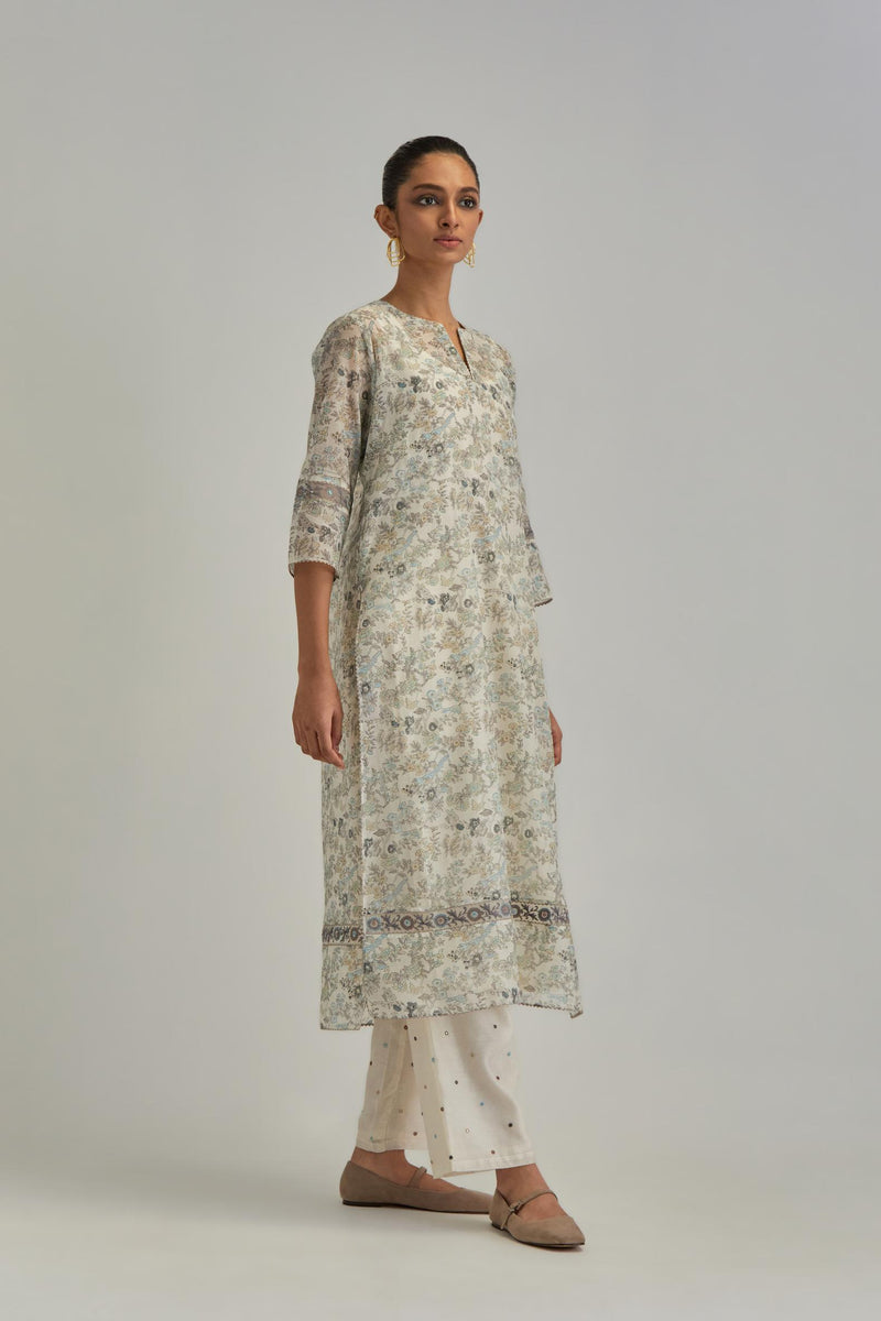 Silk Chanderi straight long kurta set with all-over earthy coloured ha – Kora India icon