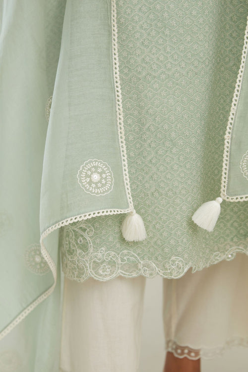 Green cotton chanderi dupatta with all over round booti embroidery.
