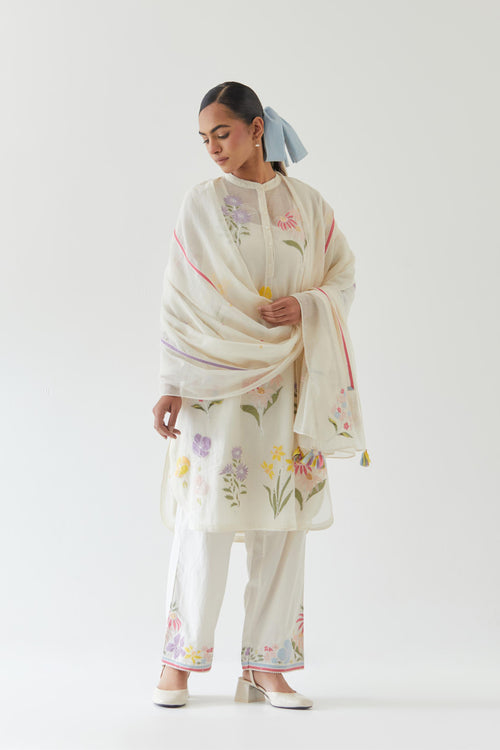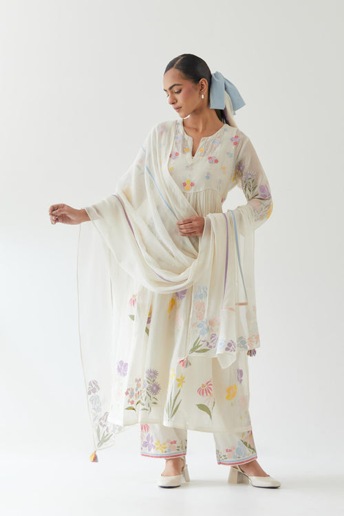 Crafted in airy cotton Chanderi, each garment blooms with delicate floral appliqué, sequins, and beadwork, echoing the quiet beauty and elegance of nature.
