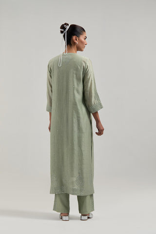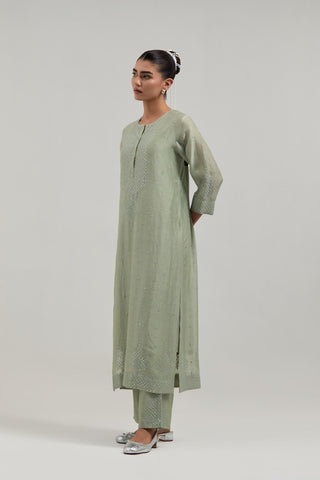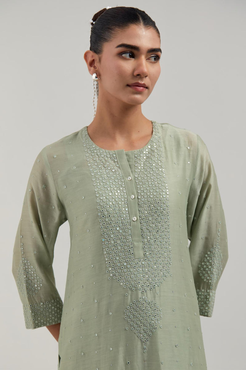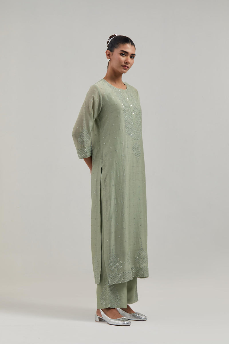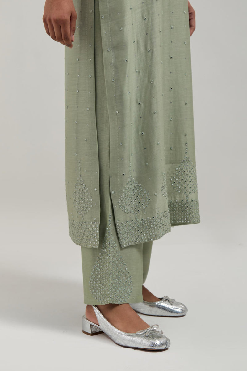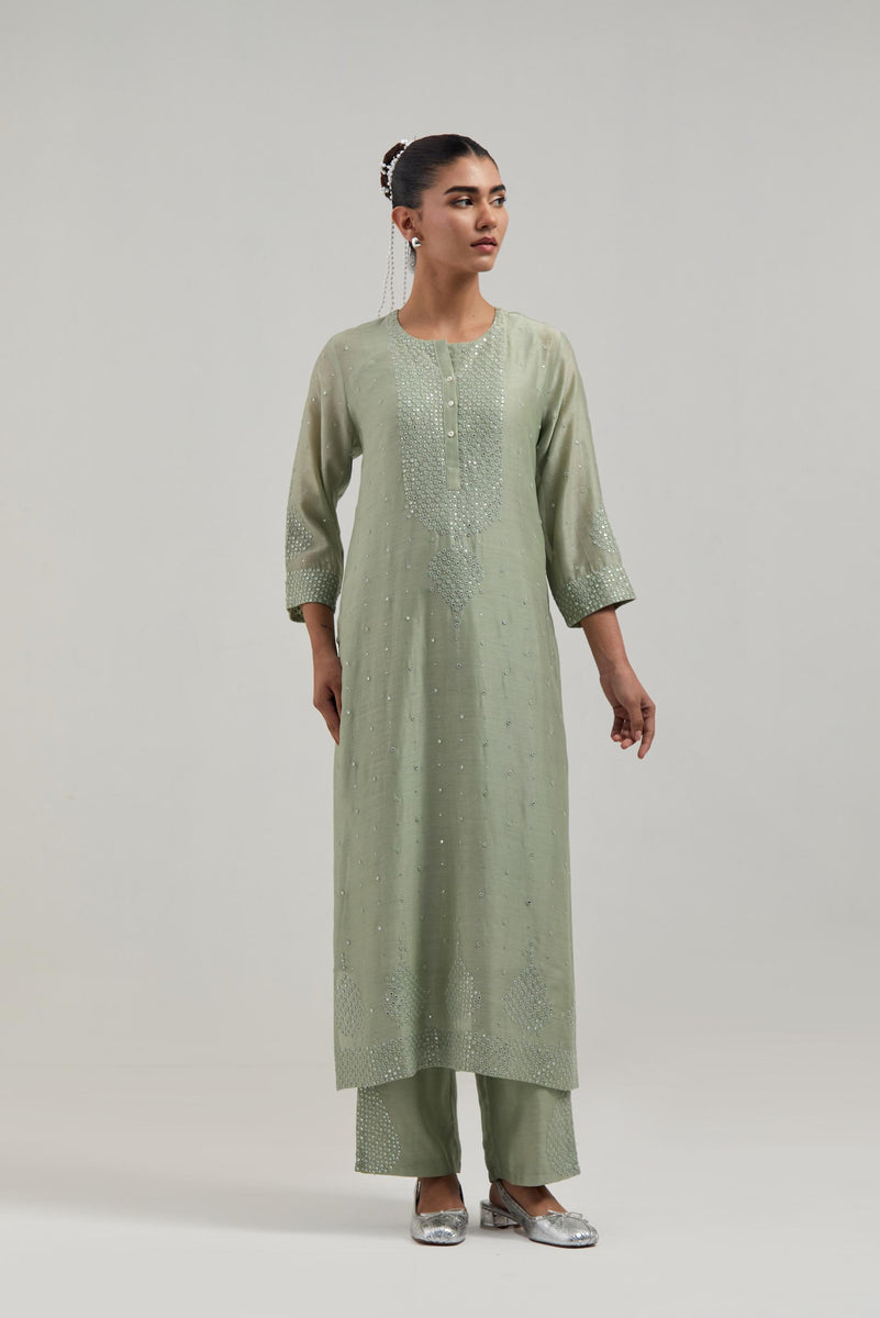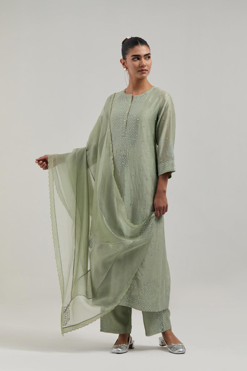 Green silk Chanderi straight kurta with hand-embroidered mirror at the neck, borders running along the hem and sleeve edges, and scattered silver sequin and mirror embellishments all-over. It has a round neckline with a button placket in front and 3/4 sleeves. This kurta comes with matching cotton slip. Paired with Green Silk Chanderi pants with hand embroidered leaf motifs with delicate mirror & sequins work at hem. It has an elasticated back and drawstring in the front for better fitting. The garment is fully lined. Comes with Green silk Chanderi dupatta with silk organza at the sides, finished with delicate scalloped edges, highlighted by hand-embroidered mirror work in leaf motifs at the corners and silver sequin work along the edges.