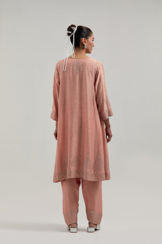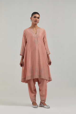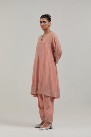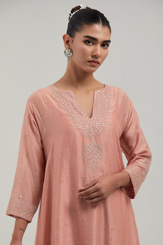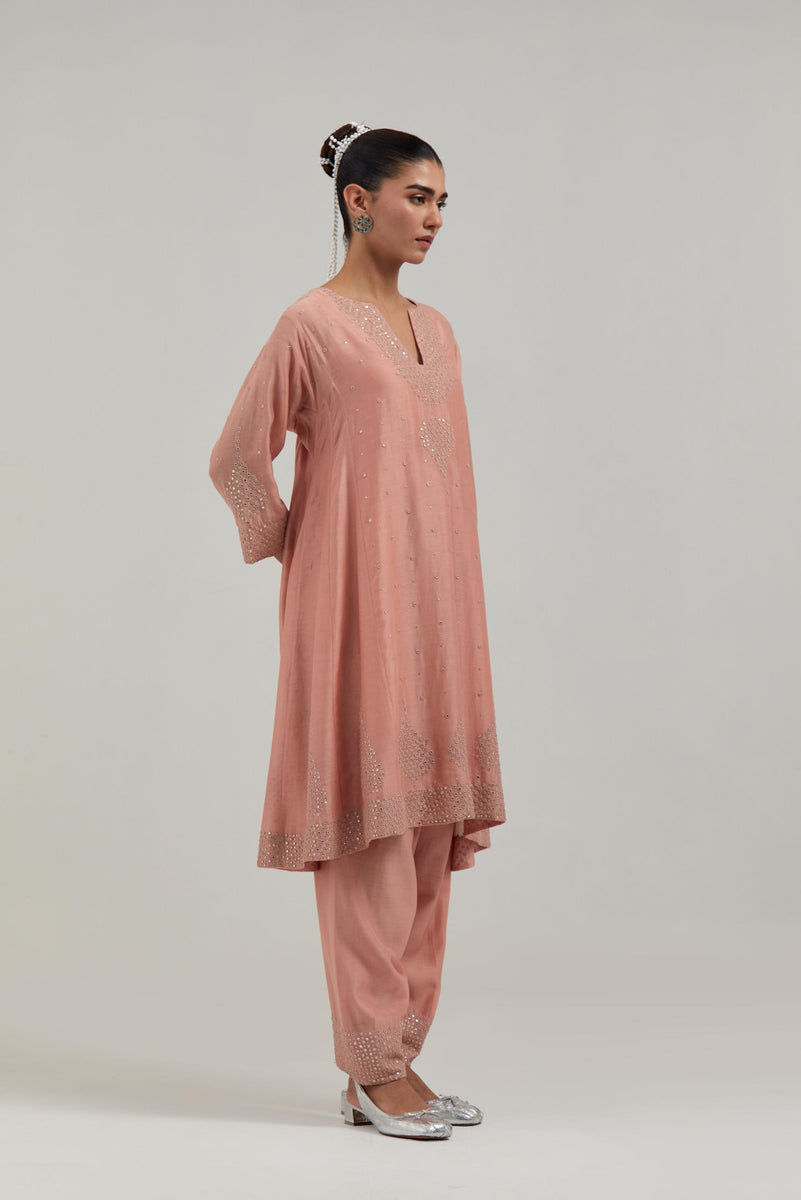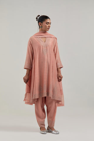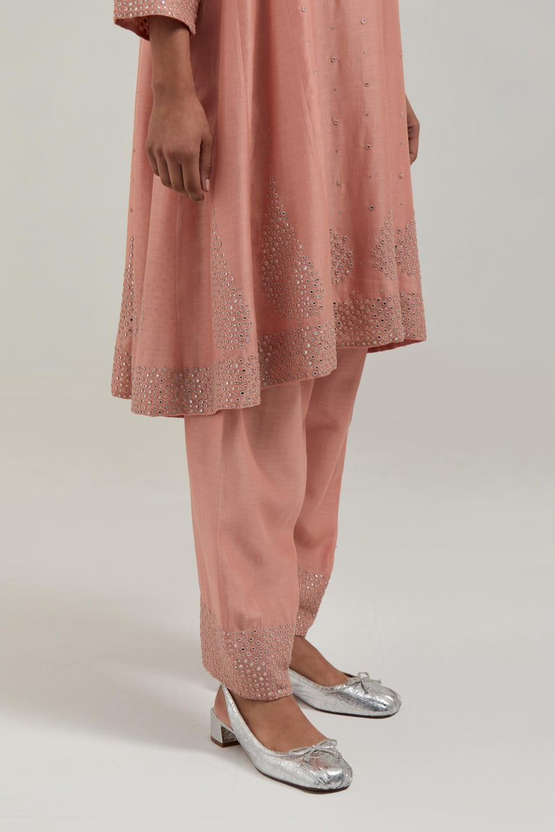Peach silk Chanderi short kalidar kurta, with hand embroidered mirror work at neck, hem and sleeve edges, highlighted with scattered silver sequin and mirror embellishments all-over. It has a round neckline with front slit and 3/4 sleeves. This kurta comes with matching cotton slip. Paired with Peach silk Chanderi salwar with hand-embroidered mirror & sequins work in a broad border at the hem. It has a drawstring running all around the waist. Comes with Peach silk Chanderi dupatta with silk organza at the sides, finished with delicate scalloped edges, highlighted by hand-embroidered mirror work in leaf motifs at the corners and silver sequin work along the edges.