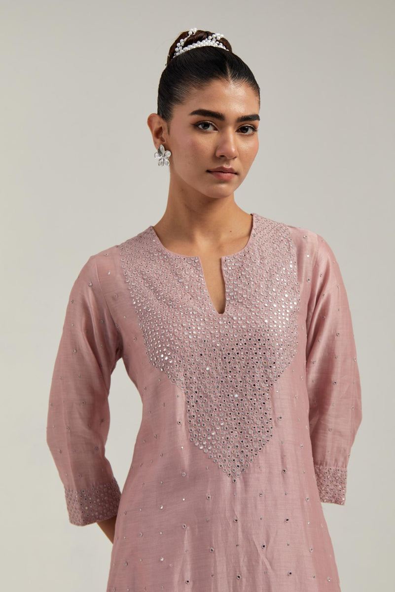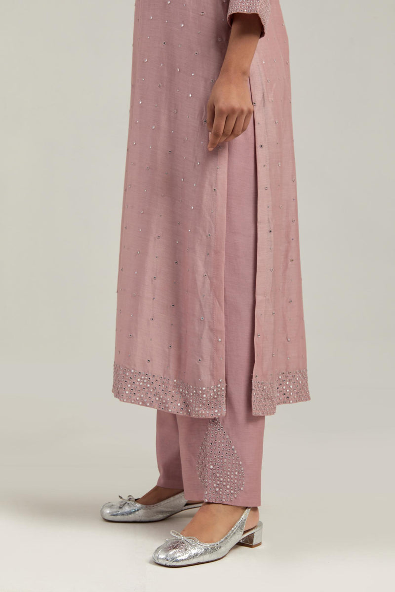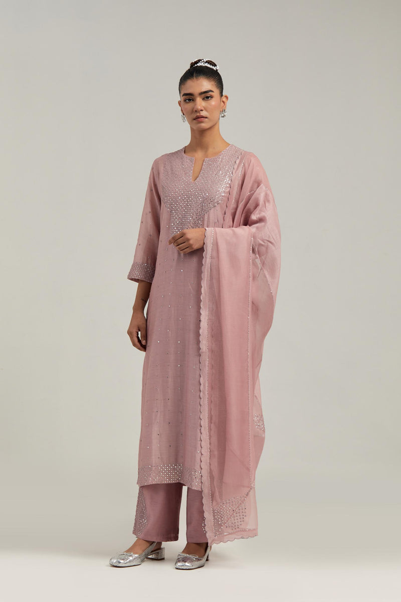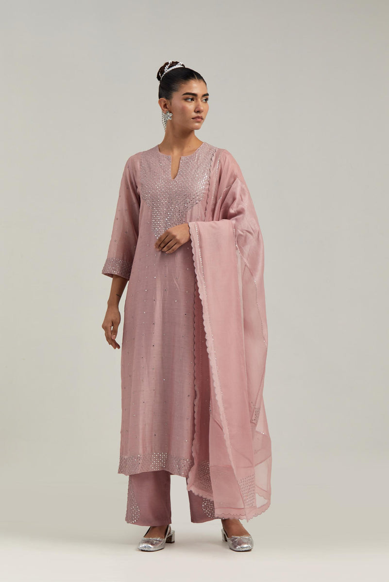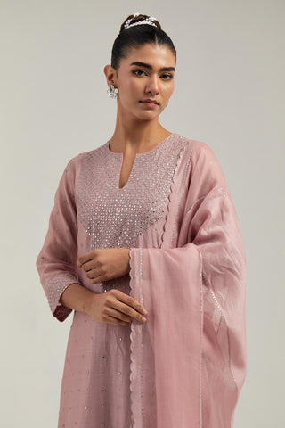Pink silk Chanderi straight kurta with hand-embroidered mirror at the neck, hem and sleeves, highlighted with scattered silver sequins and mirror embellishments all-over. It has a round neckline with front slit and 3/4 sleeves. This kurta comes with matching cotton slip. Paired with Pink Silk Chanderi pants with hand embroidered leaf motifs with delicate mirror & sequins work at hem. It has an elasticated back and drawstring in the front for better fitting. The garment is fully lined. Comes with Pink silk Chanderi dupatta with silk organza at the sides, finished with delicate scalloped edges, highlighted by hand-embroidered mirror work in leaf motifs at the corners and silver sequin work along the edges.