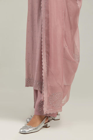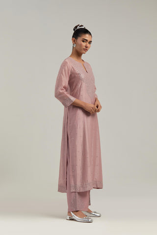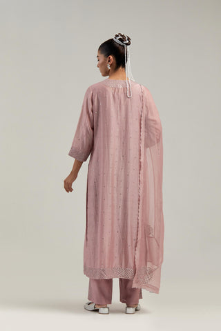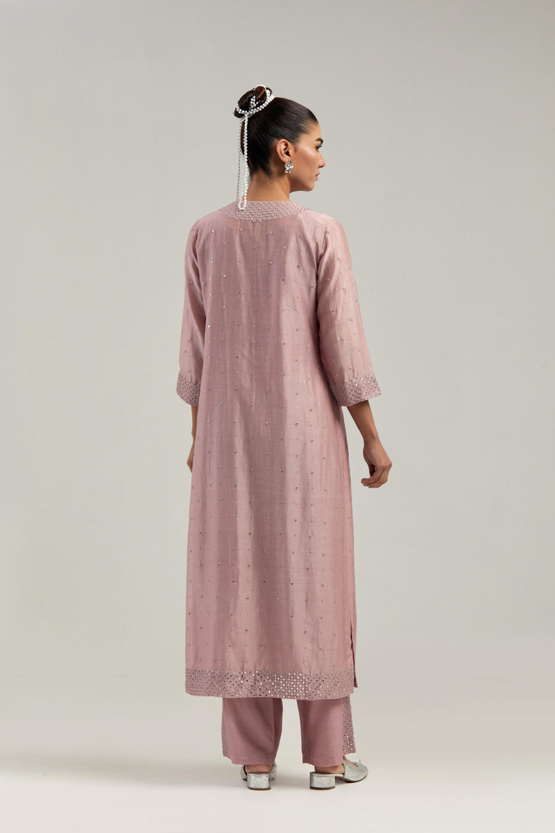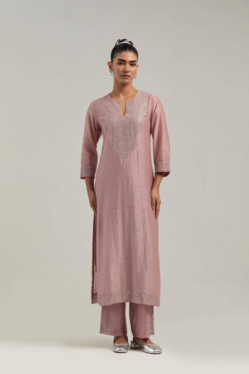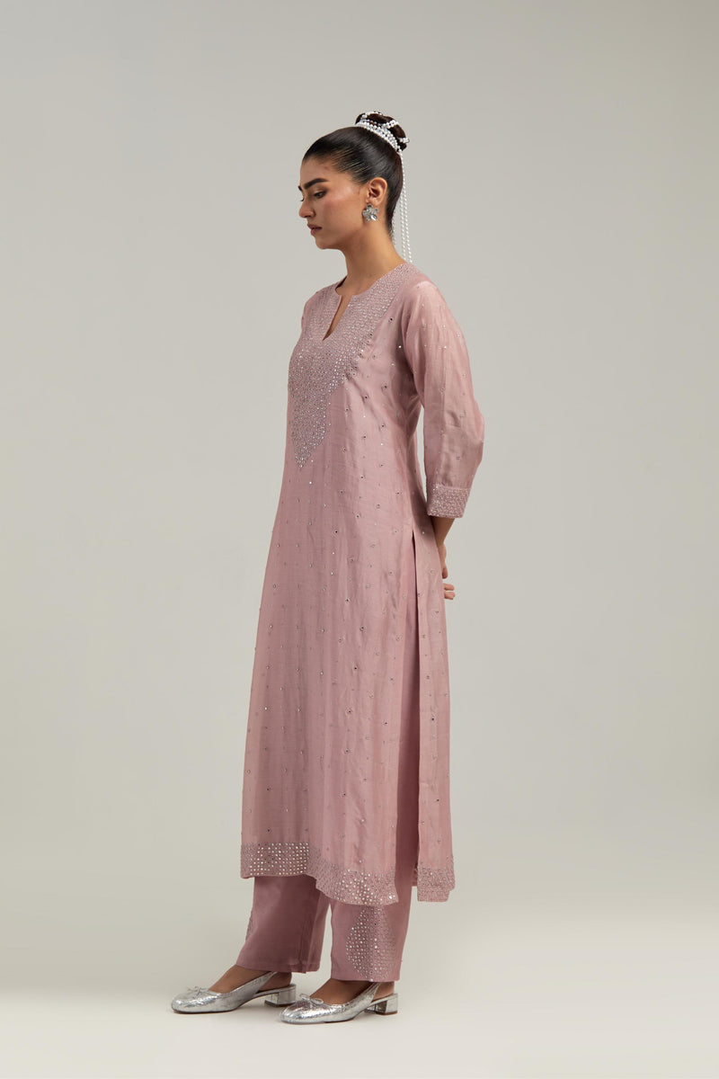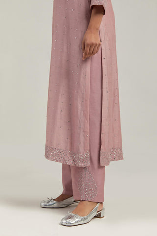 Pink silk Chanderi straight kurta with hand-embroidered mirror at the neck, hem and sleeves, highlighted with scattered silver sequins and mirror embellishments all-over. It has a round neckline with front slit and 3/4 sleeves. This kurta comes with matching cotton slip. Paired with Pink Silk Chanderi pants with hand embroidered leaf motifs with delicate mirror & sequins work at hem. It has an elasticated back and drawstring in the front for better fitting. The garment is fully lined. Comes with Pink silk Chanderi dupatta with silk organza at the sides, finished with delicate scalloped edges, highlighted by hand-embroidered mirror work in leaf motifs at the corners and silver sequin work along the edges.