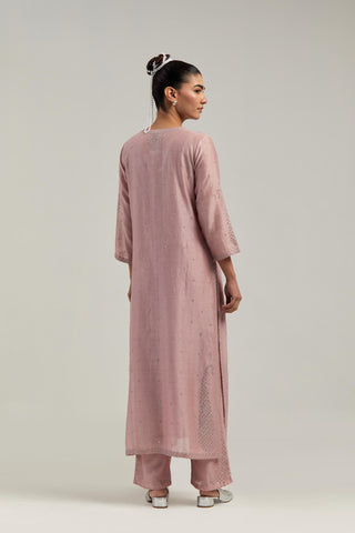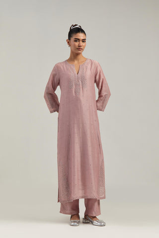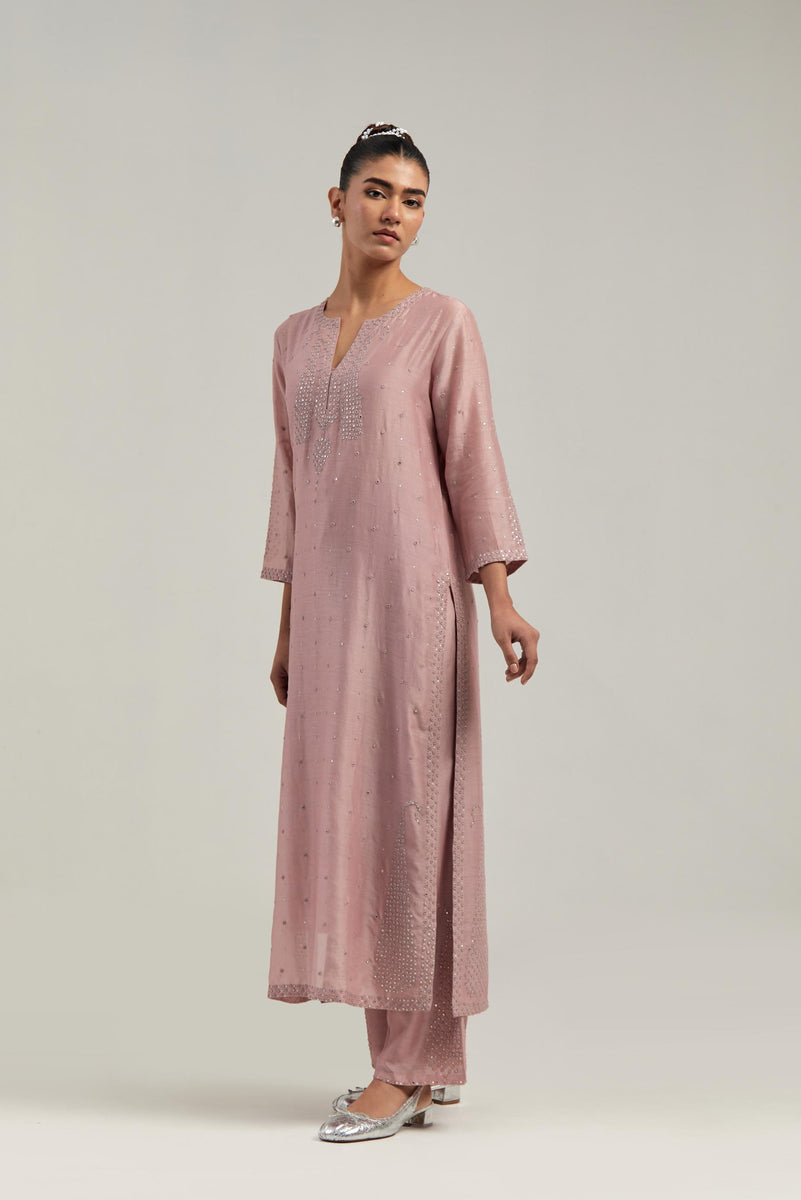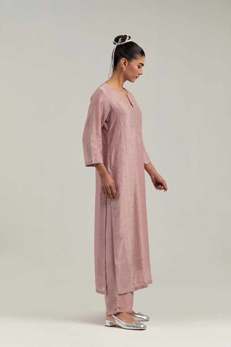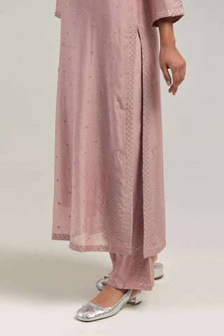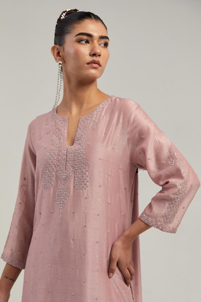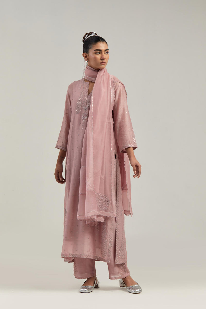Pink silk Chanderi straight kurta with hand-embroidered paisley motifs with delicate mirror and sequins work at neck, hem, and sleeves, with narrow borders along the edges. It has a round neckline with front slit and 3/4 sleeves, highlighted with scattered silver sequin and mirror embellishments all-over. This kurta comes with matching cotton slip. Paired with Pink silk Chanderi pants with hand-embroidered paisley motifs with delicate mirror and sequins work at the hem. It has an elasticated back and drawstring in the front for better fitting. The garment is fully lined. Comes with Pink silk Chanderi dupatta with silk organza at the sides, finished with delicate scalloped edges, highlighted by hand-embroidered mirror work in leaf motifs at the corners and silver sequin work along the edges.