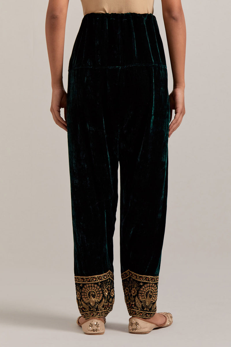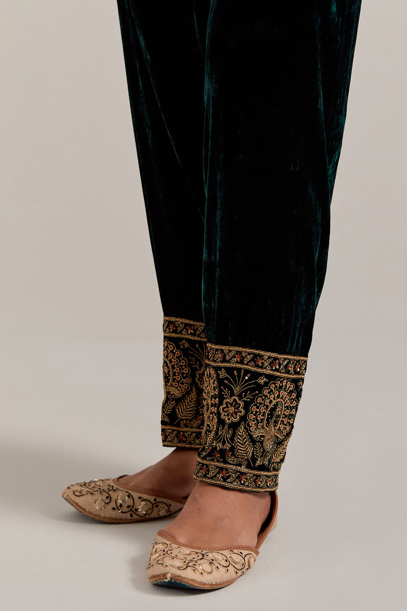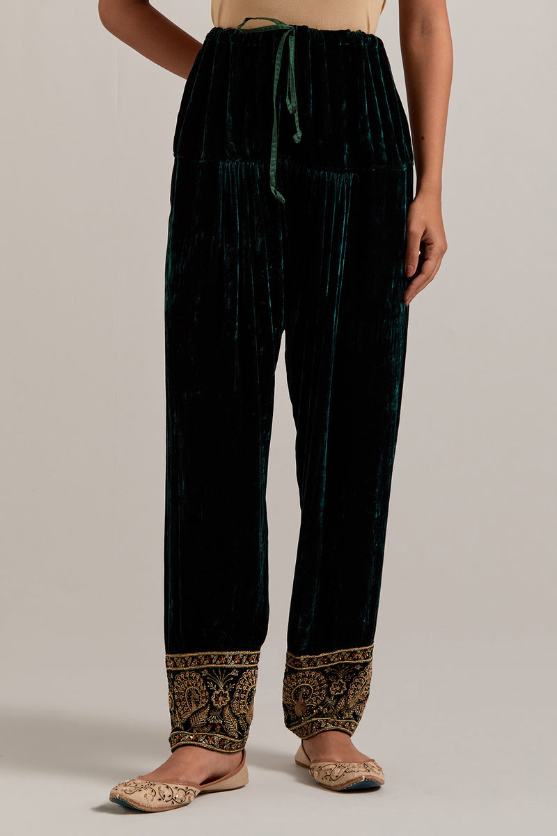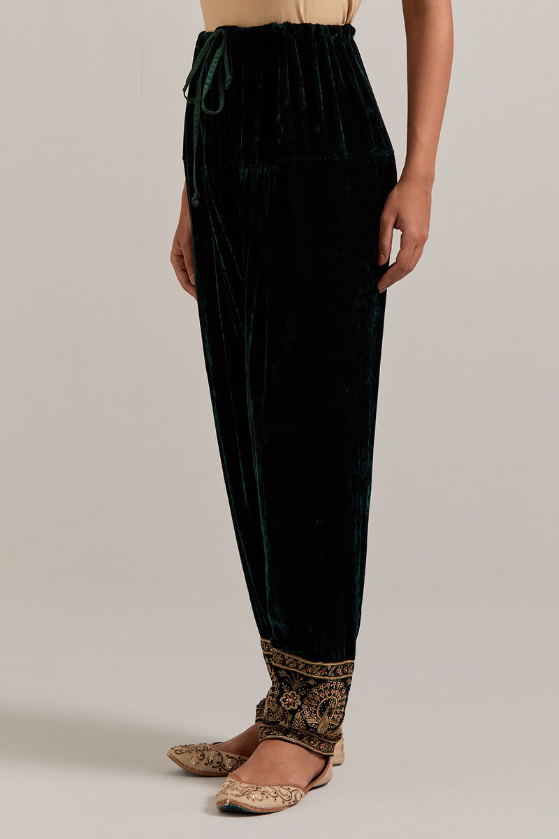 Dark green Silk velvet salwar, highlighted with hand embroidered bead, sequins, zardozi and zari border at bottom hem. Sale