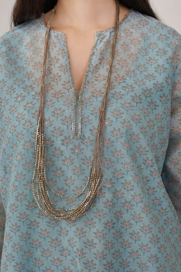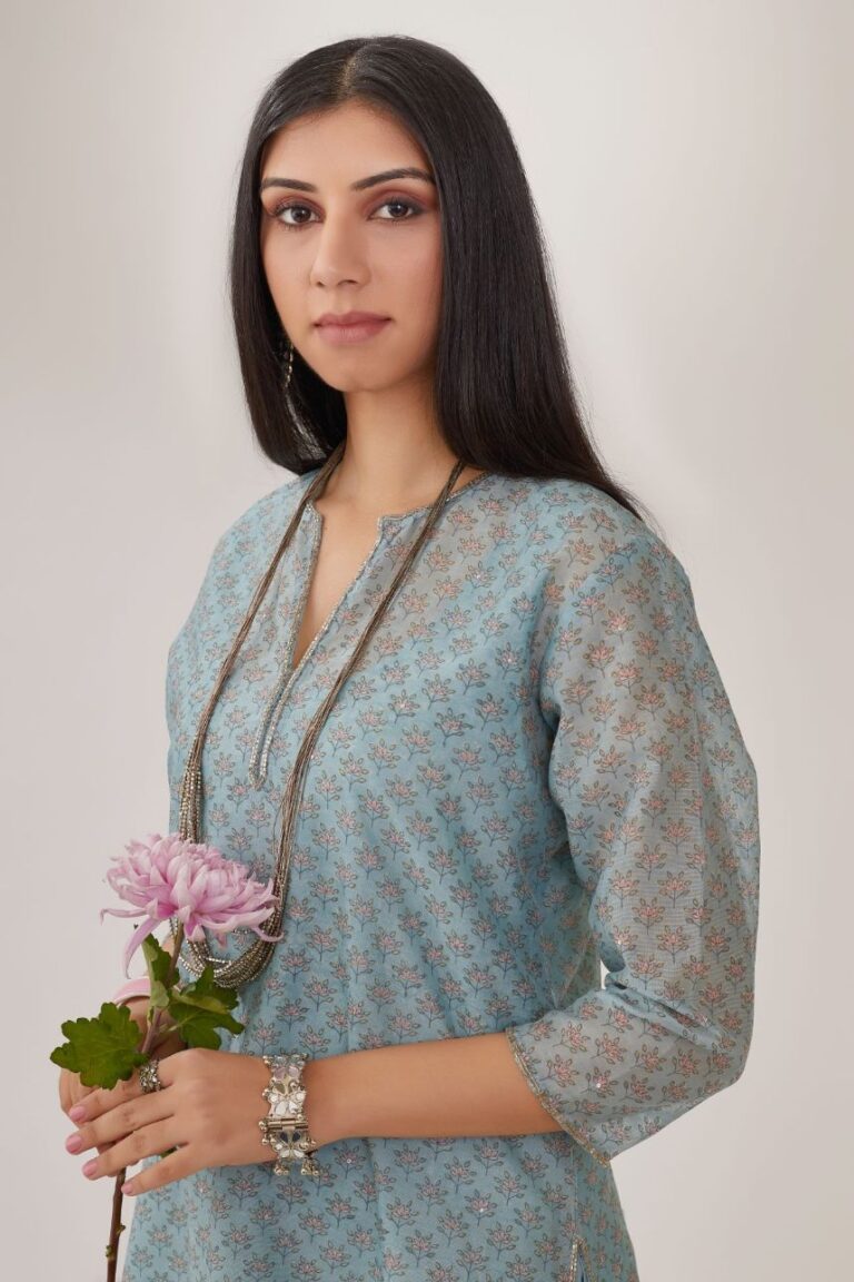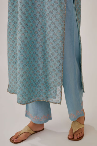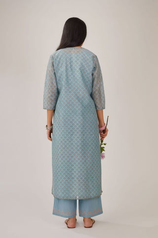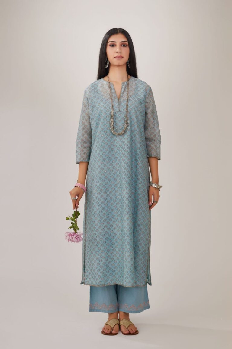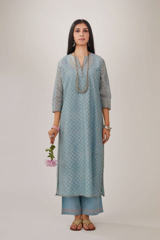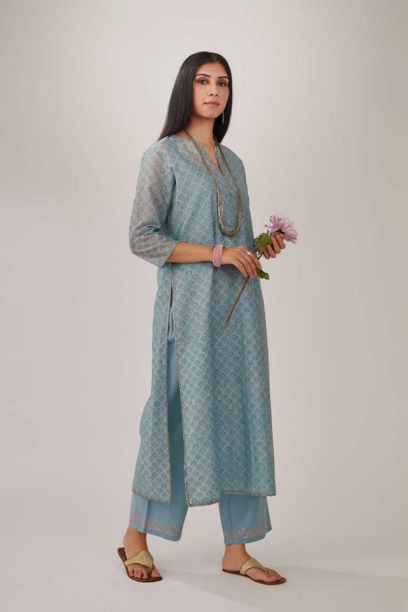 Teal blue silk Chanderi straight kurta with all-over lotus hand block – Kora India icon