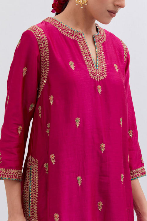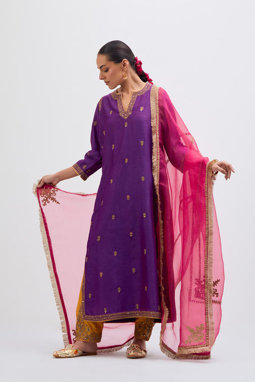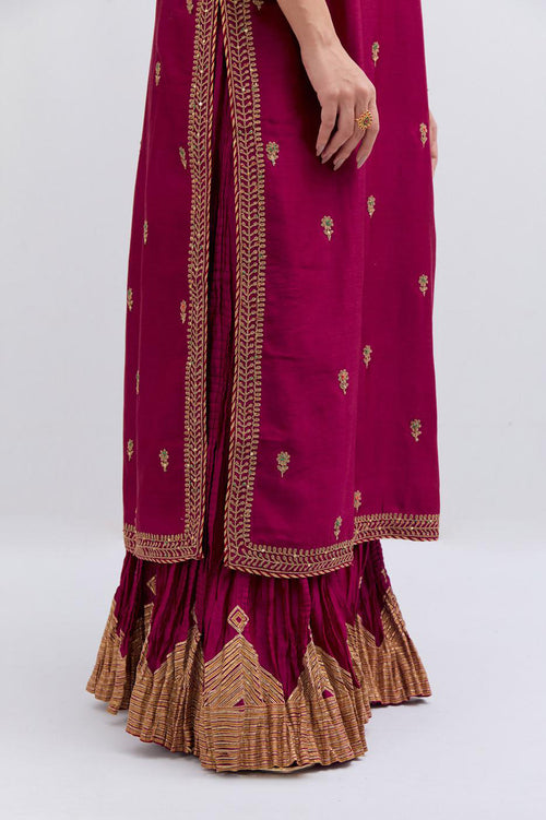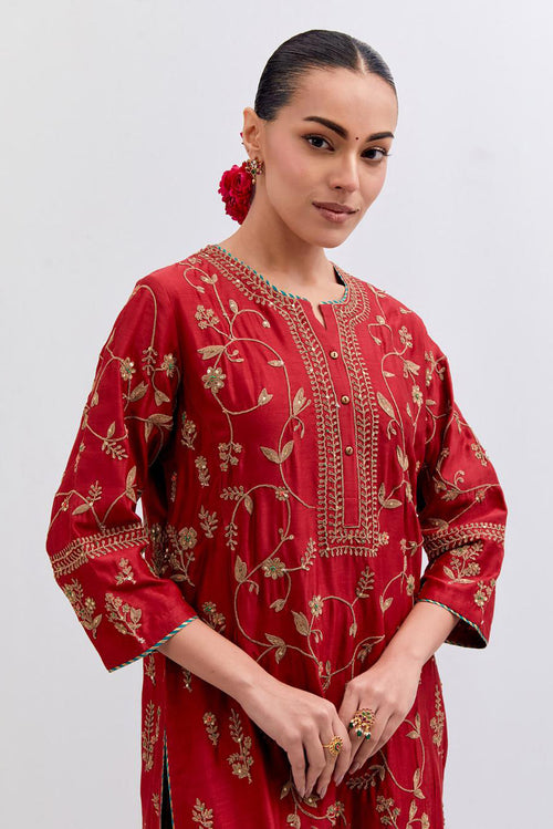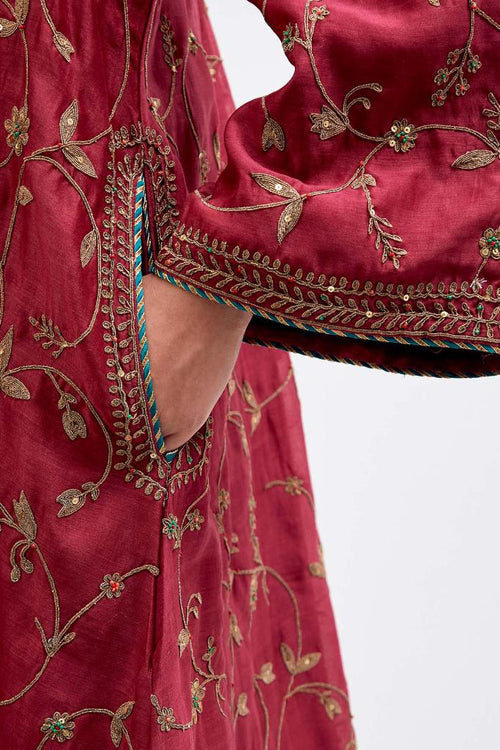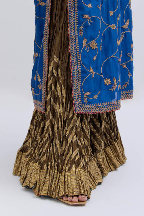 Inspired by the timeless symbolism of victory, Jayati brings together fluid silhouettes, luminous fabrics, and intricate embellishments that echo triumph’s brilliance. Hues of crimson, gold, red, rust and deep indigo evoke festivity and courage, while delicate handwork and refined detailing add an air of regal poise. 40 kali flared lehengas with delicate gota embroidery add to the drama.