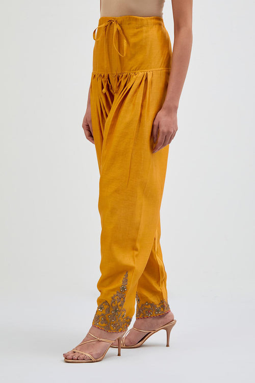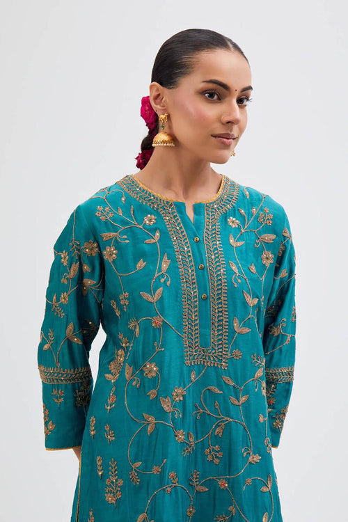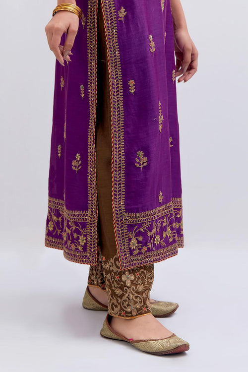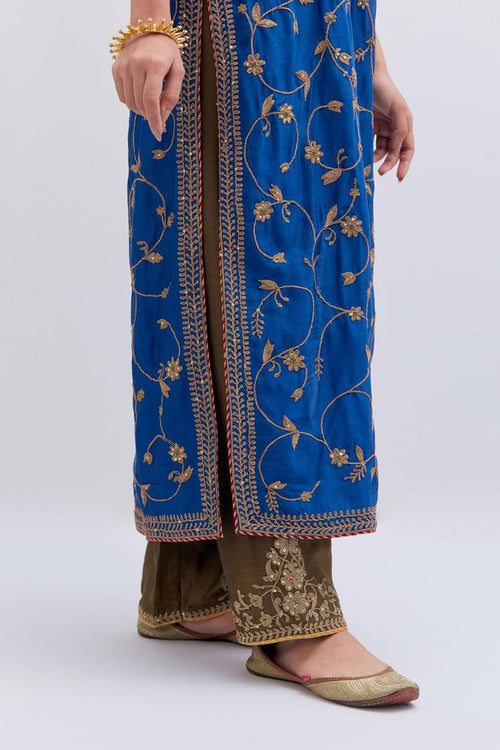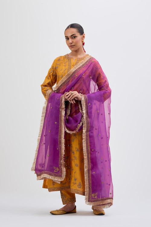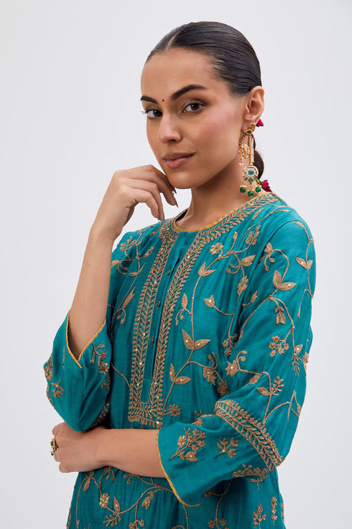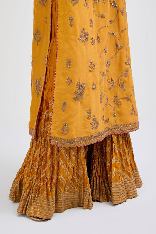 Inspired by the timeless symbolism of victory, Jayati brings together fluid silhouettes, luminous fabrics, and intricate embellishments that echo triumph’s brilliance. Hues of crimson, gold, red, rust and deep indigo evoke festivity and courage, while delicate handwork and refined detailing add an air of regal poise. 40 kali flared lehengas with delicate gota embroidery add to the drama.