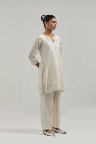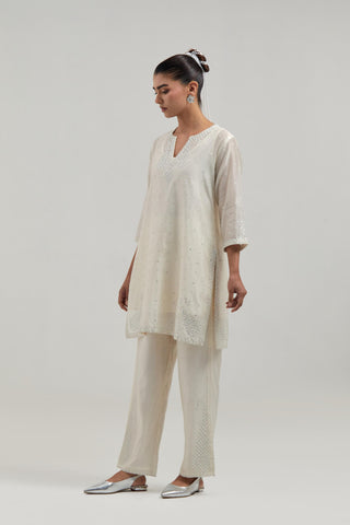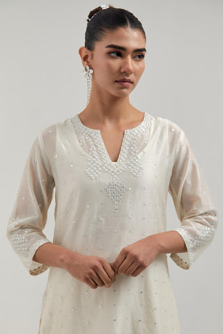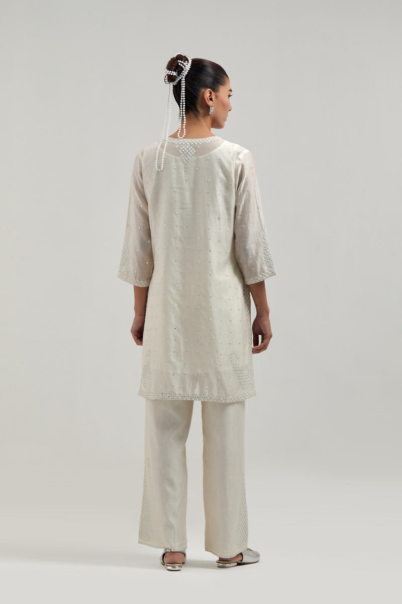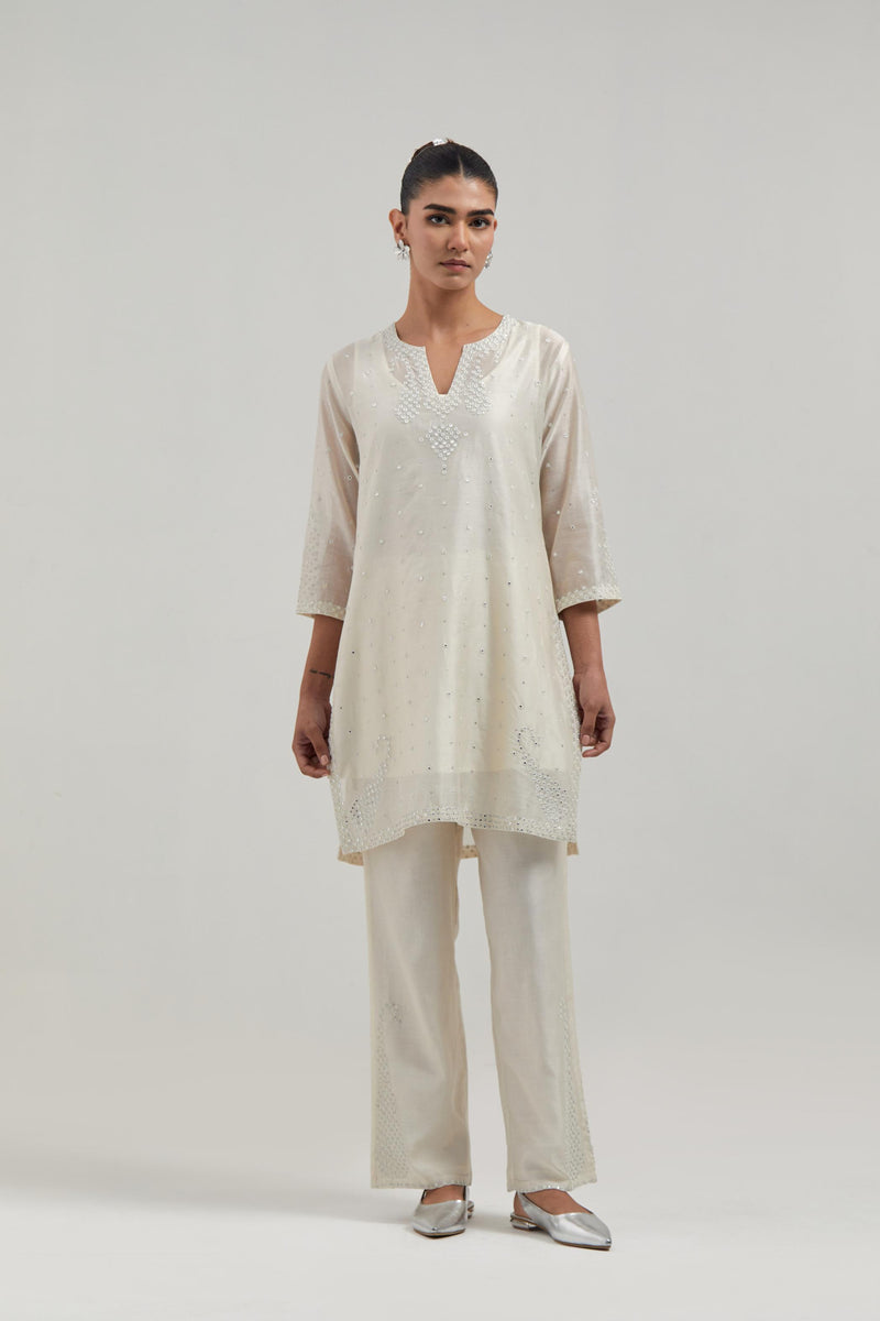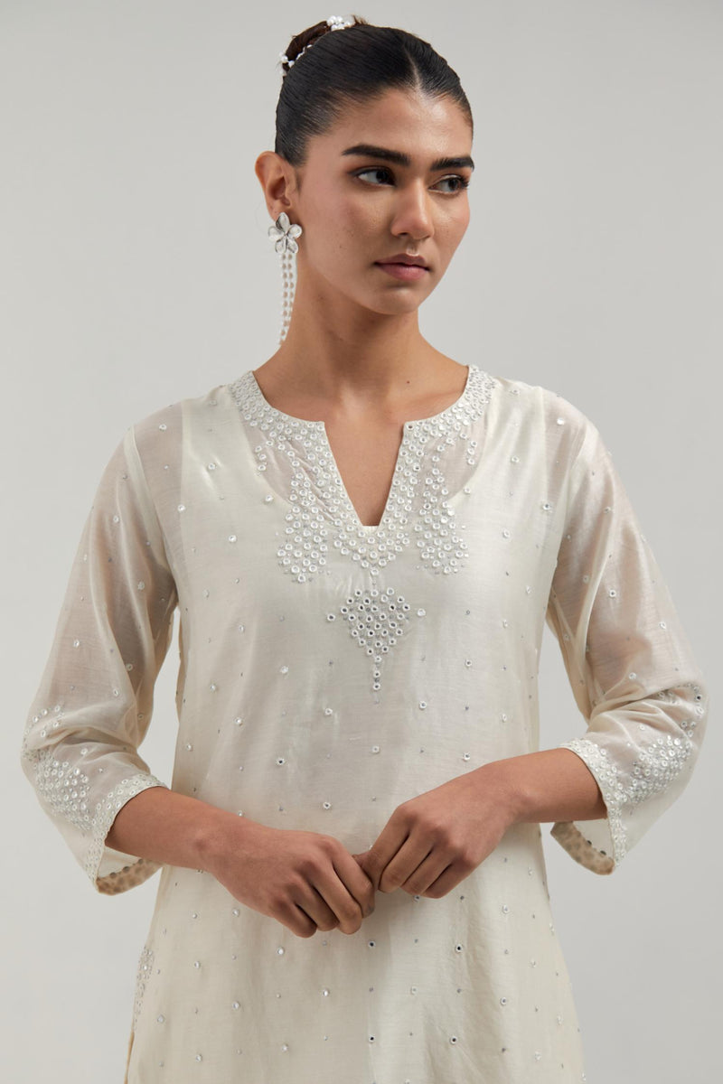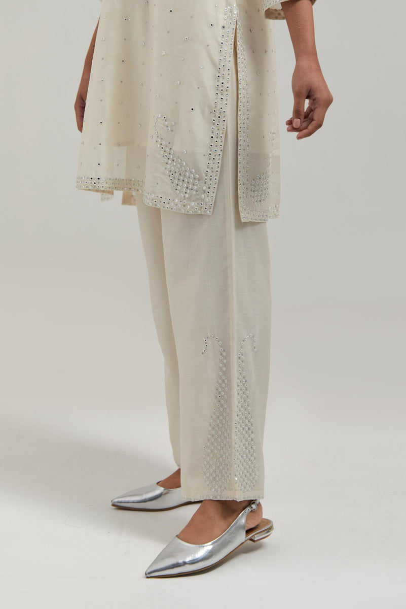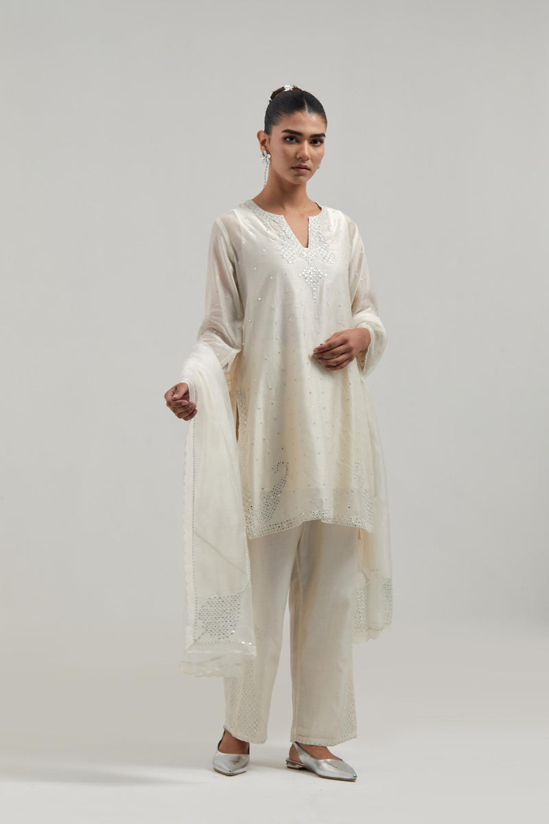 Off white silk Chanderi straight short kurta with hand-embroidered paisley motifs with delicate mirror and sequins work at neck, hem, and sleeves, with narrow borders along the edges. It has a round neckline with front slit and 3/4 sleeves, highlighted with scattered silver sequin and mirror embellishments all-over. This kurta comes with matching cotton slip. Paired with Off white silk Chanderi pants with hand-embroidered paisley motifs with delicate mirror and sequins work at the hem. It has an elasticated back and drawstring in the front for better fitting. The garment is fully lined. Comes with Off white silk Chanderi dupatta with silk organza at the sides, finished with delicate scalloped edges, highlighted by hand-embroidered mirror work in leaf motifs at the corners and silver sequin work along the edges.