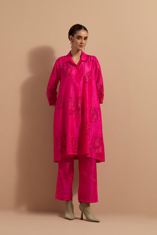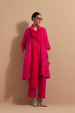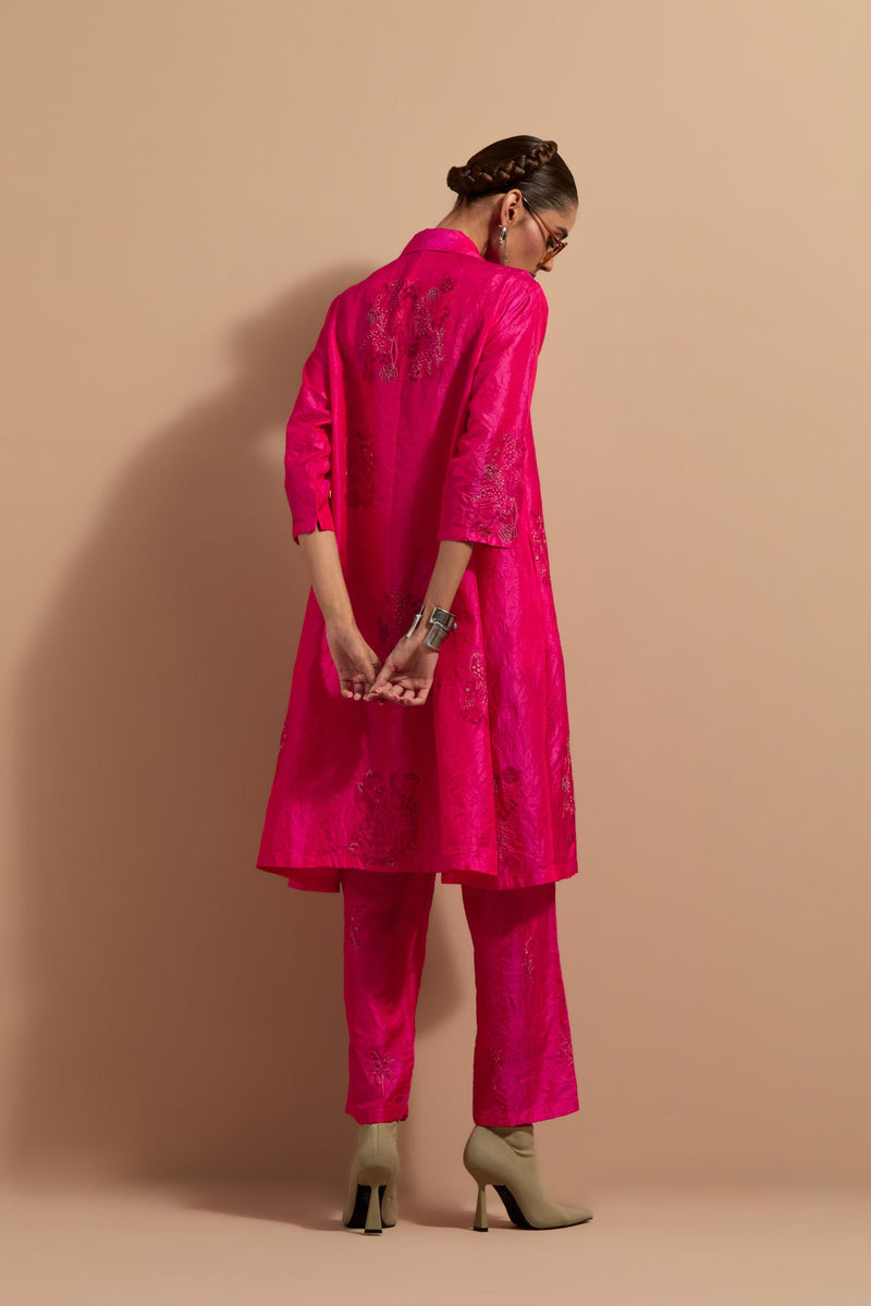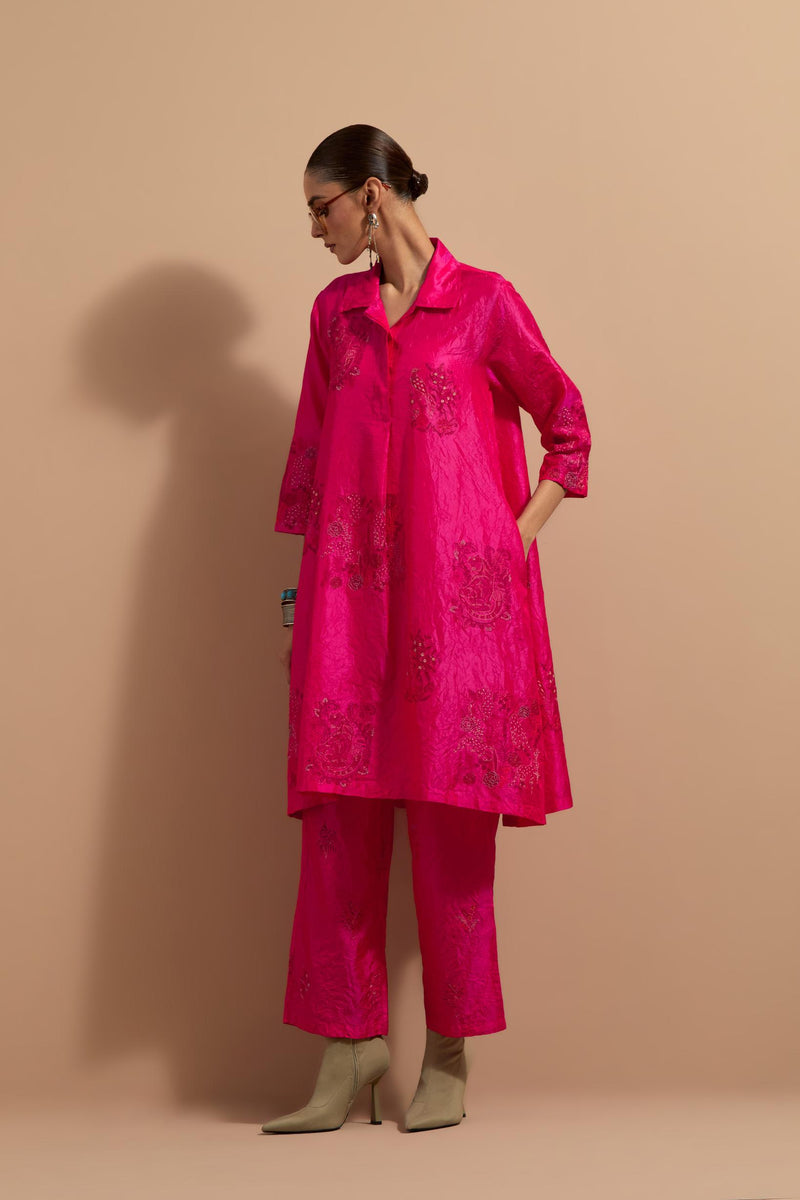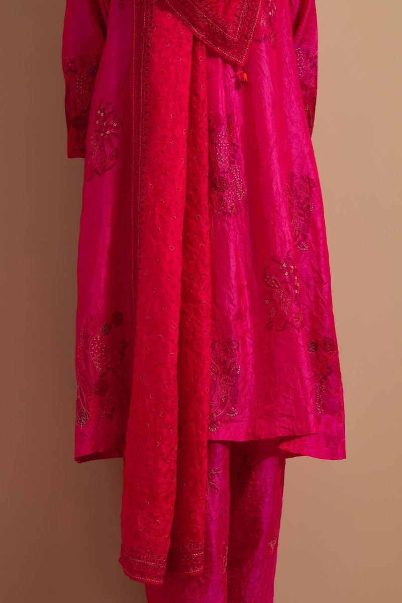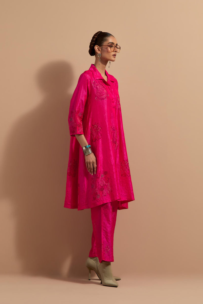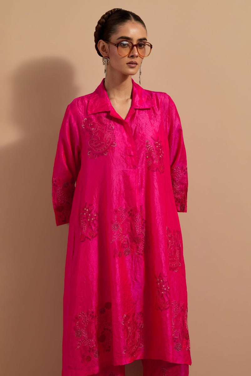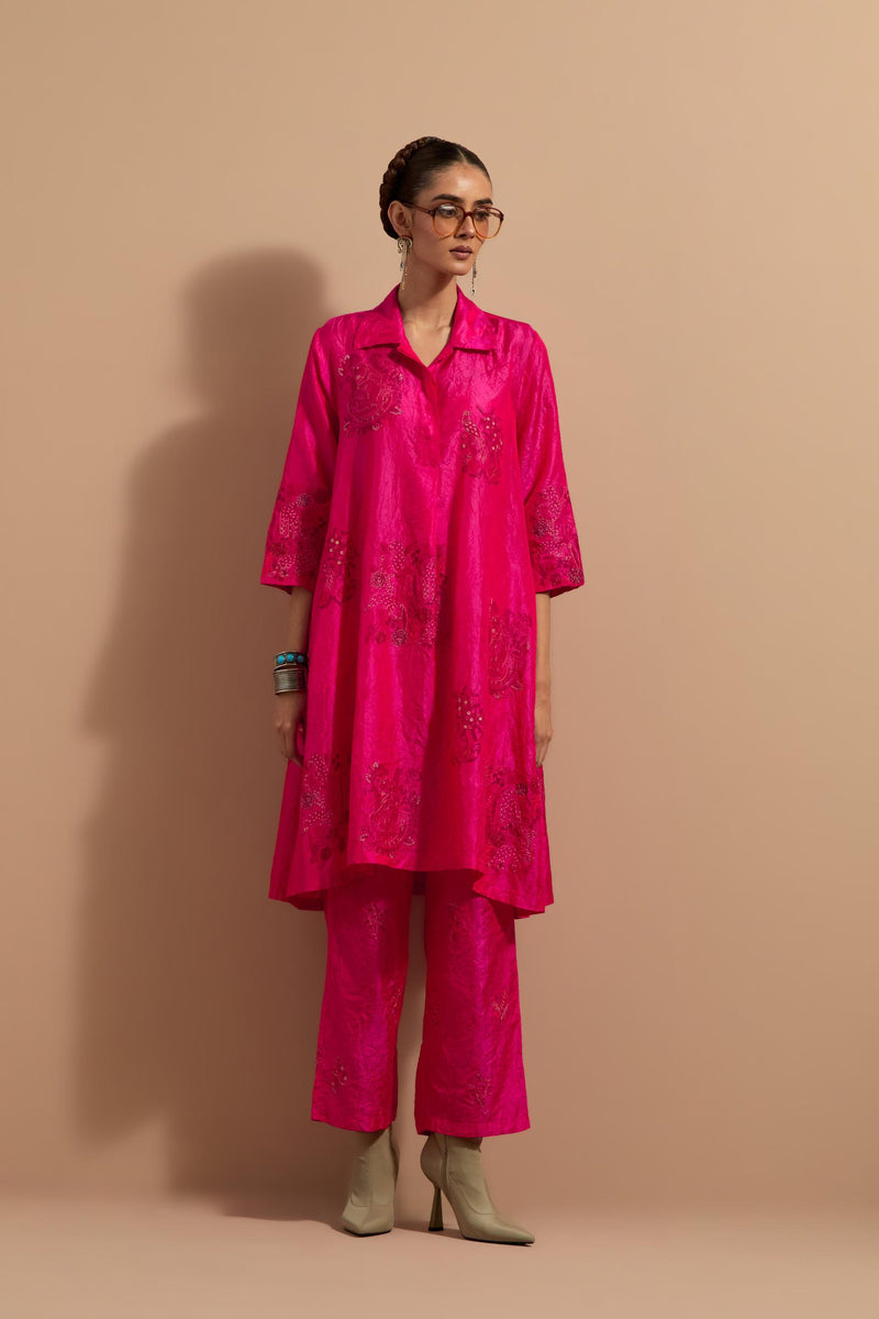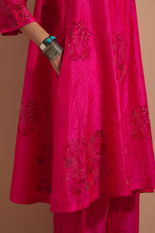Fuchsia crushed silk A-line short kurta set with hand block print, hig – Kora India icon