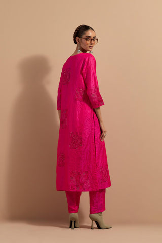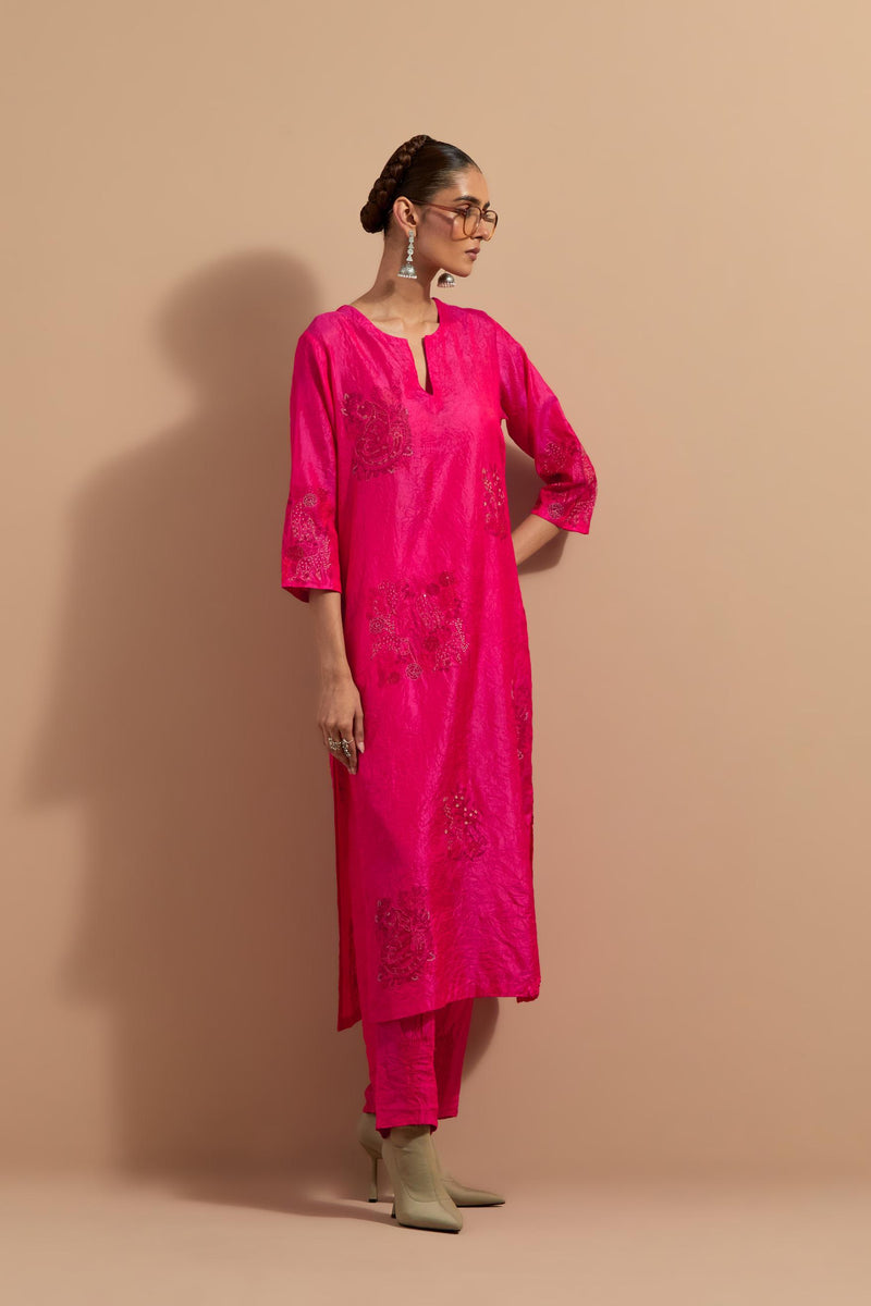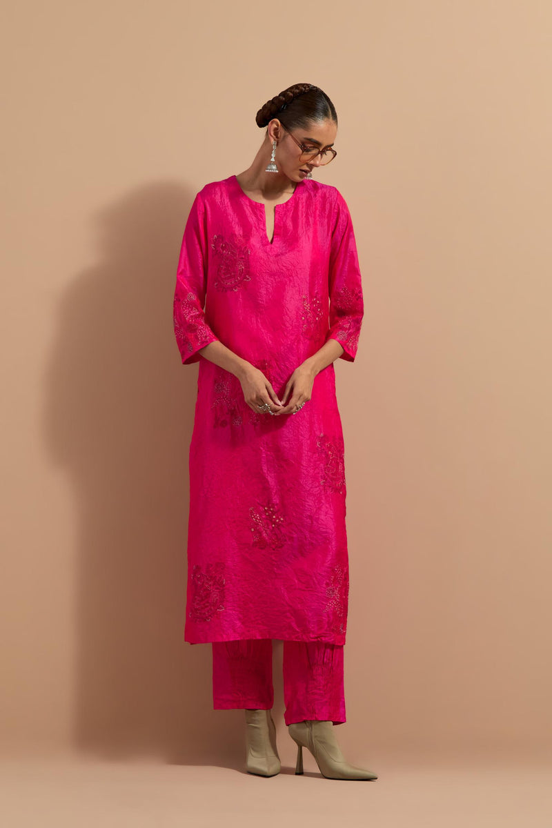 Fuchsia crushed silk hand block printed straight kurta set, highlighte – Kora India icon