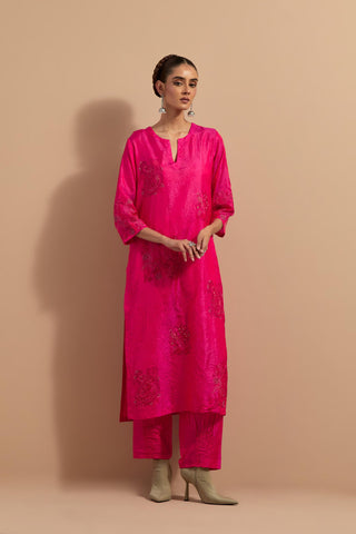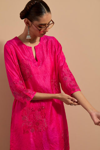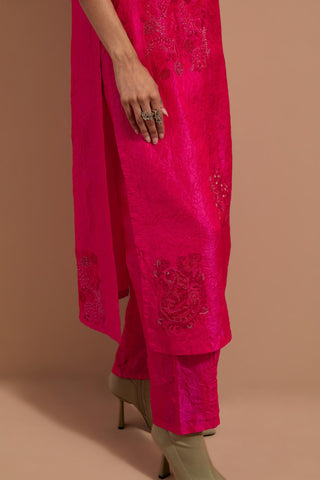 Fuchsia crushed silk hand block printed straight kurta set, highlighted with multi colored thread embroidery. Sale
