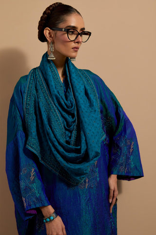 Light teal hand crushed block printed silk stole with quilted embroidery and beaded tassels at all four corners.