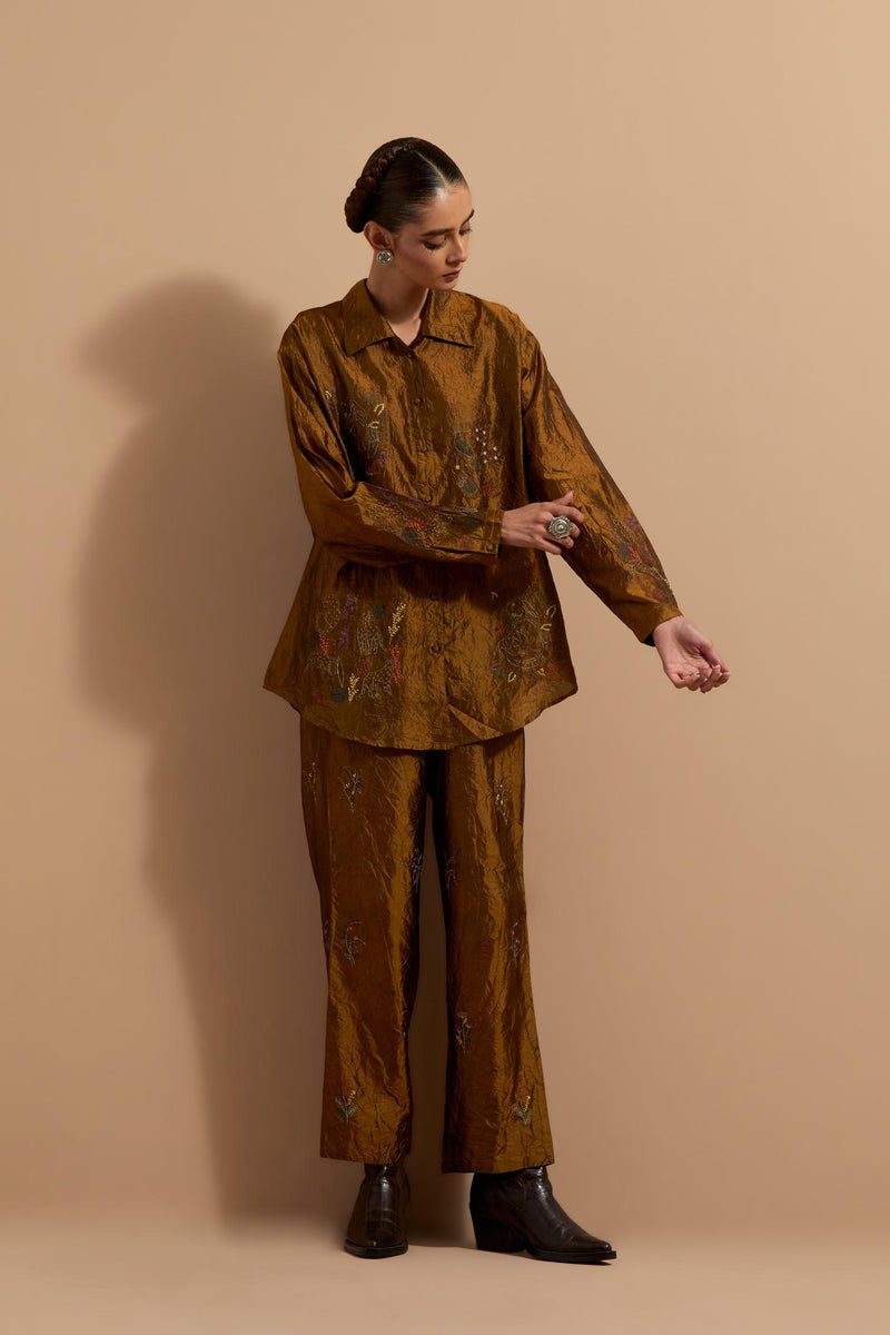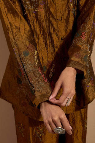 Olive crushed silk hand block printed shirt, highlighted with multi colored thread embroidery. It has a shirt collar neckline with button placket in the front and full sleeves. Paired with Olive crushed silk hand block printed pants, highlighted with multi colored thread embroidery. It has an elasticated waist at back and drawstrings in front for better fitting and side pockets.