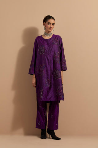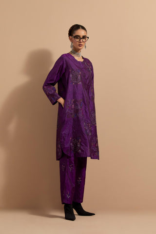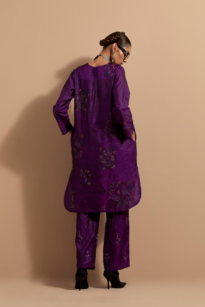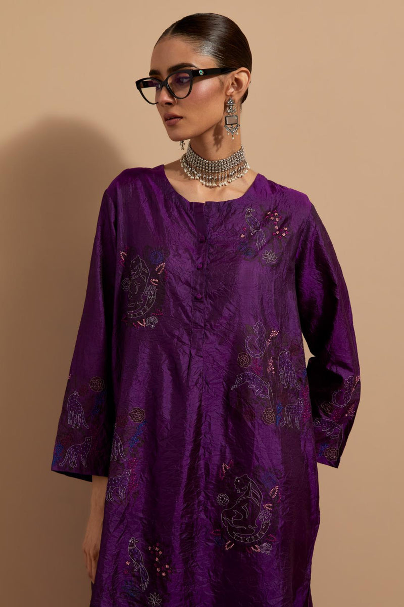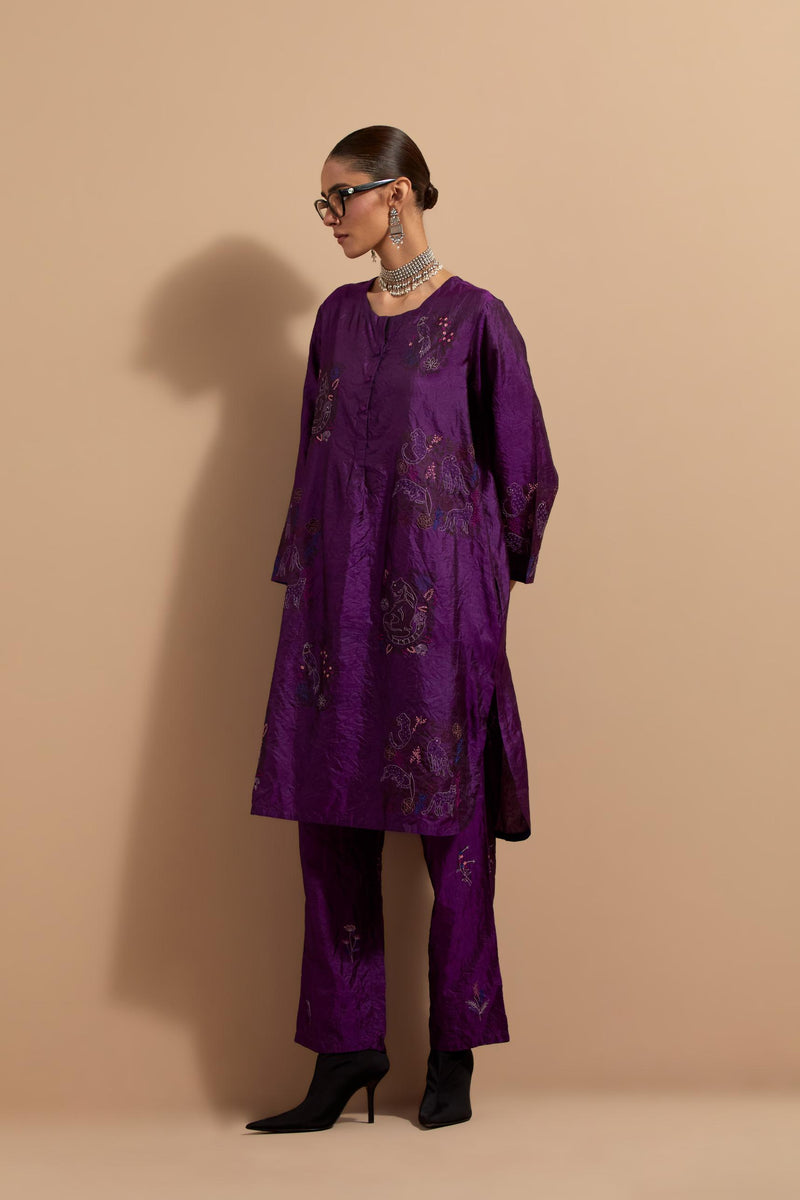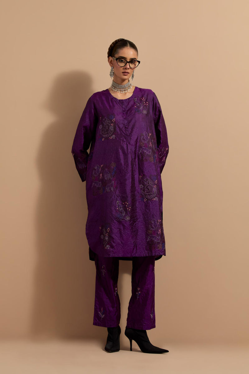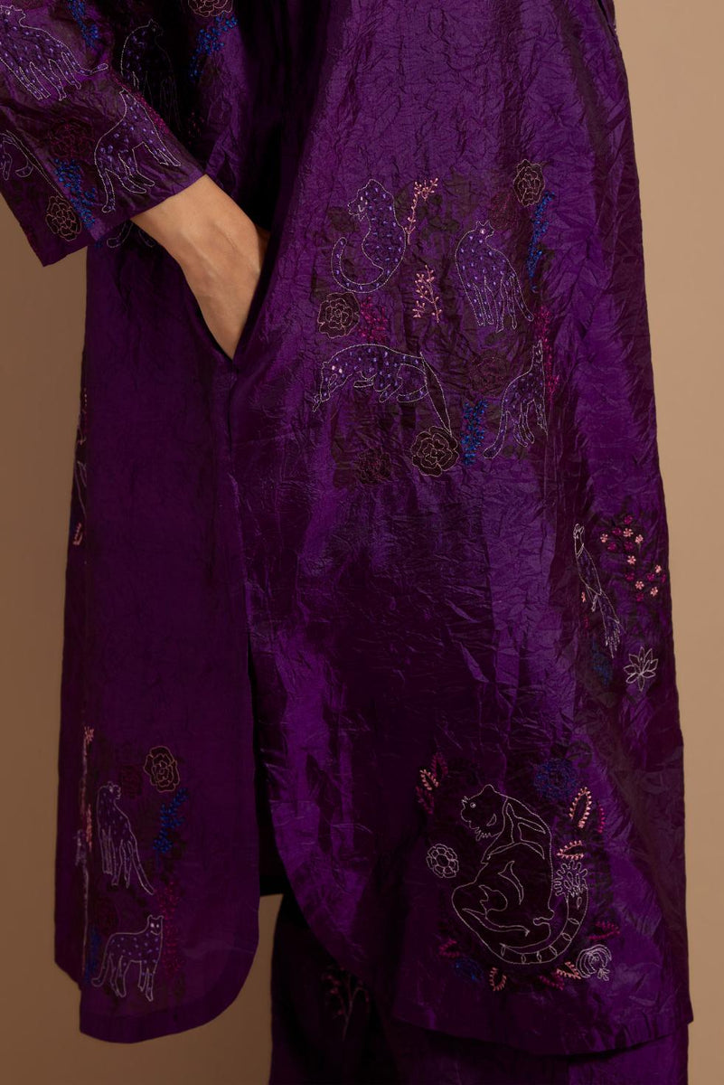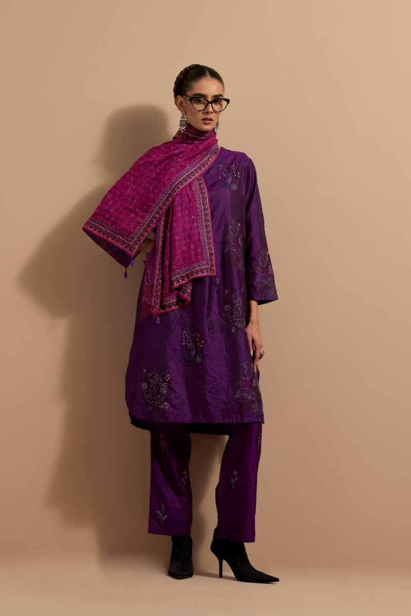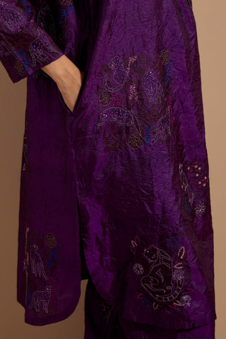 Purple crushed silk short kurta with hand block print, highlighted with multi colored thread embroidery. It has a round neck with button placket in the front, side pockets, 3/4 sleeves and round hem. Paired with Purple crushed silk hand block printed pants, highlighted with multi colored thread embroidery. It has an elasticated waist at back and drawstrings in front for better fitting and side pockets. Comes with Mauve hand crushed block printed silk stole with quilted embroidery and beaded tassels at all four corners.