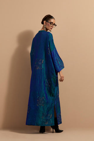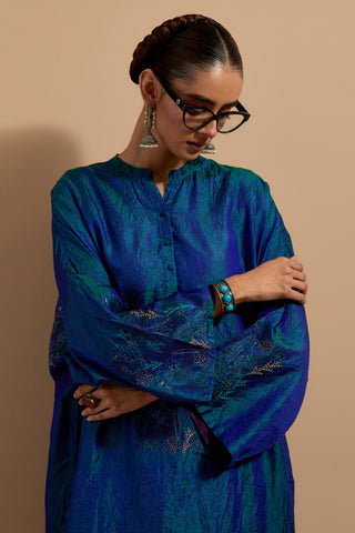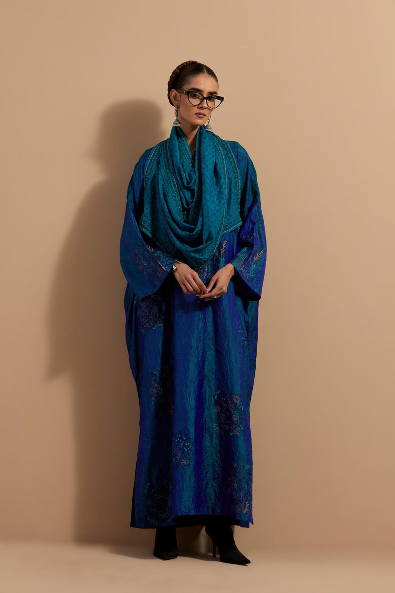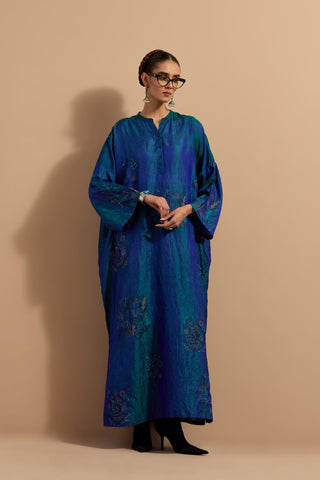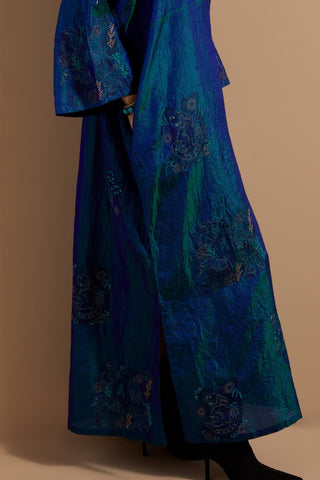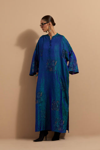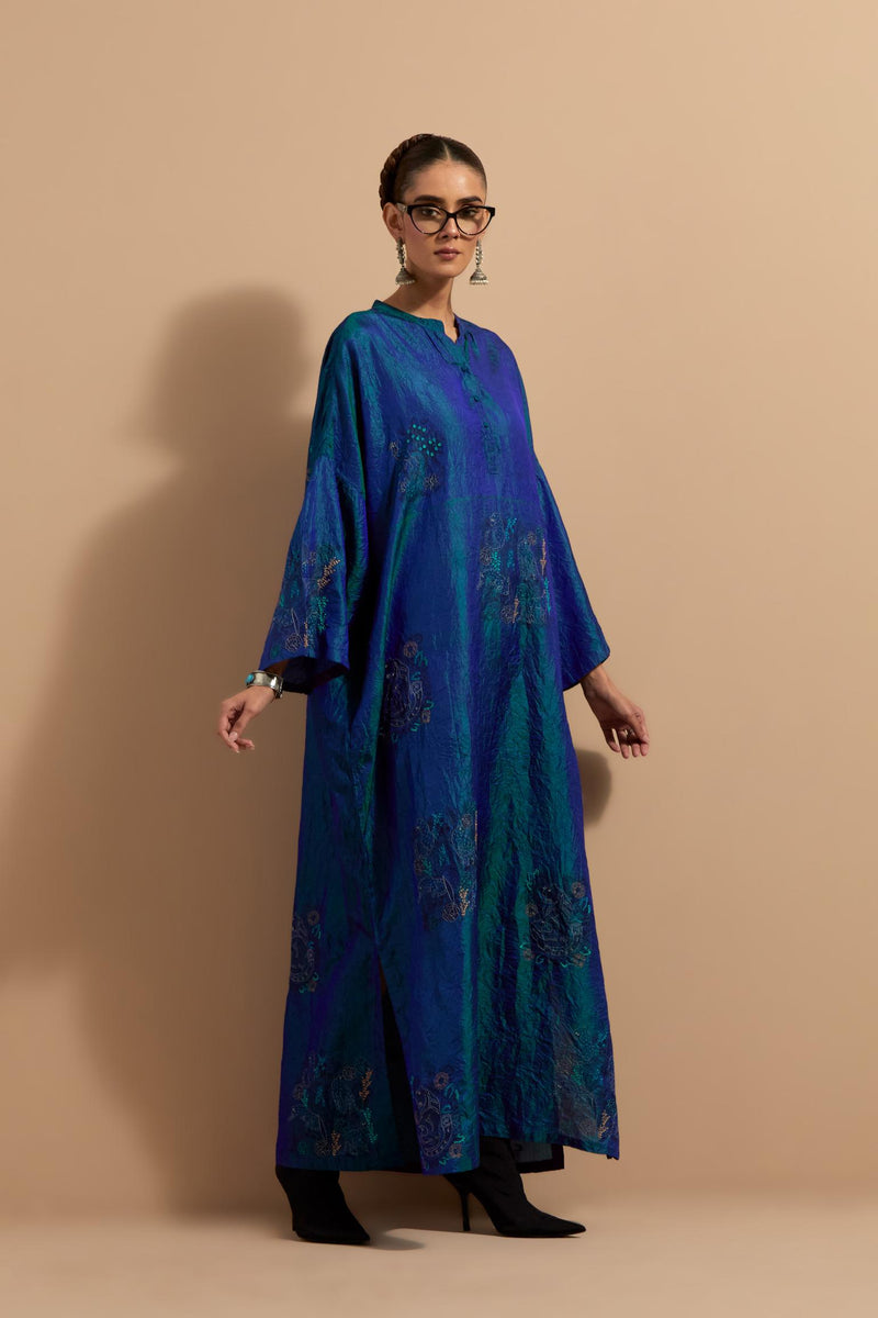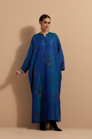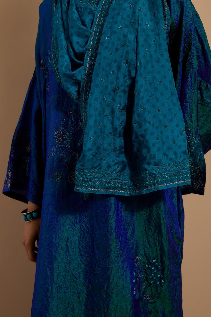 Teal blue crushed silk hand block printed long kaftan, highlighted with multi colored thread embroidery. It has a round collar neckline with button placket in the front and side pockets. Paired with light Teal hand crushed block printed silk stole with quilted embroidery and beaded tassels at all four corners.