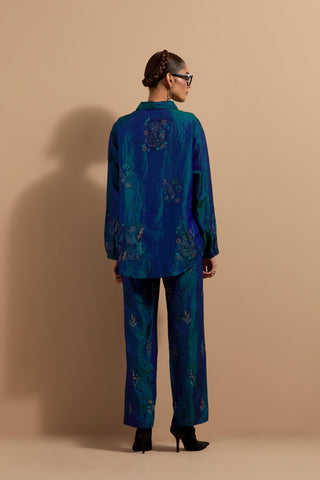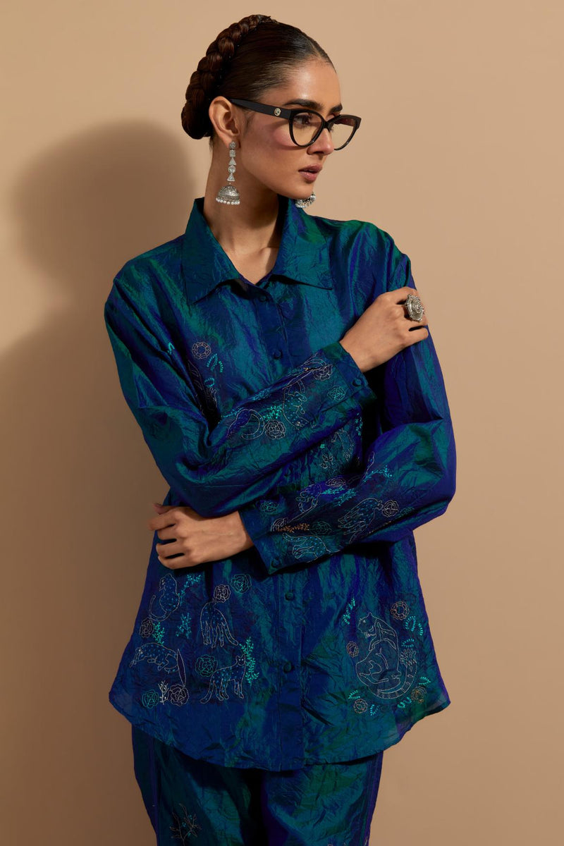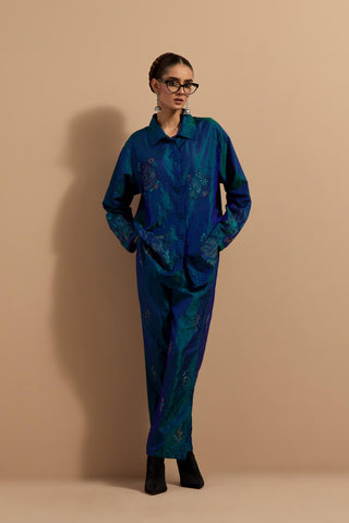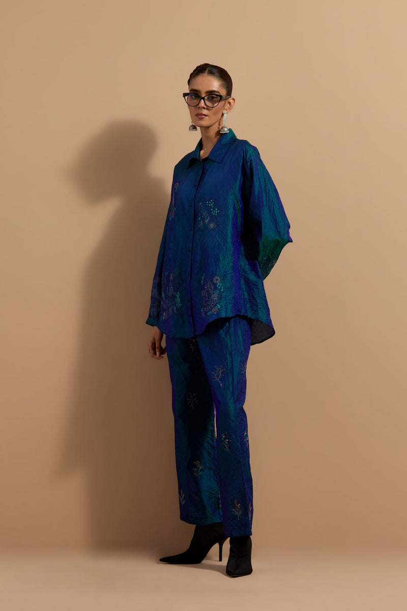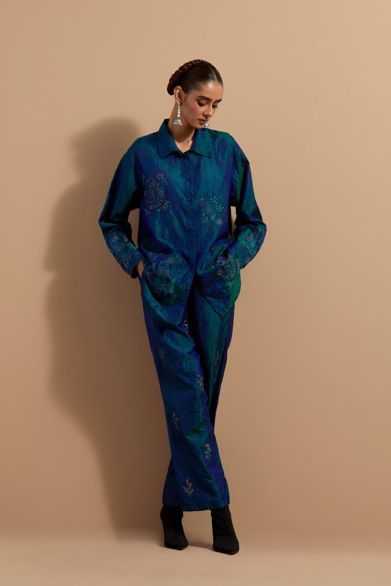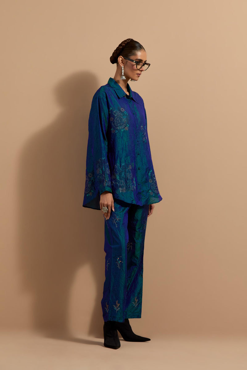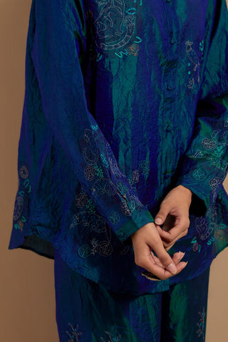 Teal blue crushed silk hand block printed shirt, highlighted with multi colored thread embroidery. It has a shirt collar neckline with button placket in the front and full sleeves. Paired with Teal blue crushed silk hand block printed pants, highlighted with multi colored thread embroidery. It has an elasticated waist at back and drawstrings in front for better fitting and side pockets.