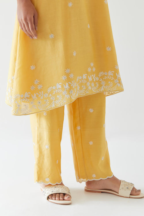 Yellow silk chanderi straight pants with off white thread embroidery and scalloped edges at hem.