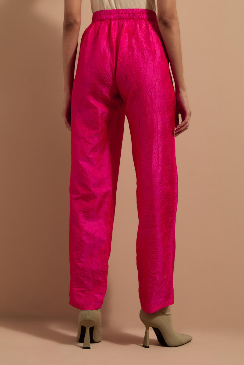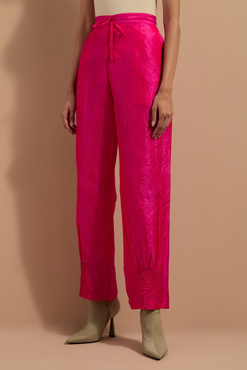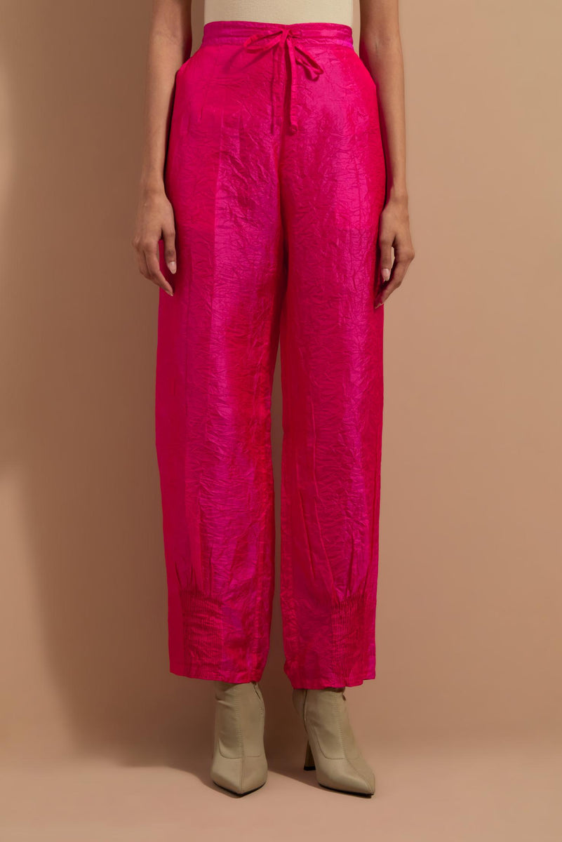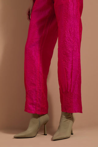 Fuchsia crushed silk hand block printed pants with pin tucks detailing at hem. It has an elasticated waist at back and drawstrings in front for better fitting and side pockets.