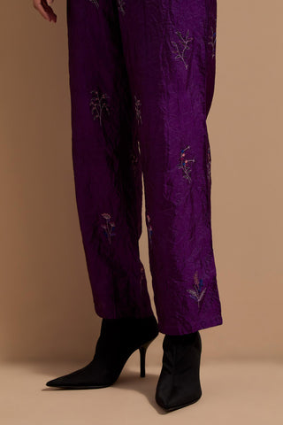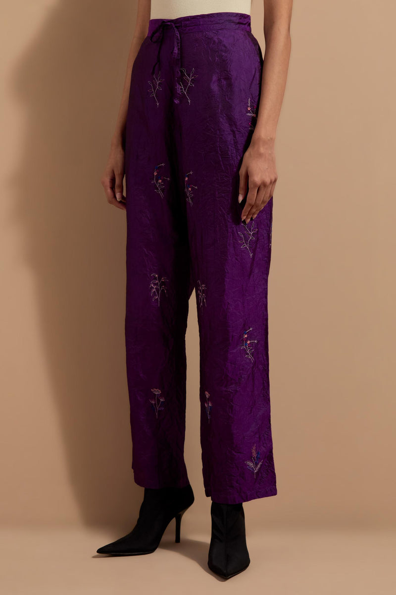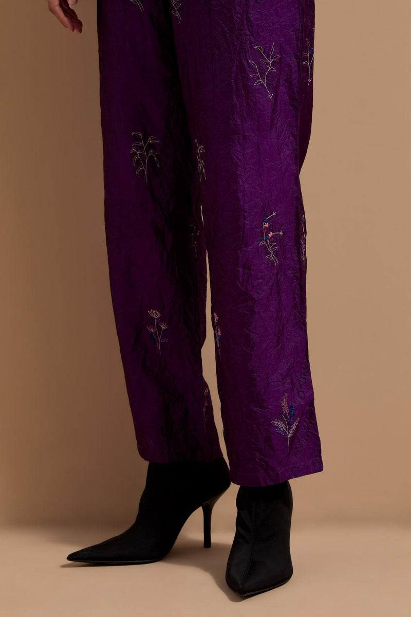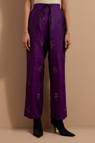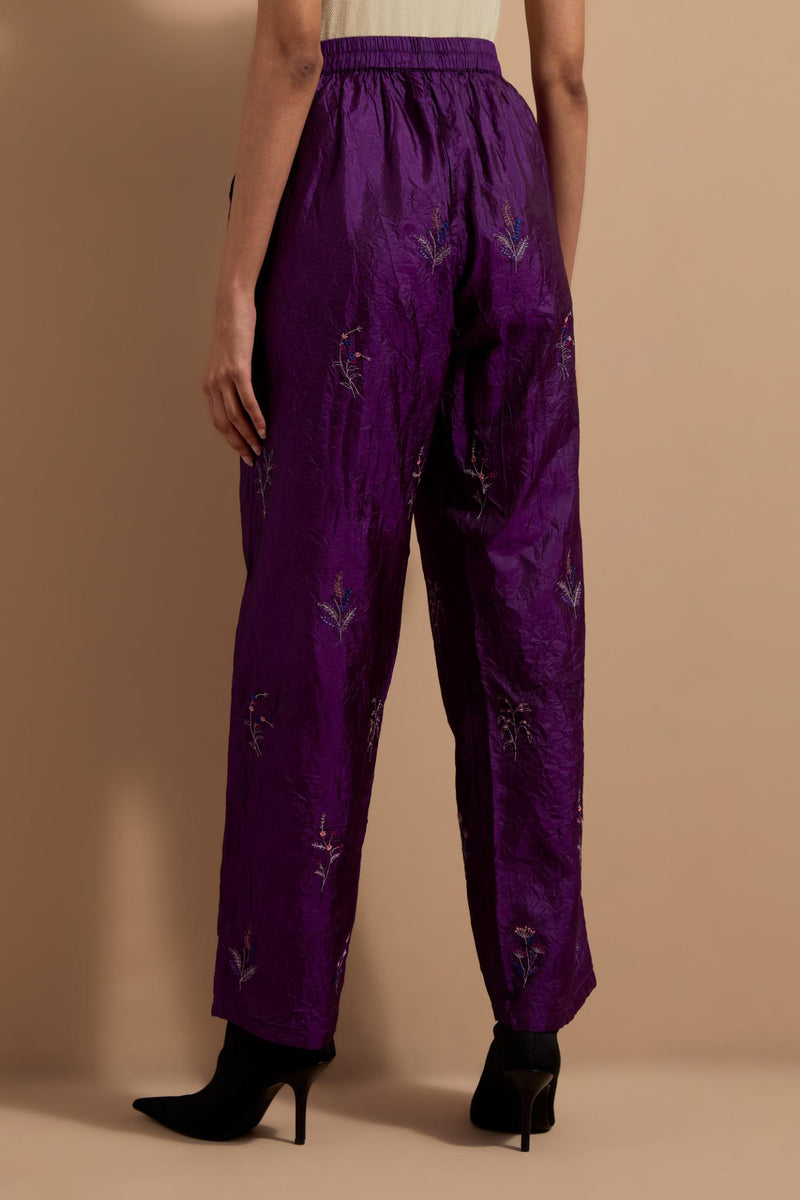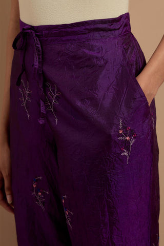 Purple crushed silk hand block printed pants, highlighted with multi colored thread embroidery. It has an elasticated waist at back and drawstrings in front for better fitting and side pockets.