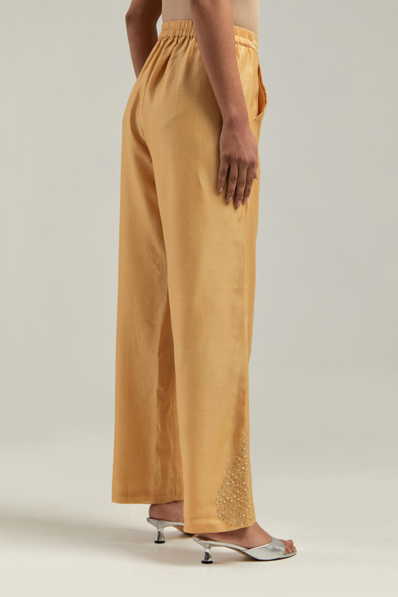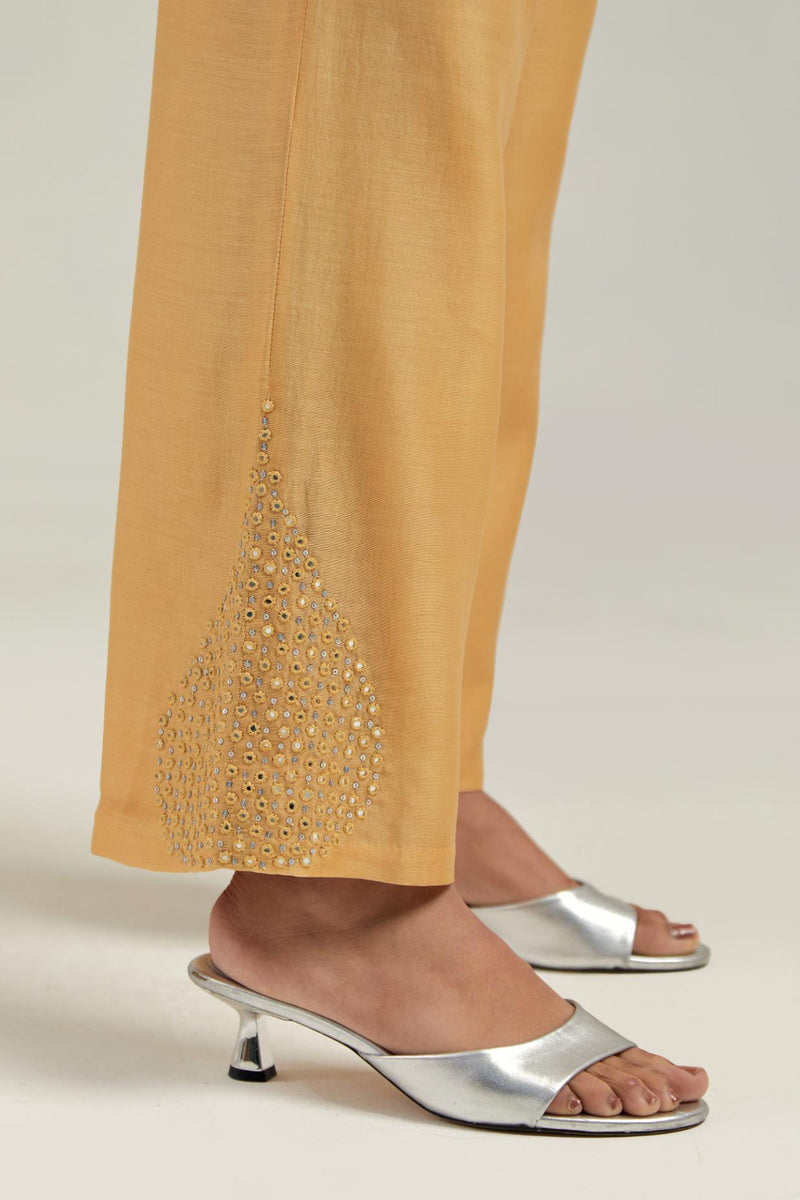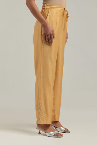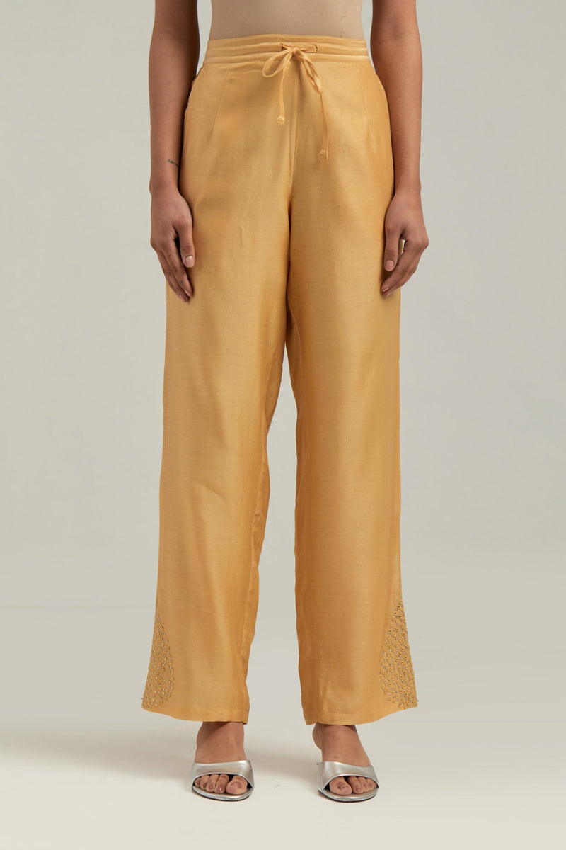 Yellow Silk Chanderi pants with hand embroidered leaf motifs with delicate mirror & sequins work at hem. It has an elasticated back and drawstring in the front for better fitting. The garment is fully lined.