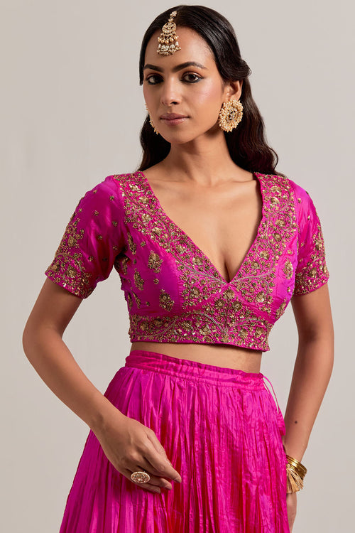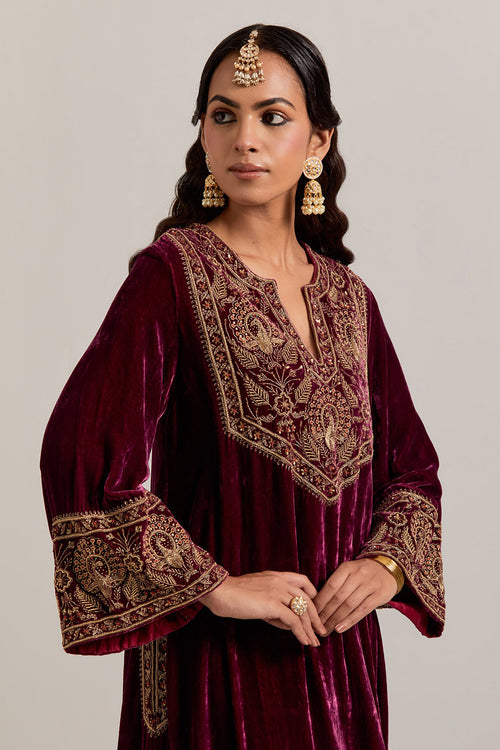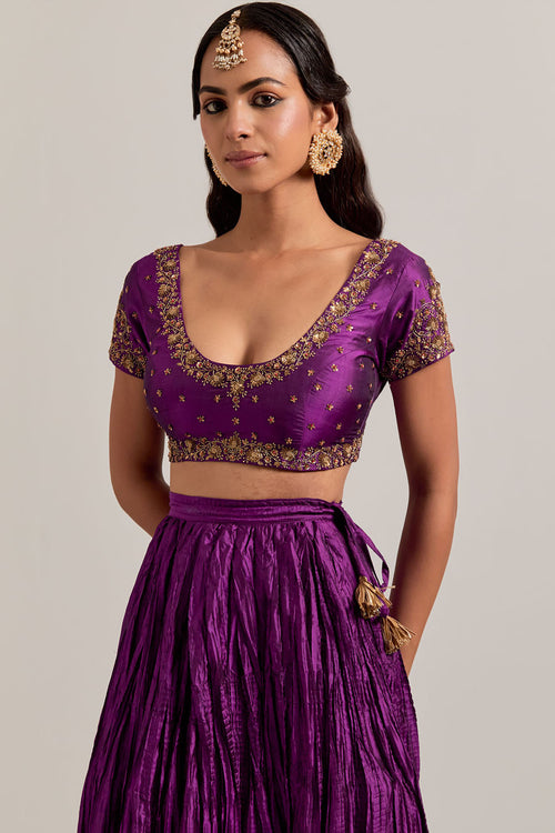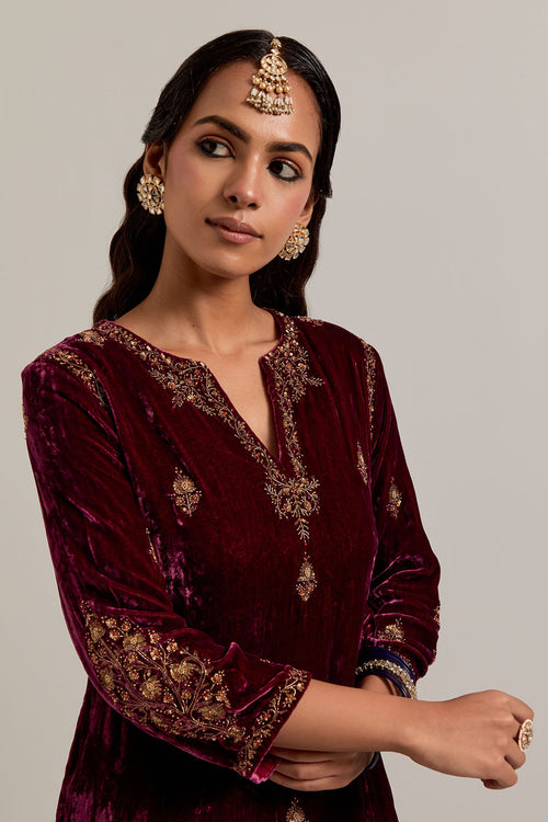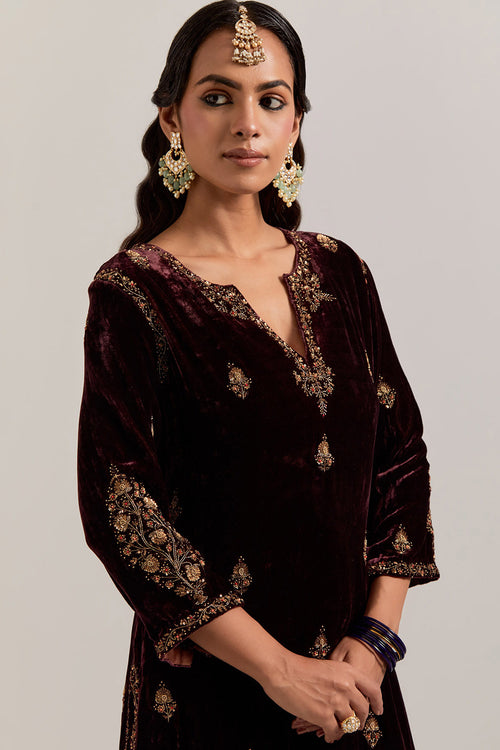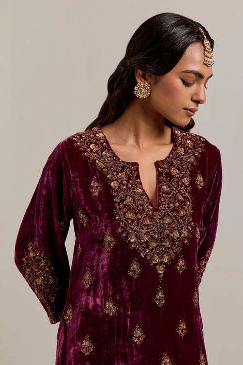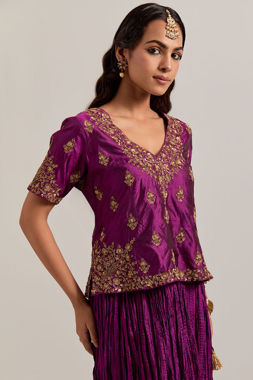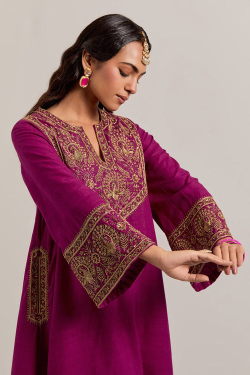 Lilac silk chanderi kurta set with gota embroidered neckline and hem