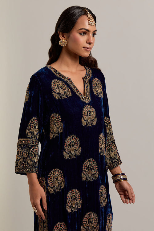 Asymmetric hand block printed kurta set with hand scalloped neck