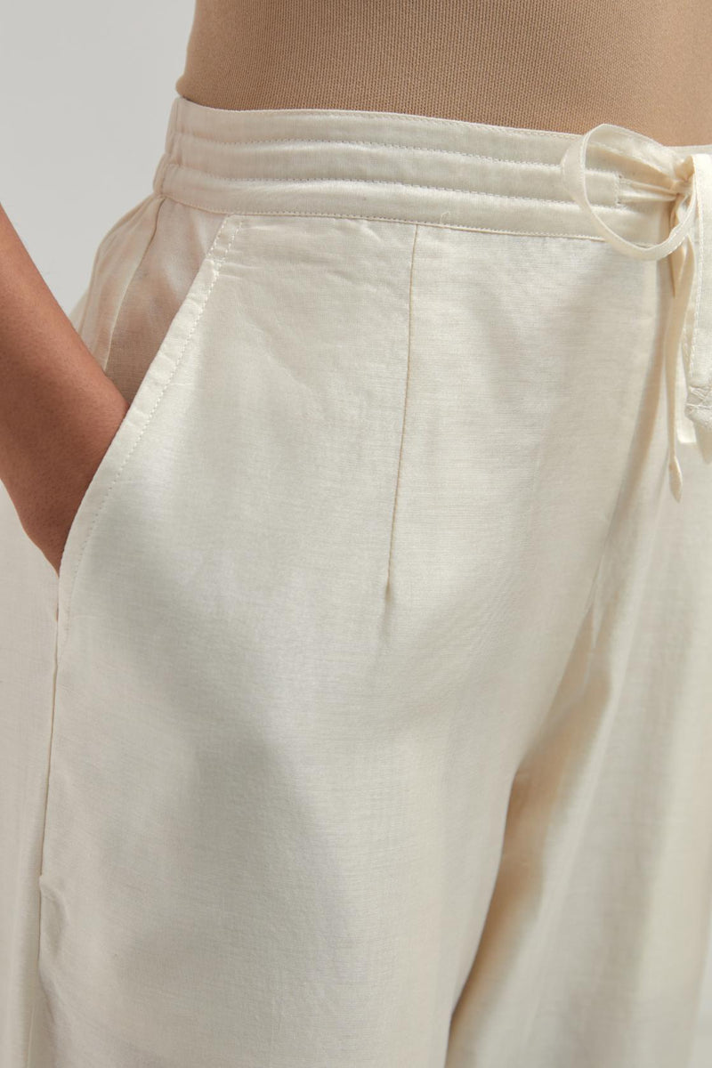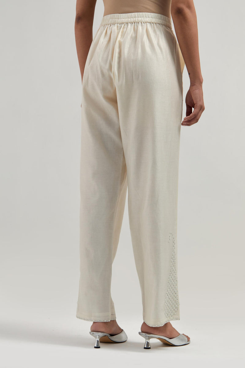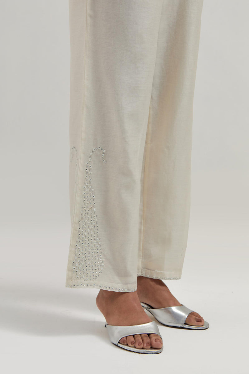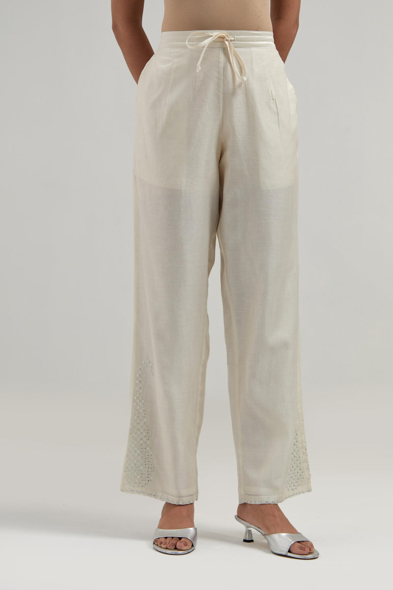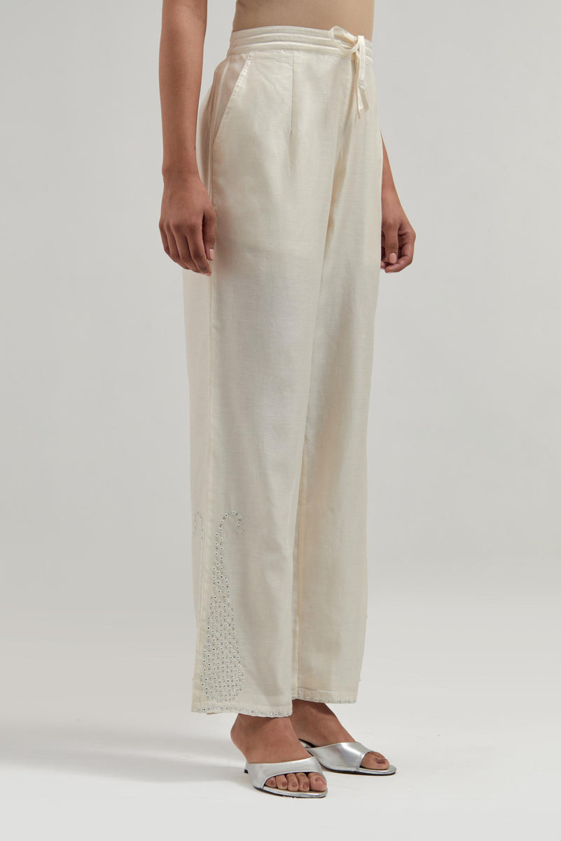 Off white silk Chanderi pants with hand-embroidered paisley motifs with delicate mirror and sequins work at the hem. It has an elasticated back and drawstring in the front for better fitting. The garment is fully lined.
