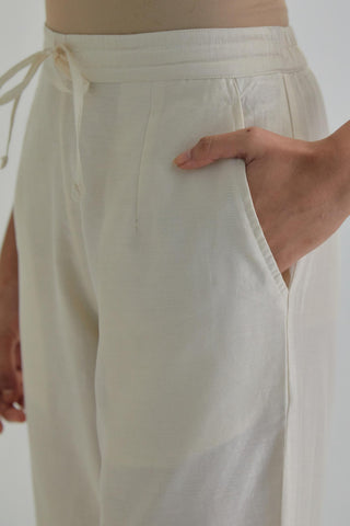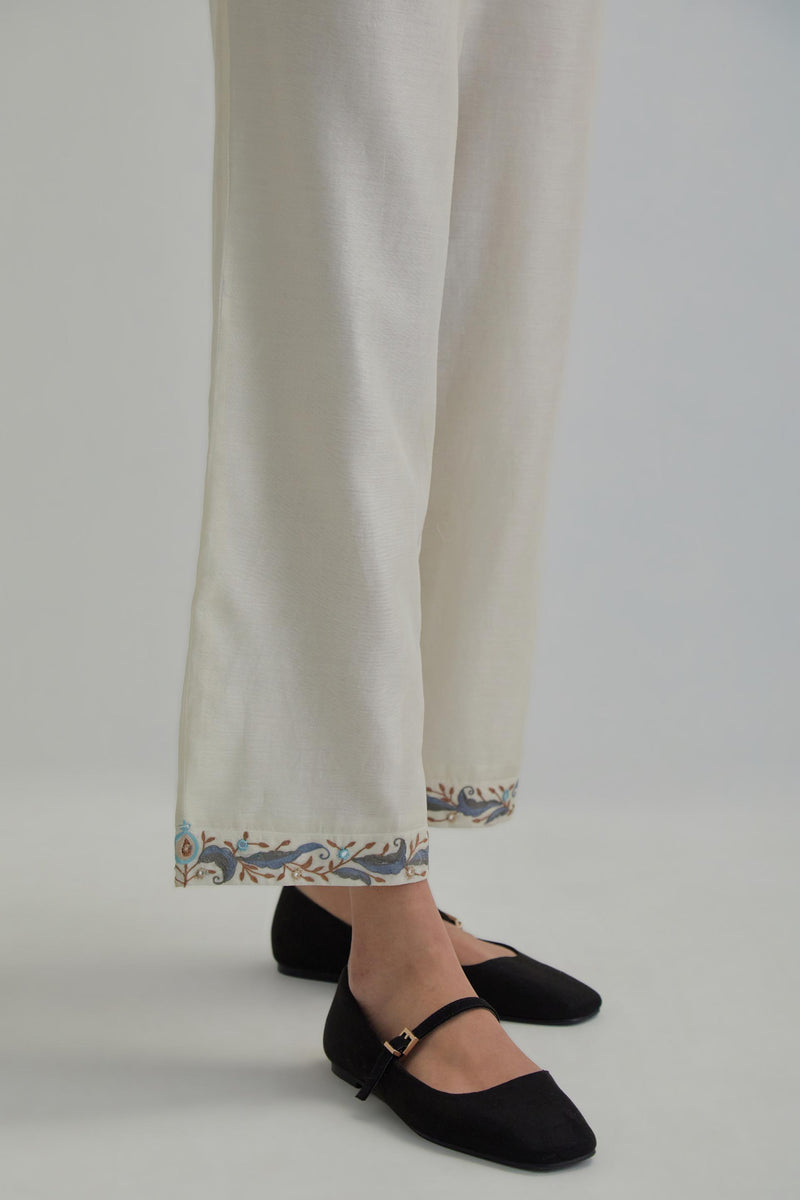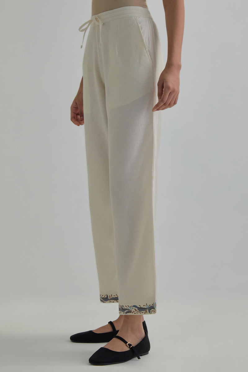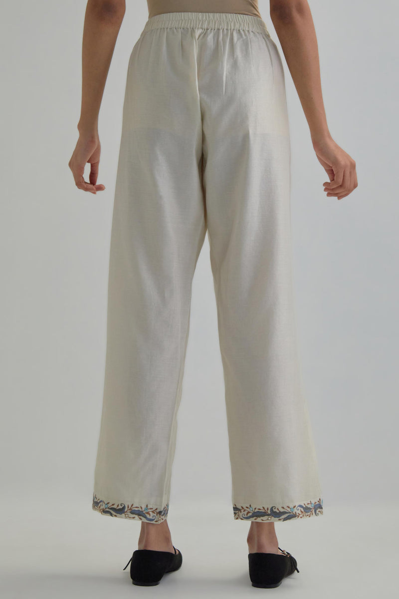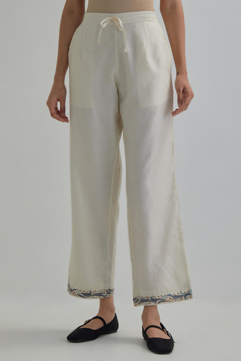 Off White silk Chanderi straight pants with earthy coloured Aari work at hem. It has an elasticated back and drawstring in front for better fitting and side pockets. The garment is fully lined.