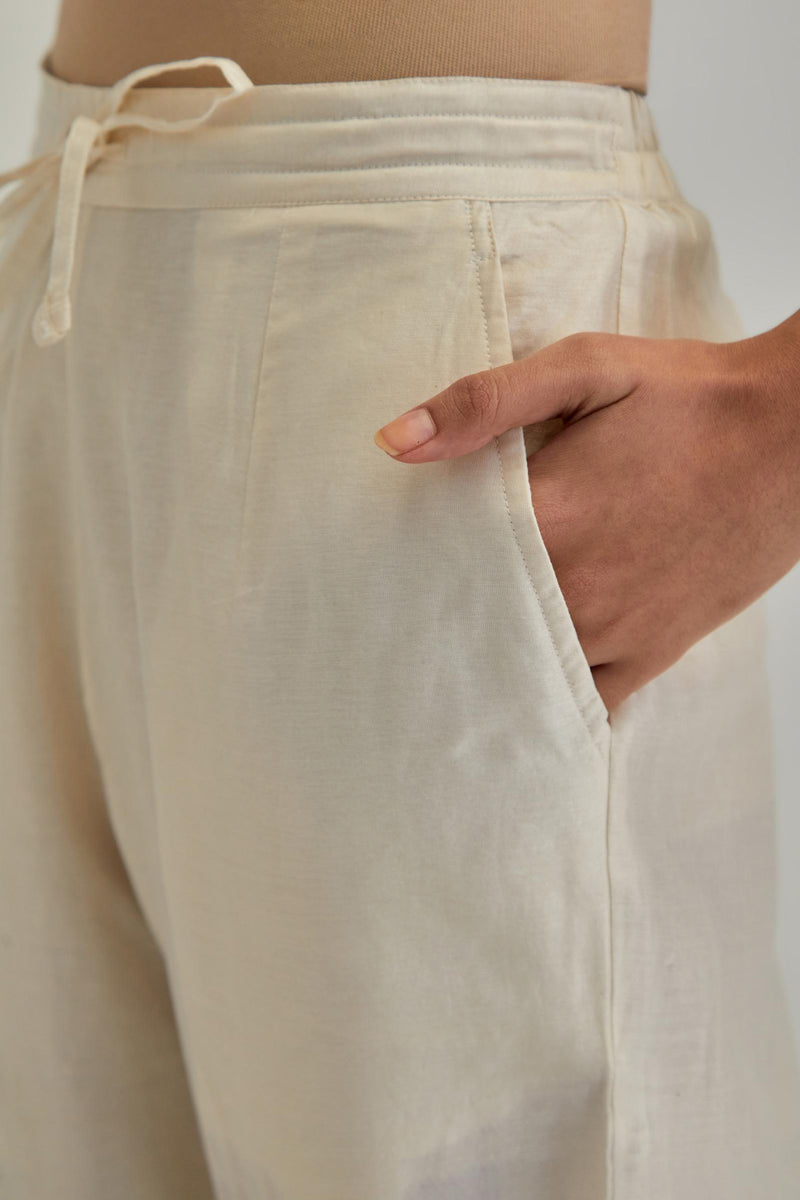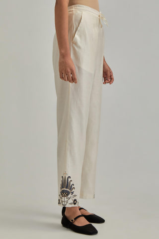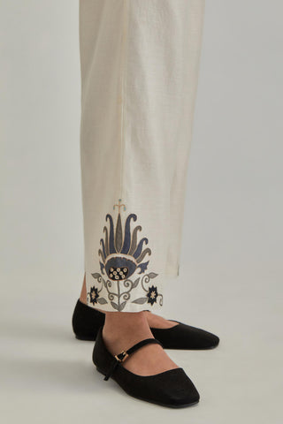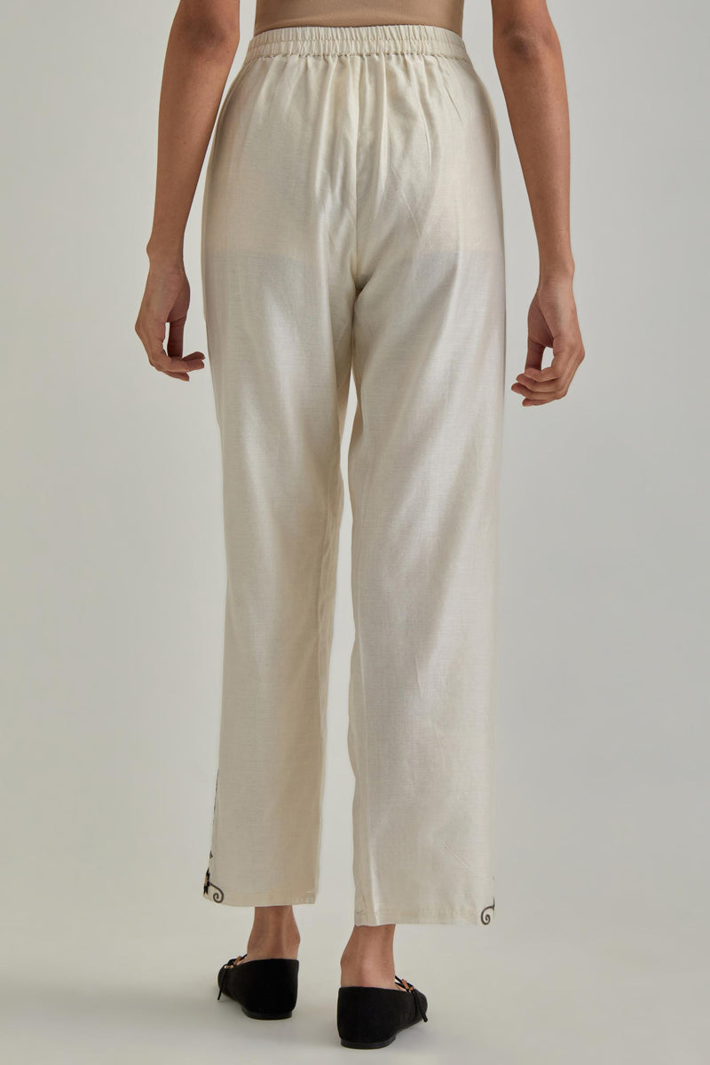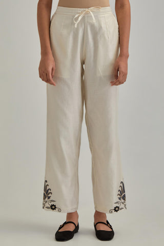Off White silk Chanderi straight pants with earthy coloured appliqué at hem. It has an elasticated back and drawstring in front for better fitting and side pockets. The garment is fully lined.