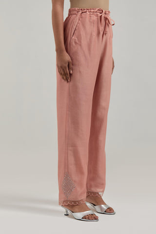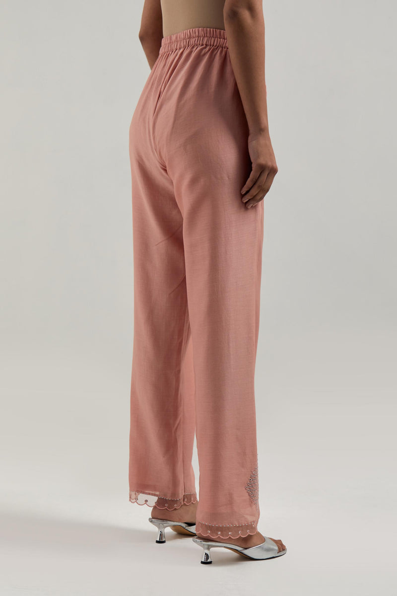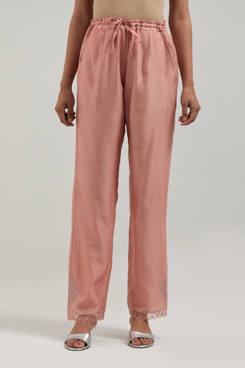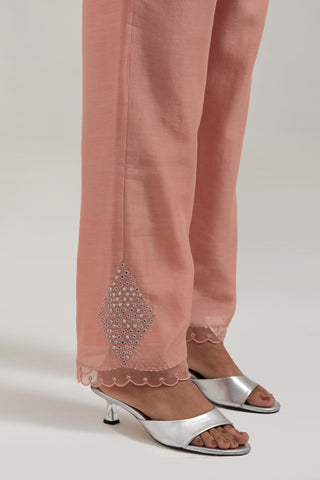 Peach silk Chanderi straight pants with narrow organza scalloped hem and hand-embroidered diamond motifs with delicate mirror & sequins work at the sides. It has an elasticated back and drawstring in the front for better fitting. The garment is fully lined.