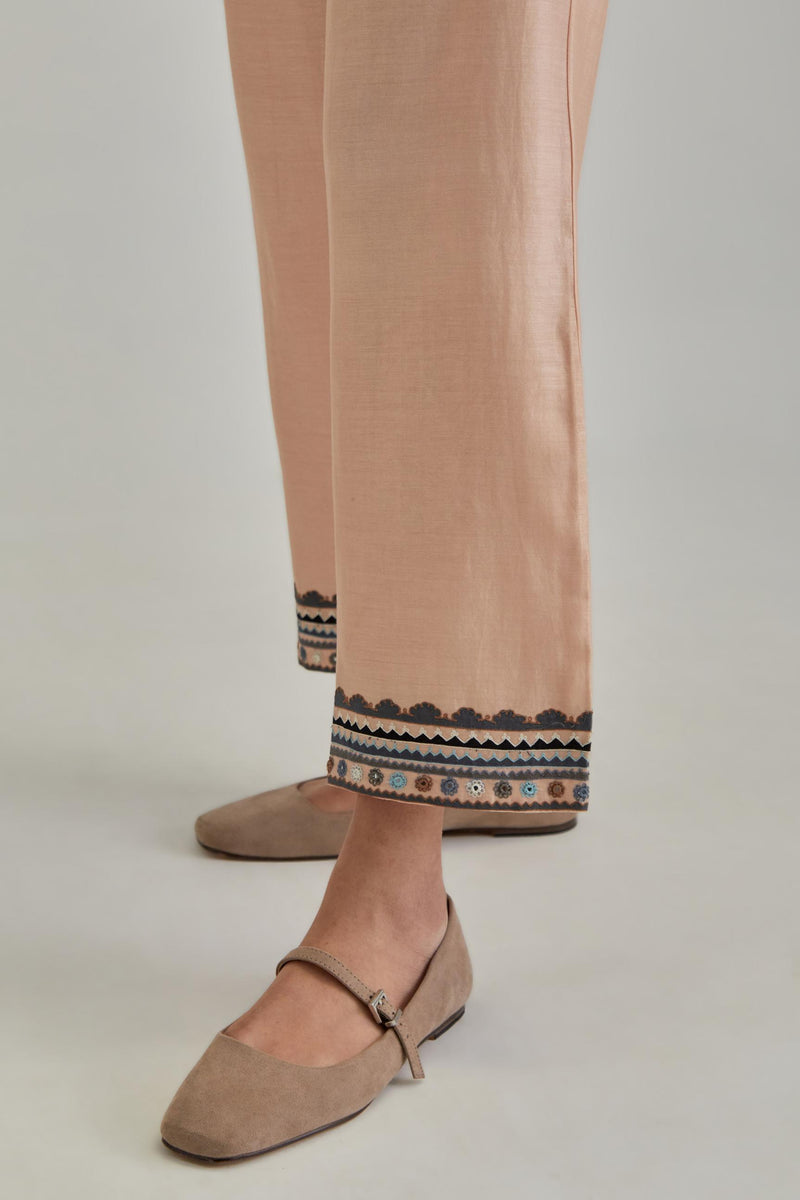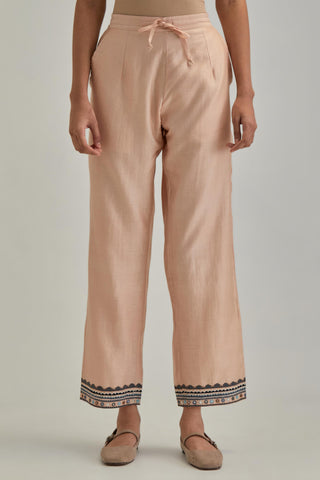 Pink silk Chanderi straight pants with earthy coloured applique and Aari thread work at hem. Sale