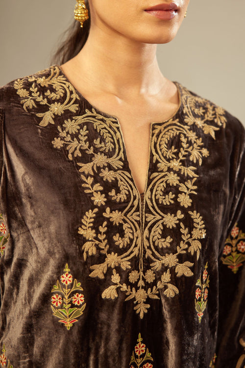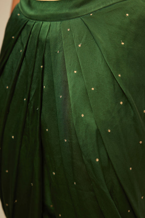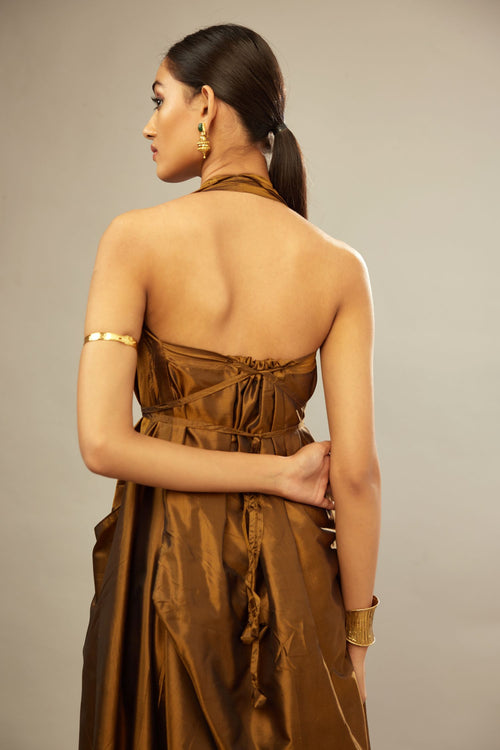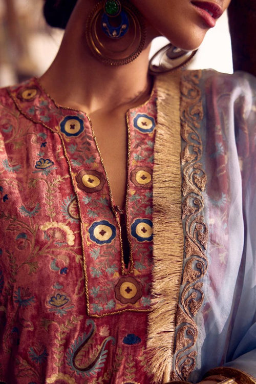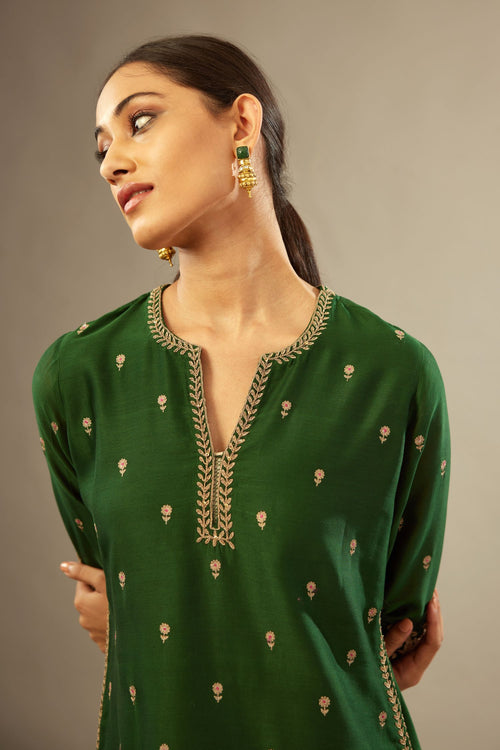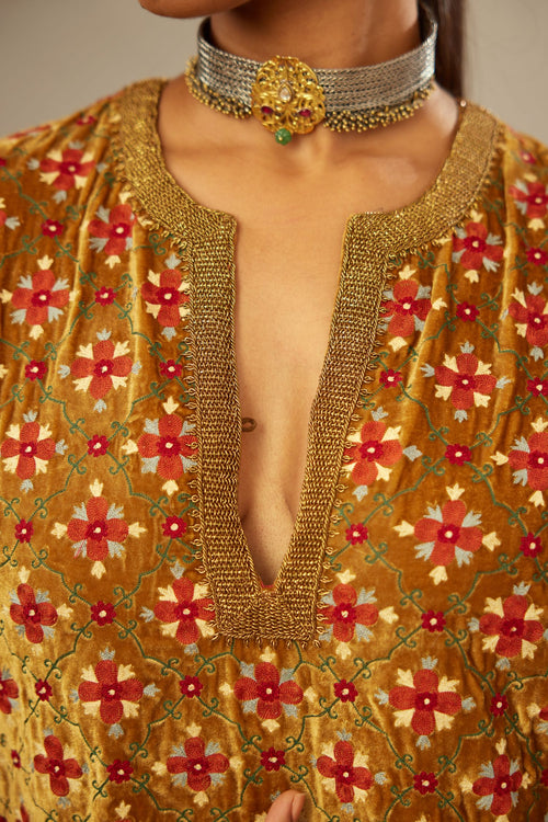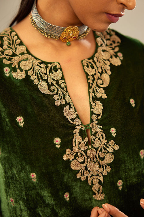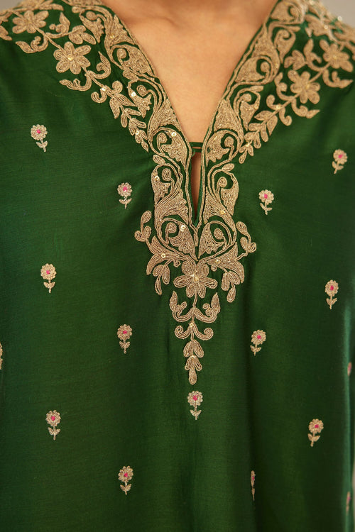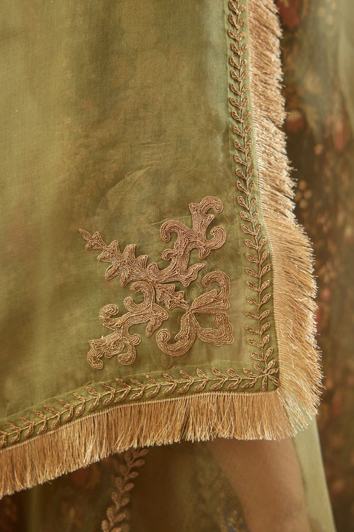 Olive silk organza dupatta detailed with all-over light gold dori embroidery.