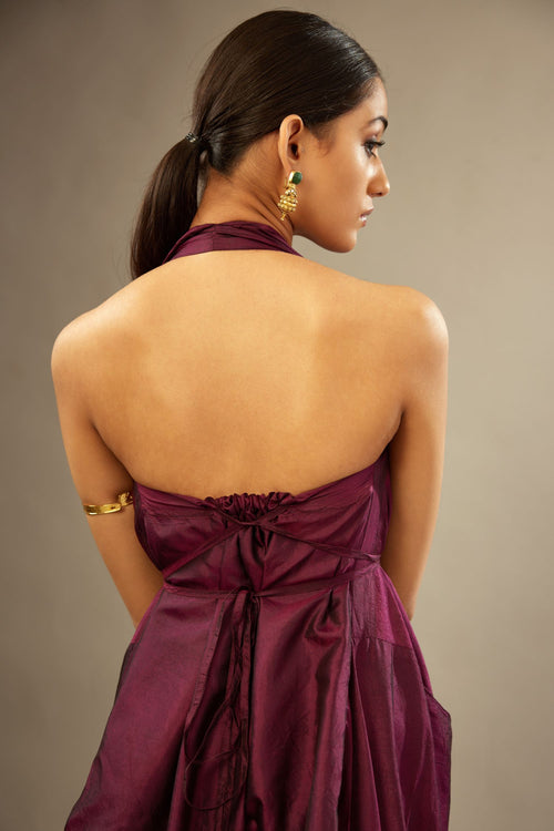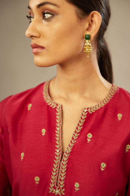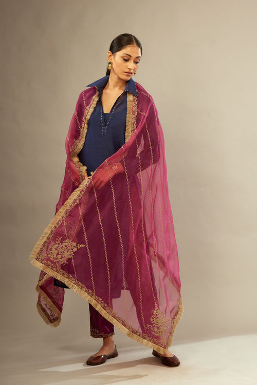 Orange silk organza dupatta detailed with all-over light gold dori embroidery.