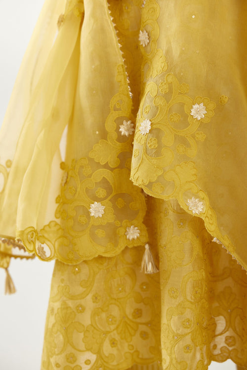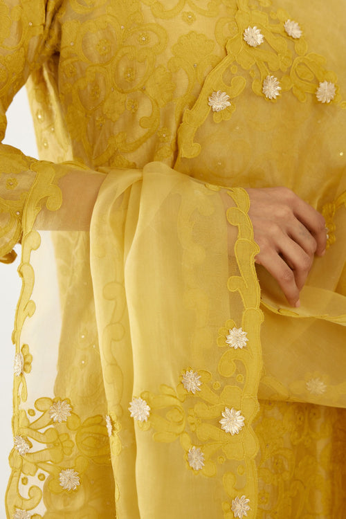 Yellow organza dupatta with heavy silk chanderi appliqué embroidery and gota flower detail.
