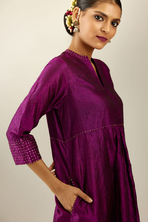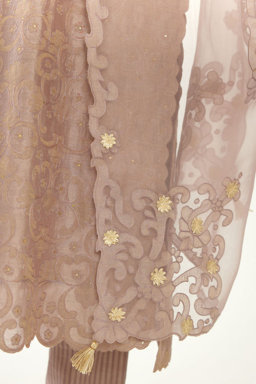 Lilac organza dupatta with heavy silk chanderi appliqué embroidery and gota flower detail.