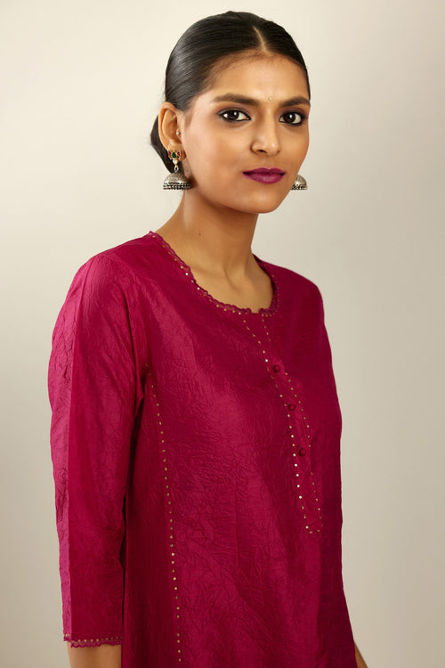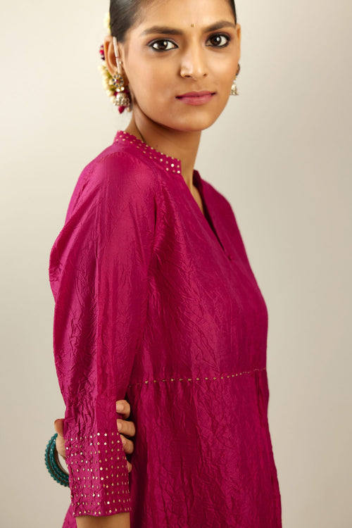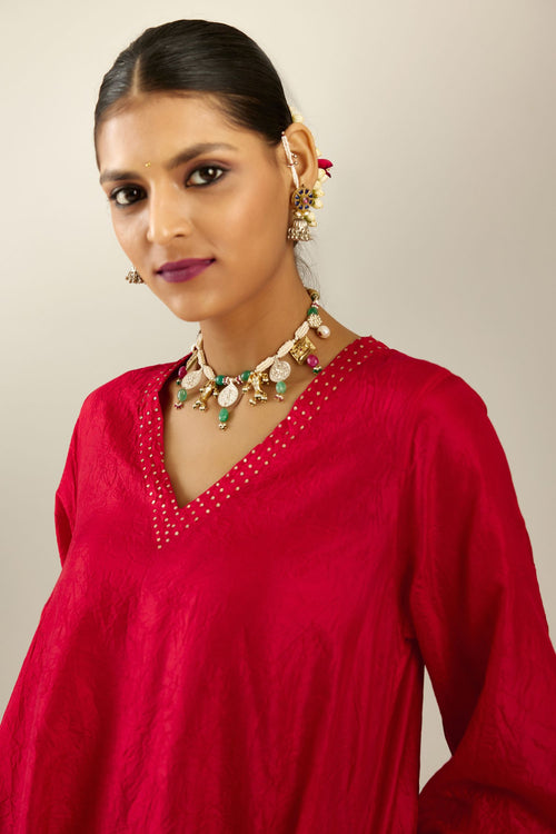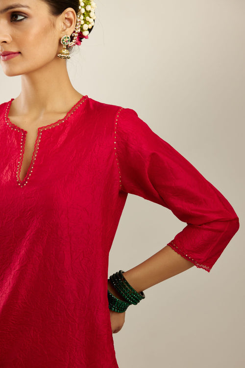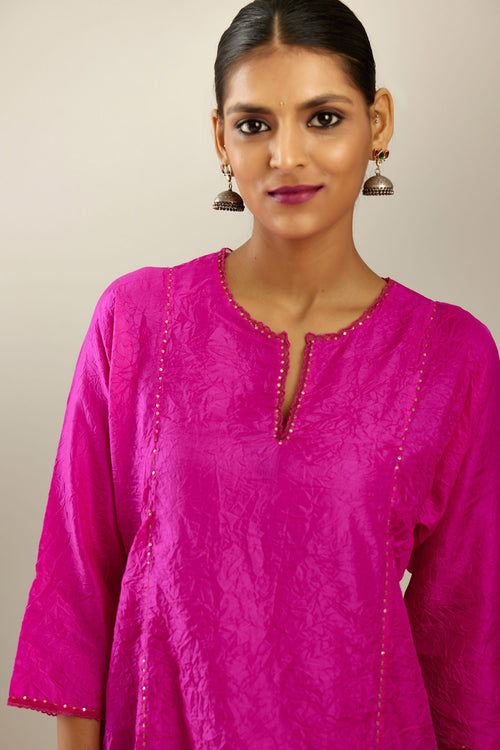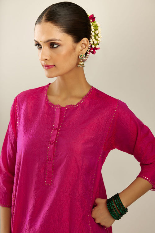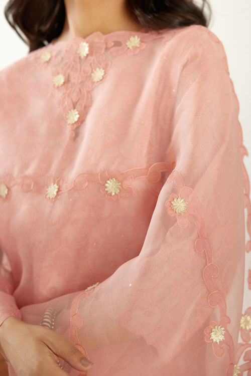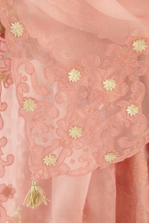 Pink organza dupatta with heavy silk chanderi appliqué embroidery and gota flower detail.