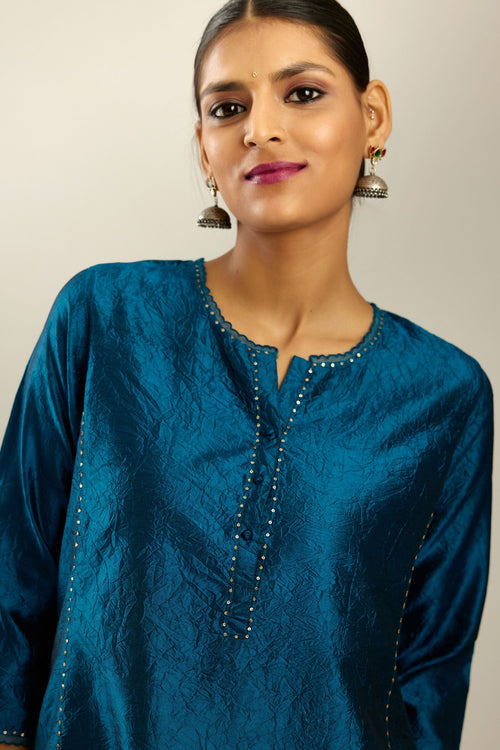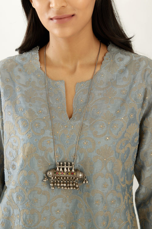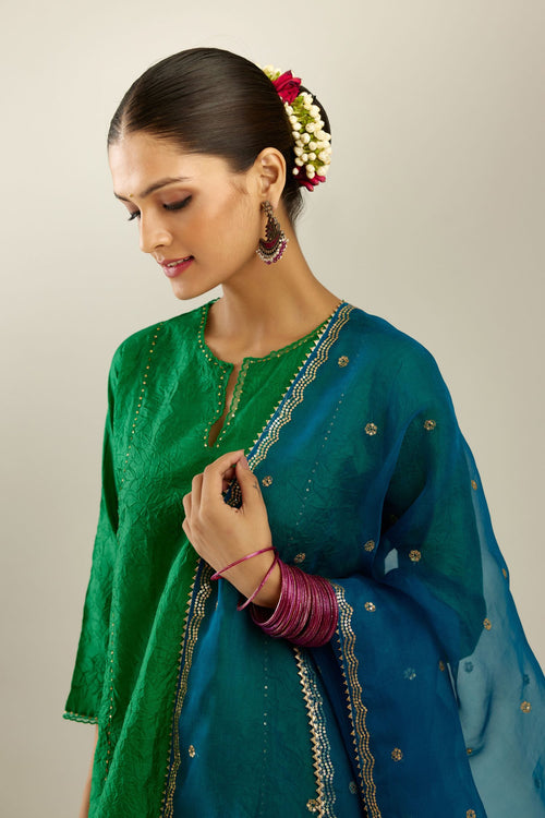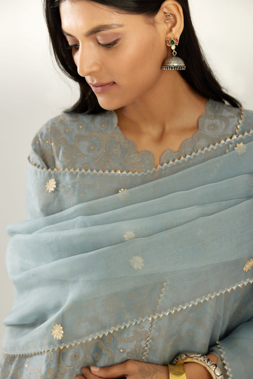 Blue organza dupatta with silk chanderi appliqué embroidery and gota flower detail.