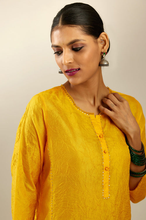 Yellow organza dupatta with silk chanderi appliqué embroidery and gota flower detail.