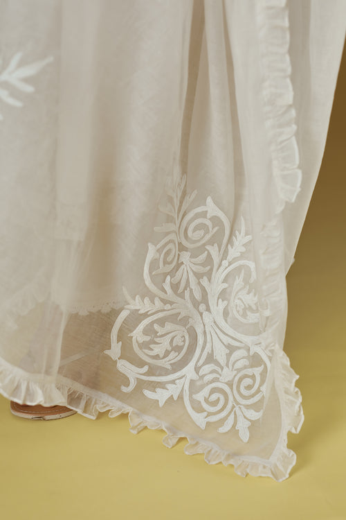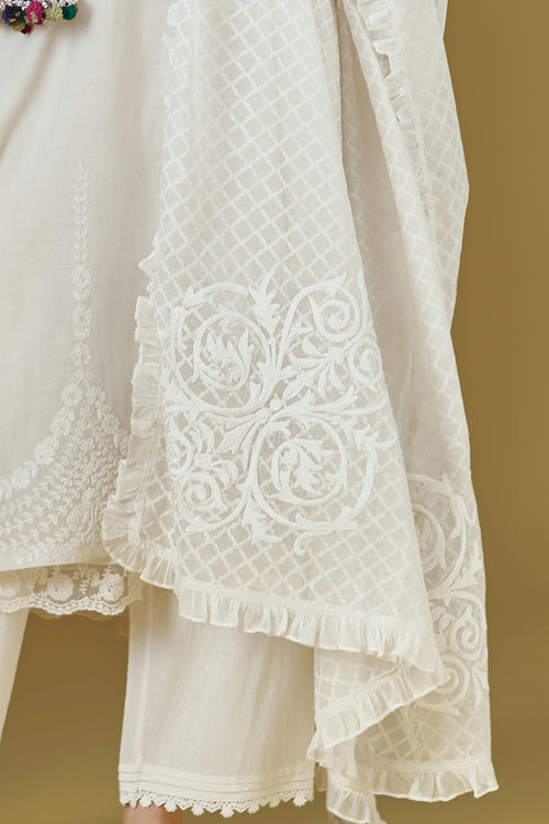 Off white cotton Chanderi dupatta highlighted with dori embroidered floral boota