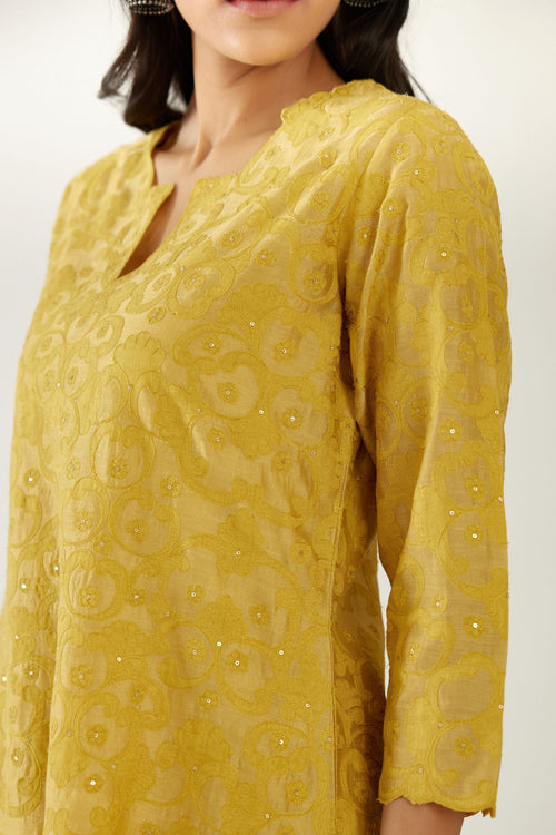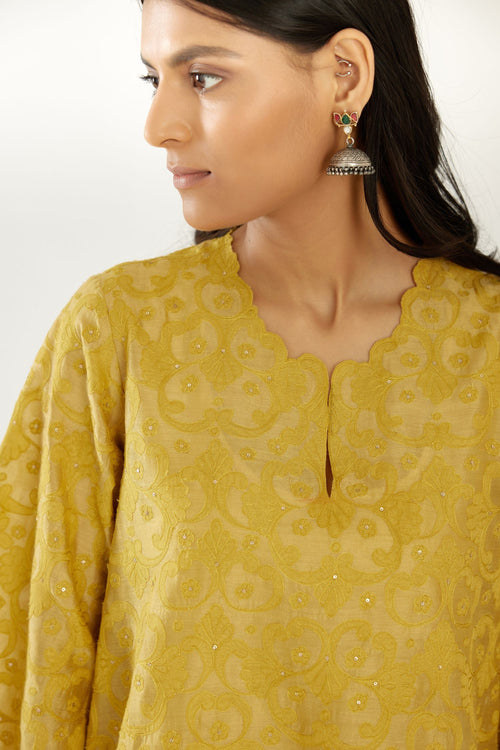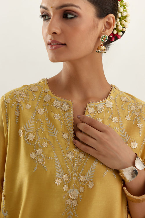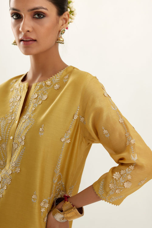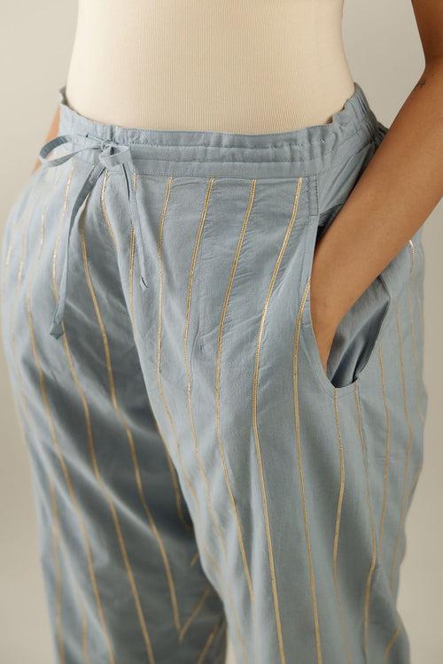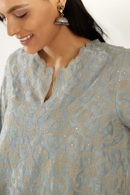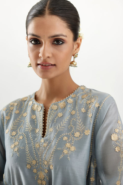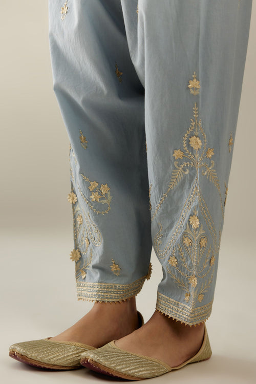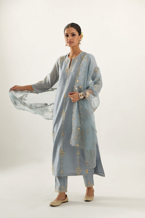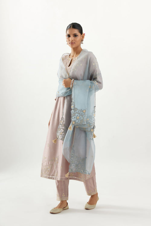 Blue organza dupatta with heavy silk chanderi appliqué embroidery and gota flower detail.