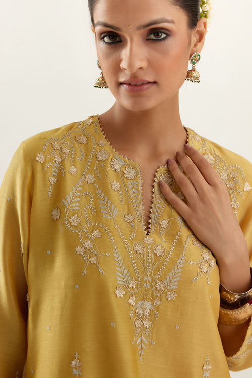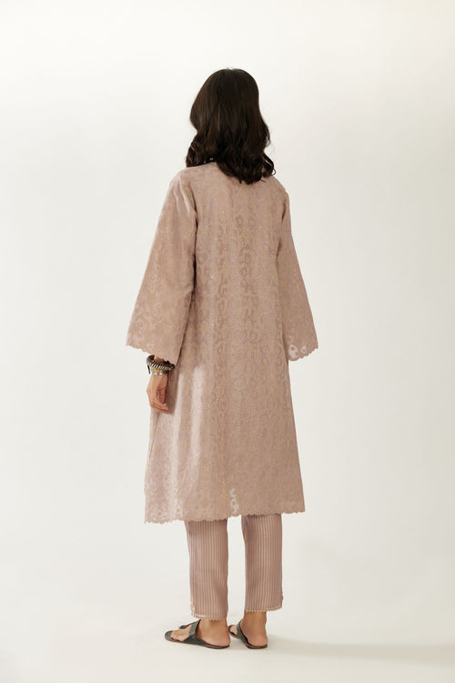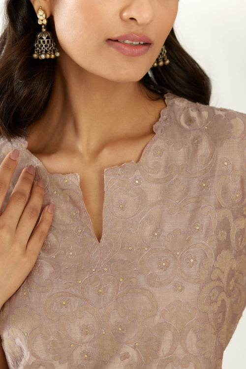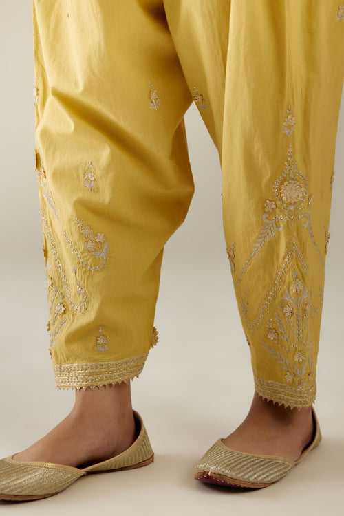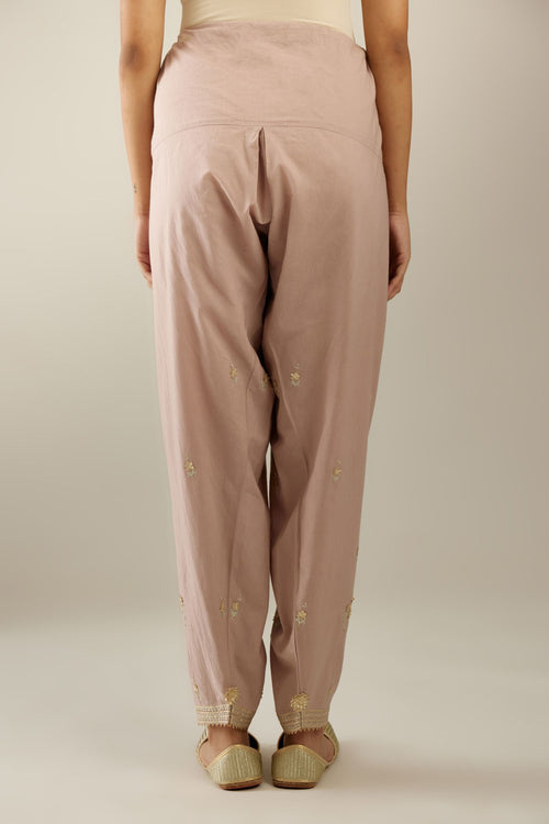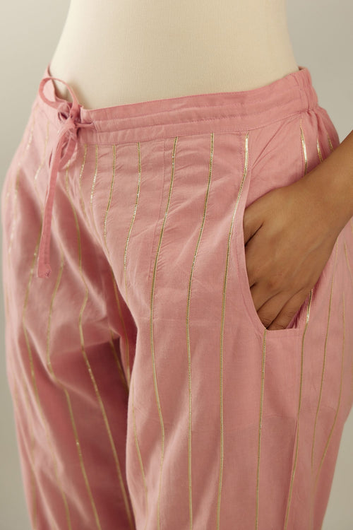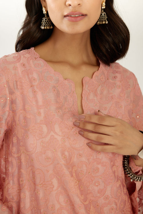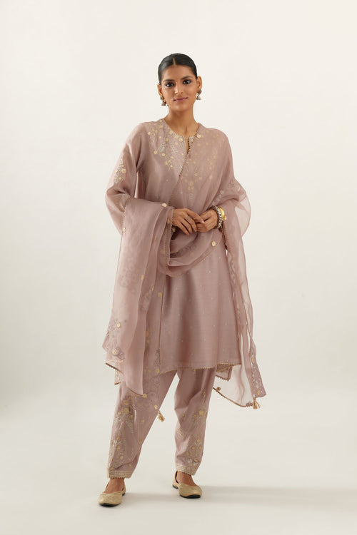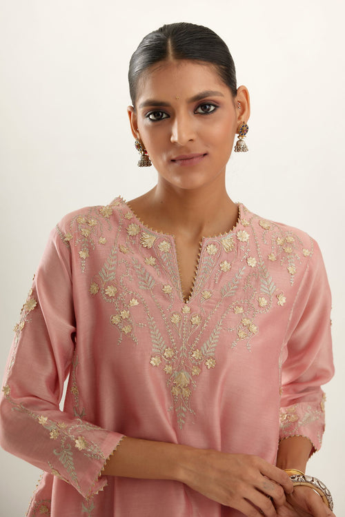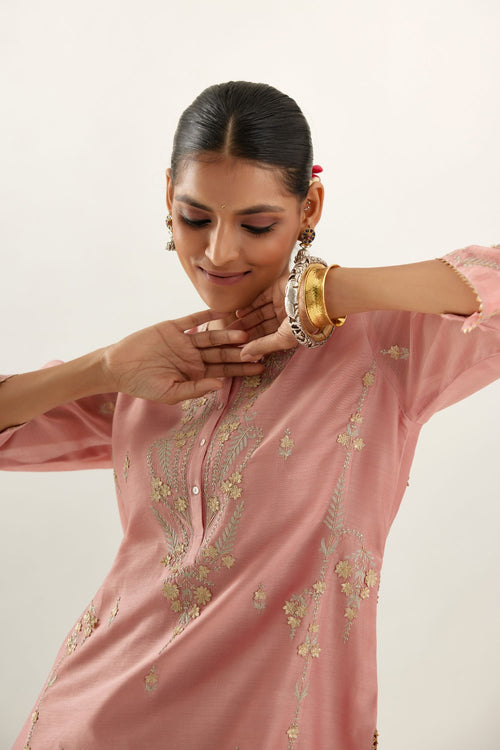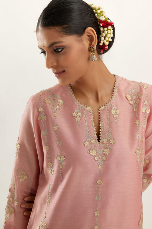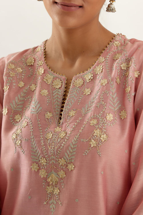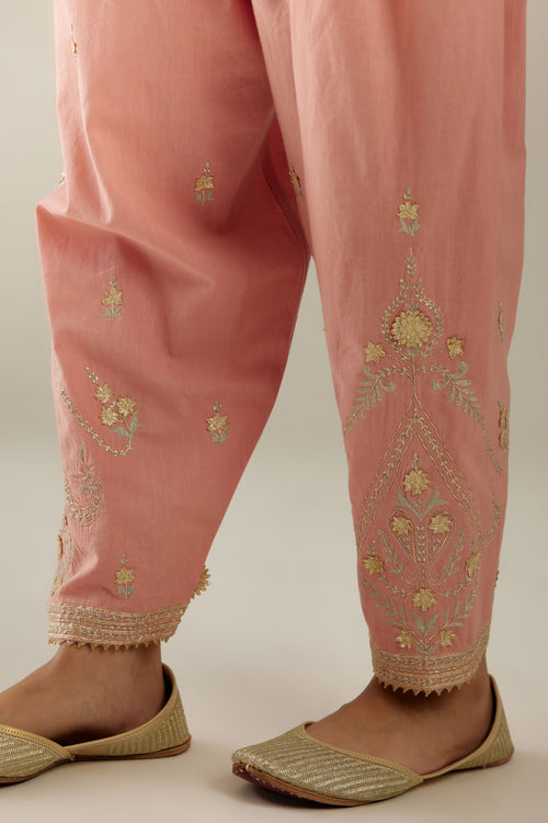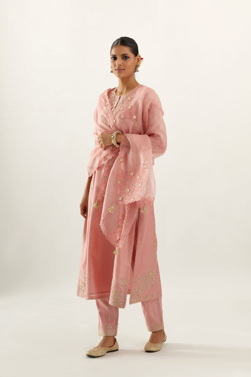 Pink organza dupatta with heavy silk chanderi appliqué embroidery and gota flower detail.