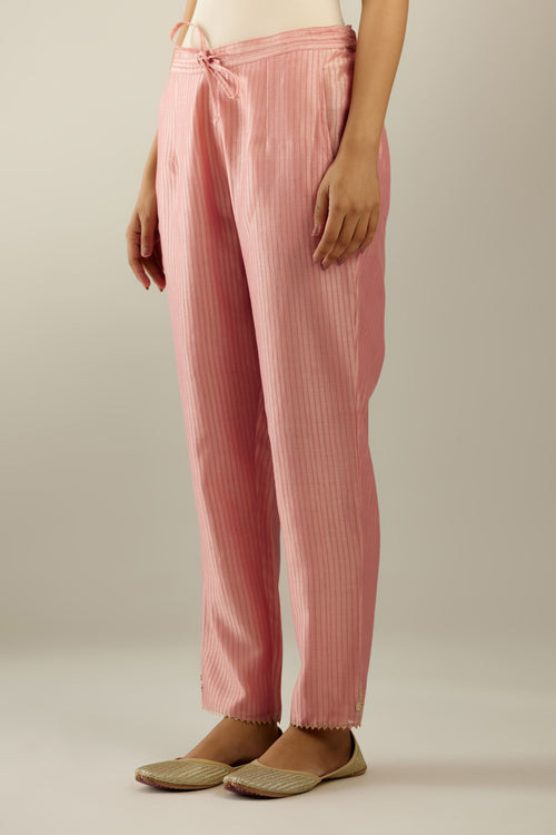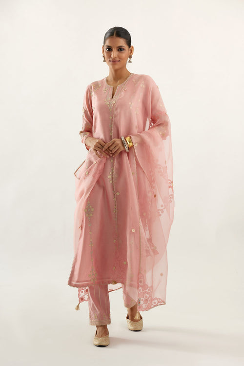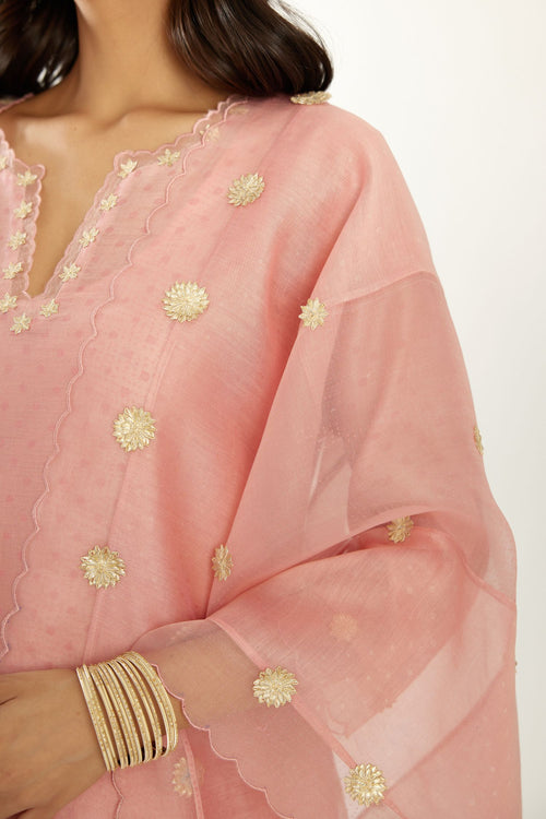 Pink organza dupatta with silk chanderi appliqué embroidery and gota flower detail.