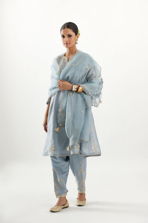 Blue organza dupatta with silk chanderi appliqué embroidery and gota flower detail.
