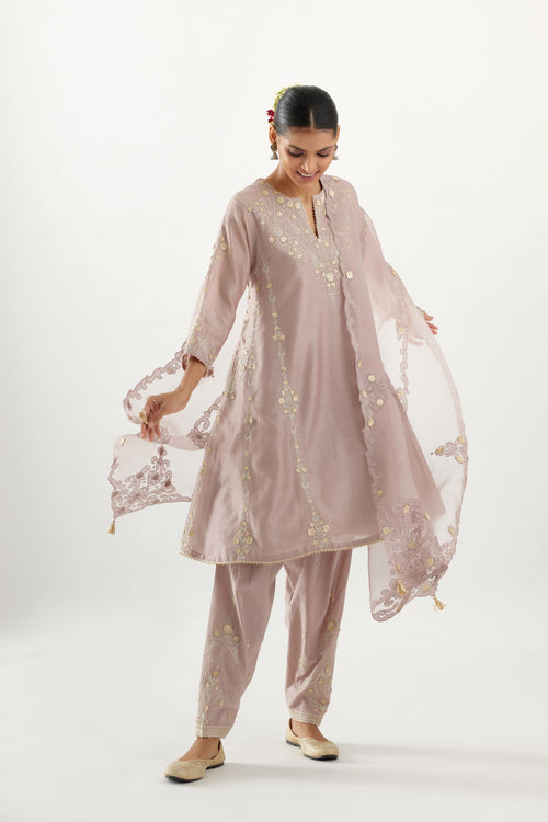 Lilac organza dupatta with heavy silk chanderi appliqué embroidery and gota flower detail.