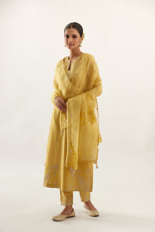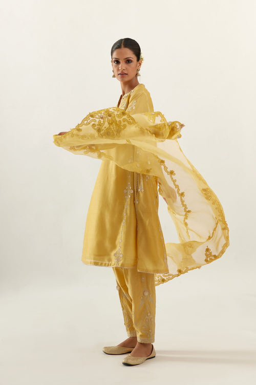 Yellow organza dupatta with silk chanderi appliqué embroidery and gota flower detail.